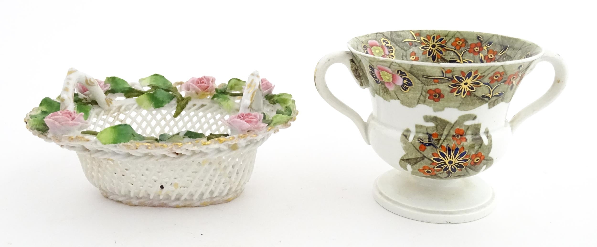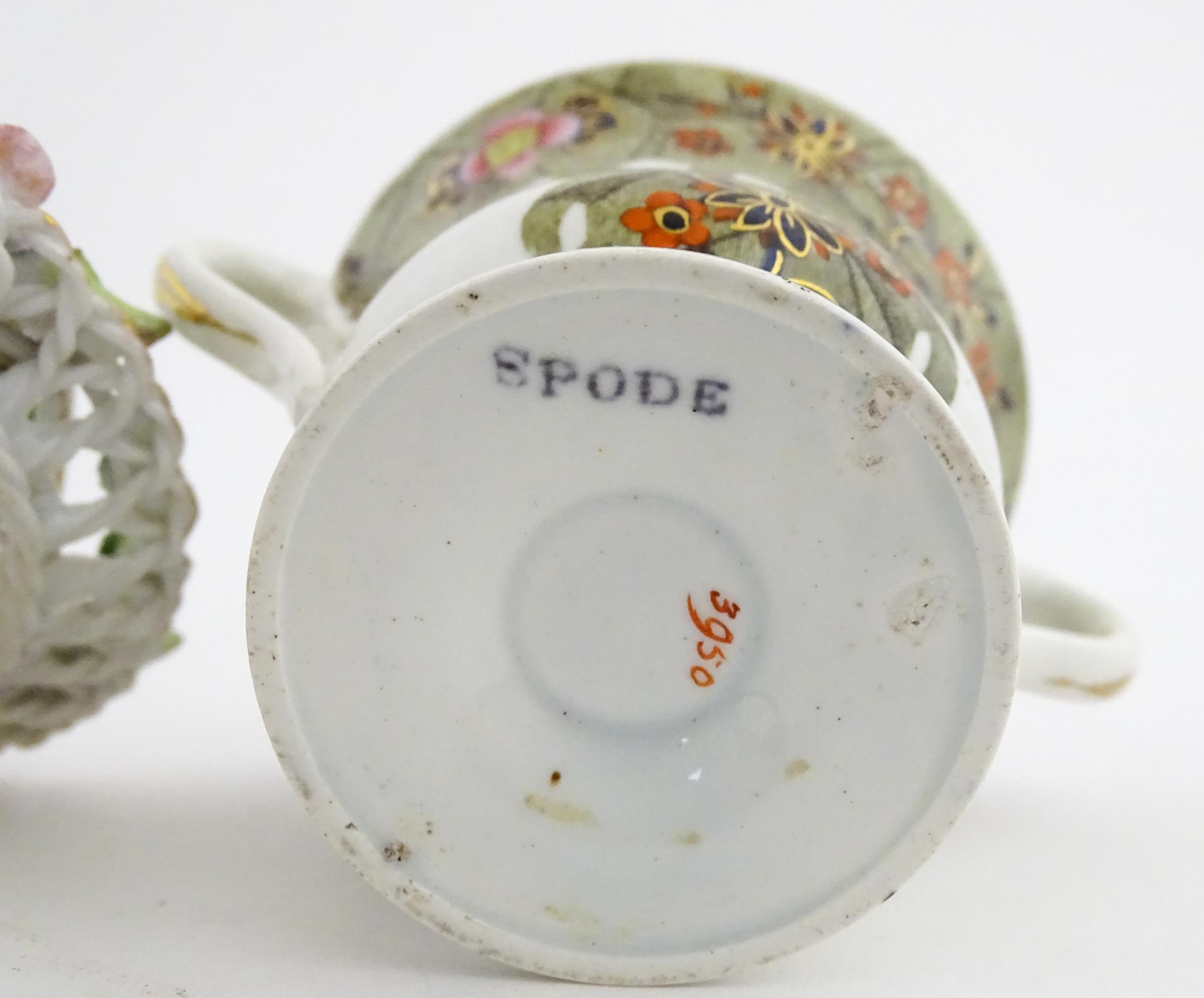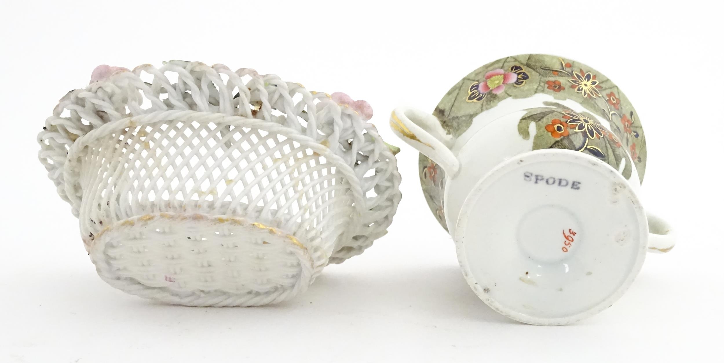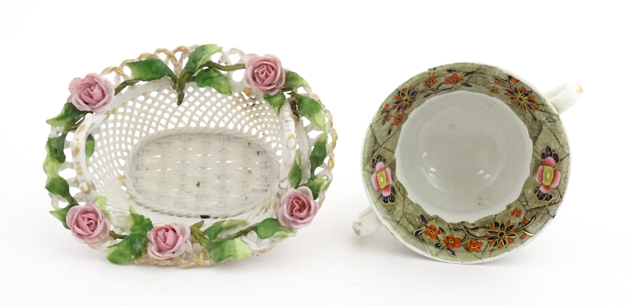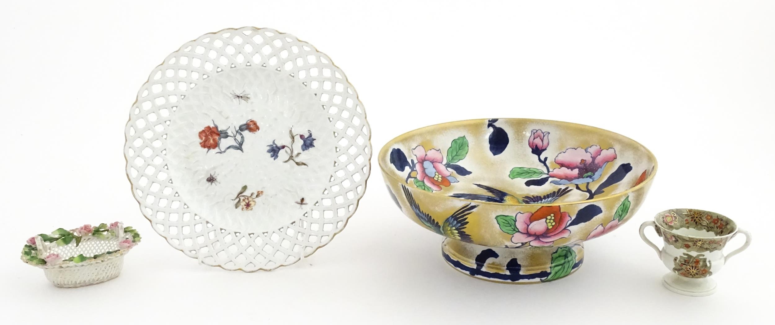 Assorted ceramics to include a Losol Ware footed bowl decorated in the Old Tree pattern, a German plate with pierced rim and floral detail, a small twin handled basket with encrusted flower detail and a Spode twin handled up. Bowl approx. 10 1/2" wide (4)