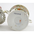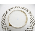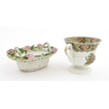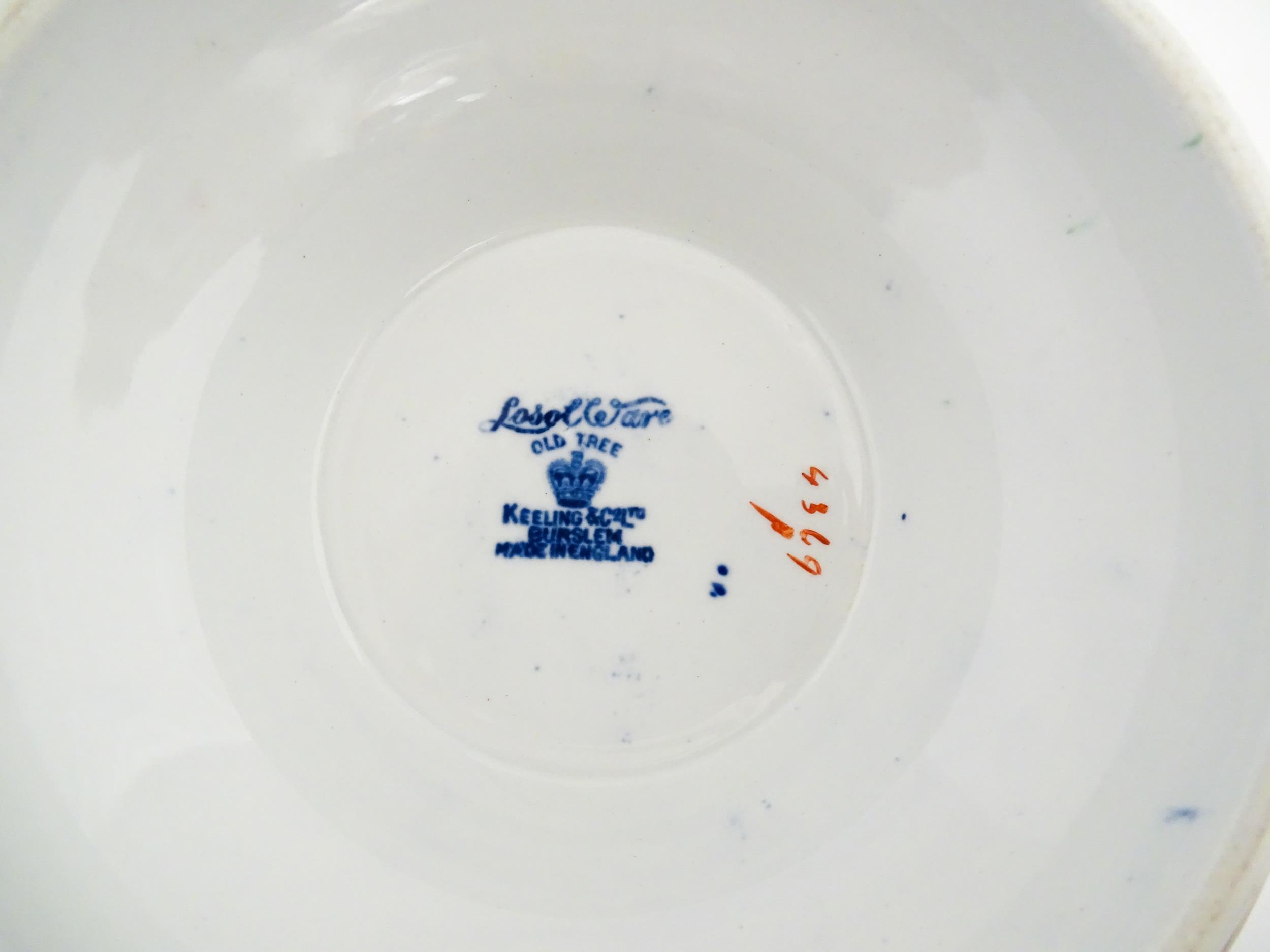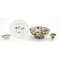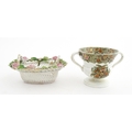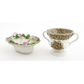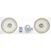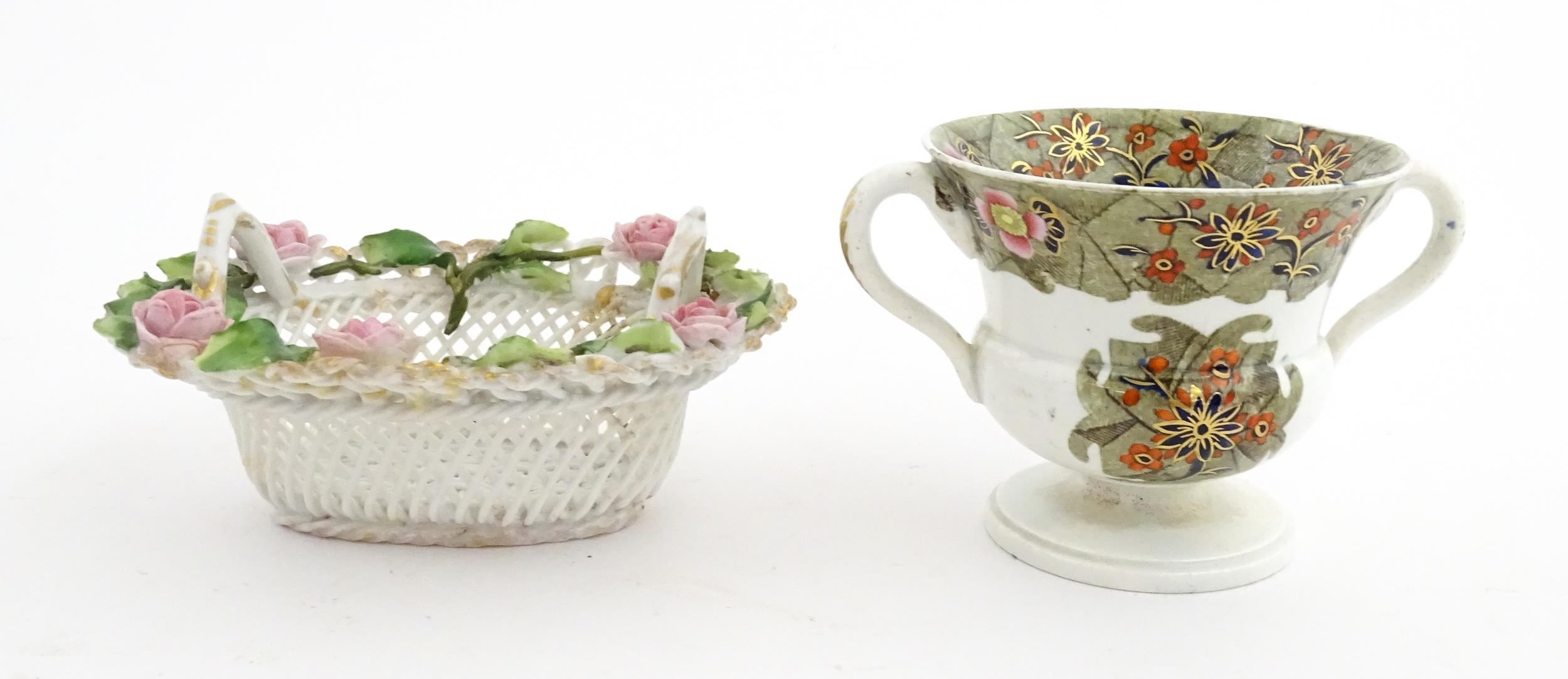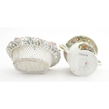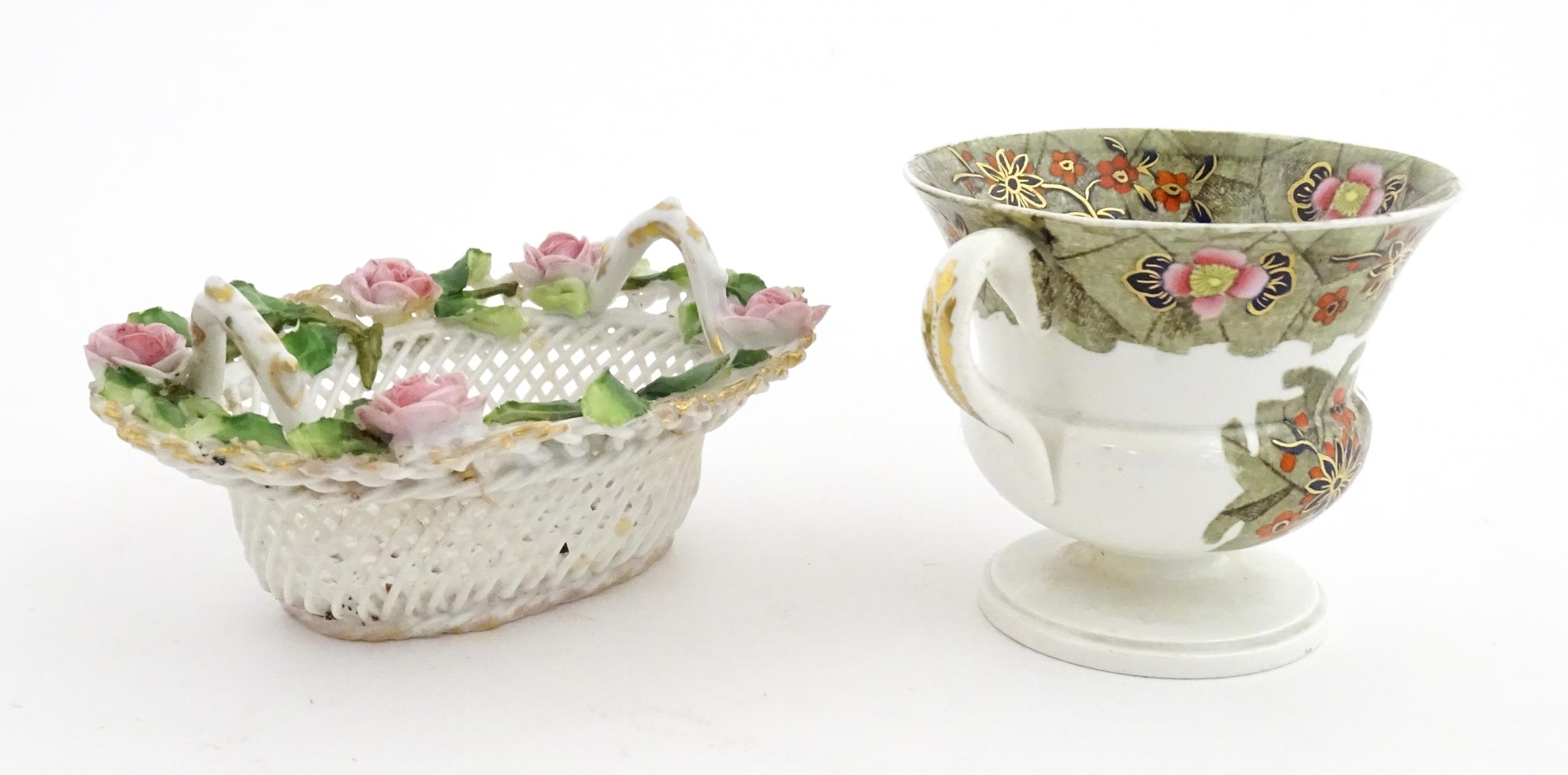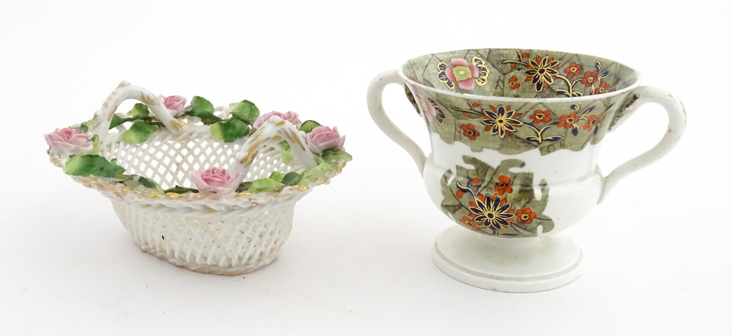 Assorted ceramics to include a Losol Ware footed bowl decorated in the Old Tree pattern, a German plate with pierced rim and floral detail, a small twin handled basket with encrusted flower detail and a Spode twin handled up. Bowl approx. 10 1/2" wide (4)