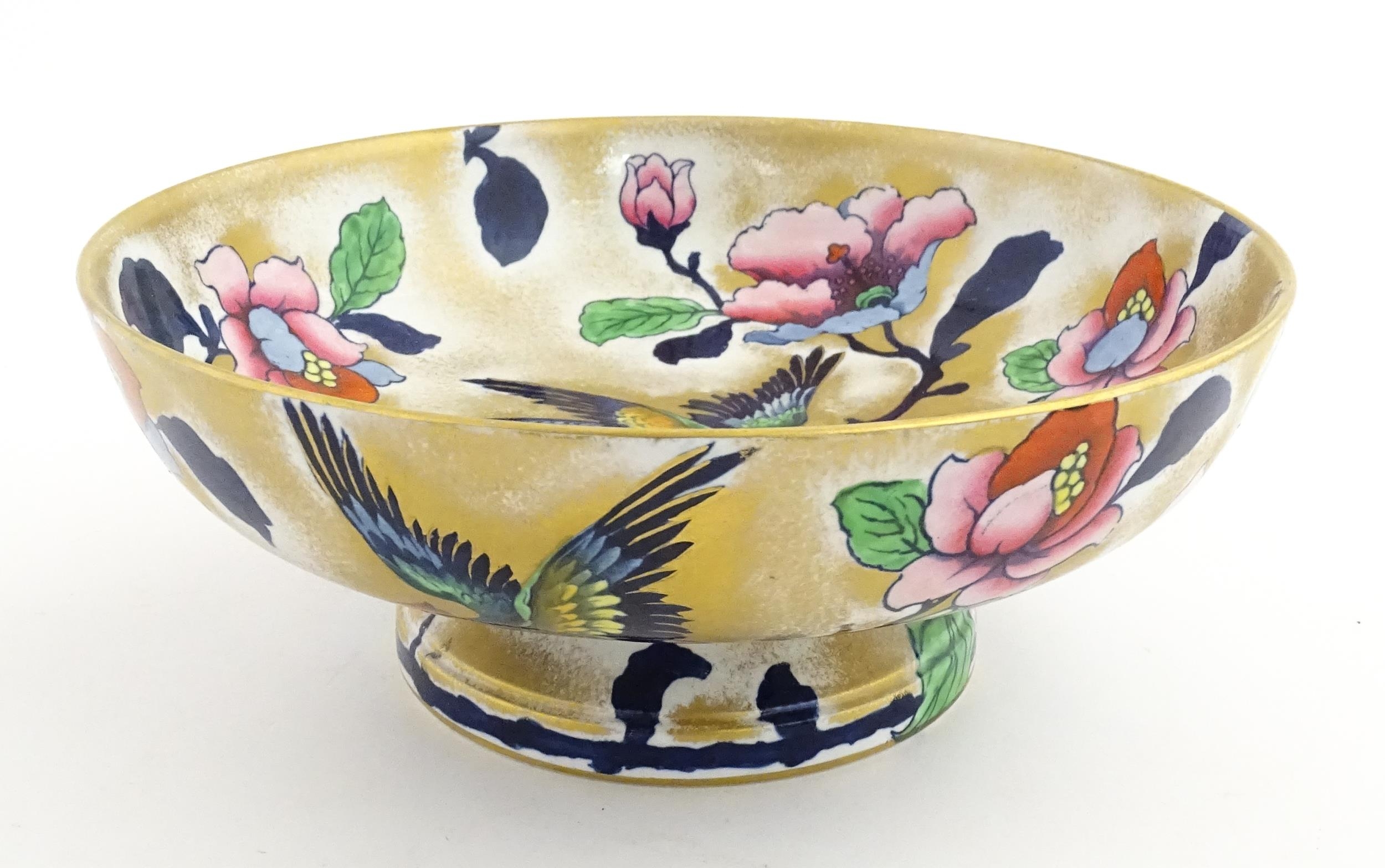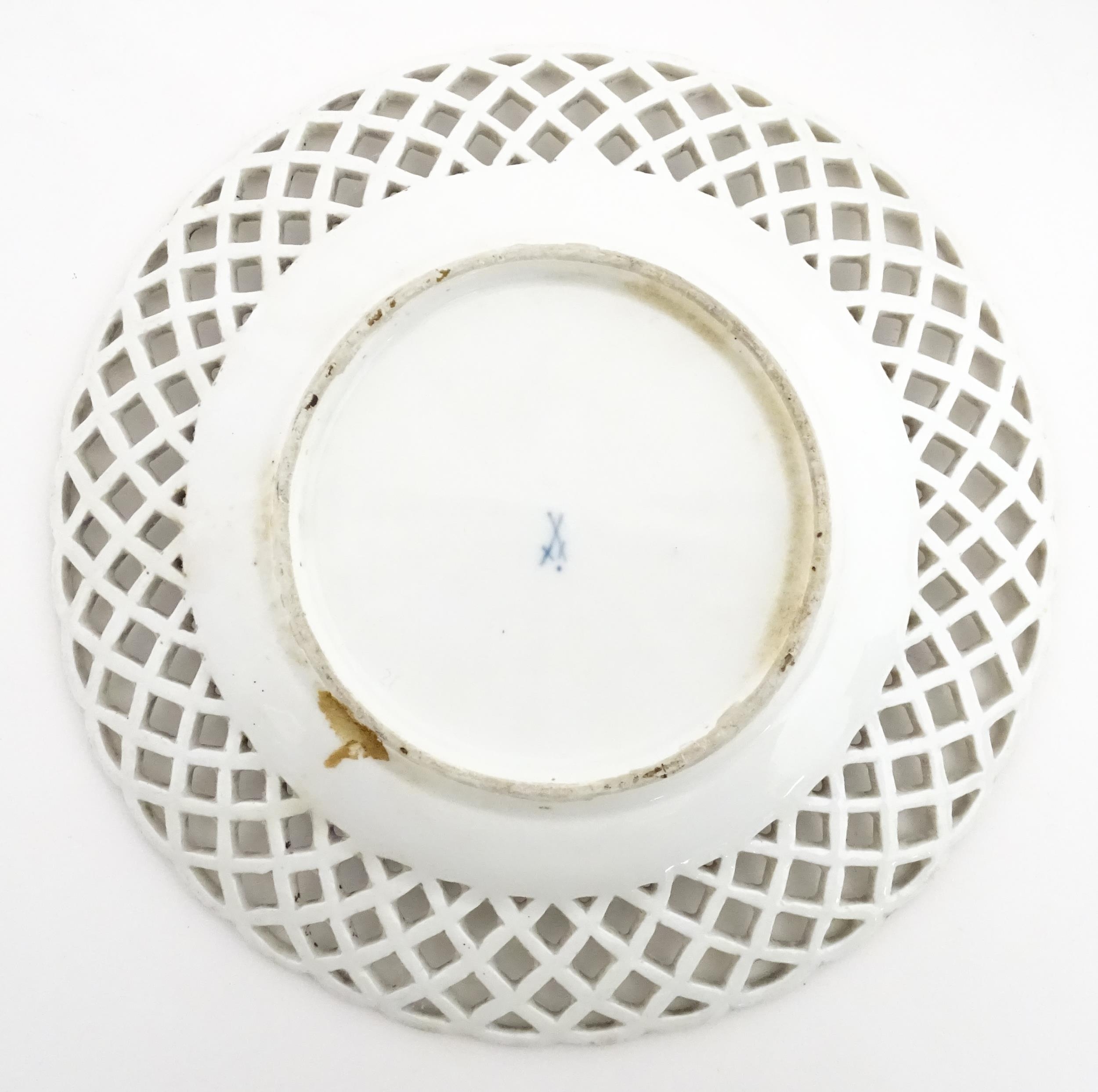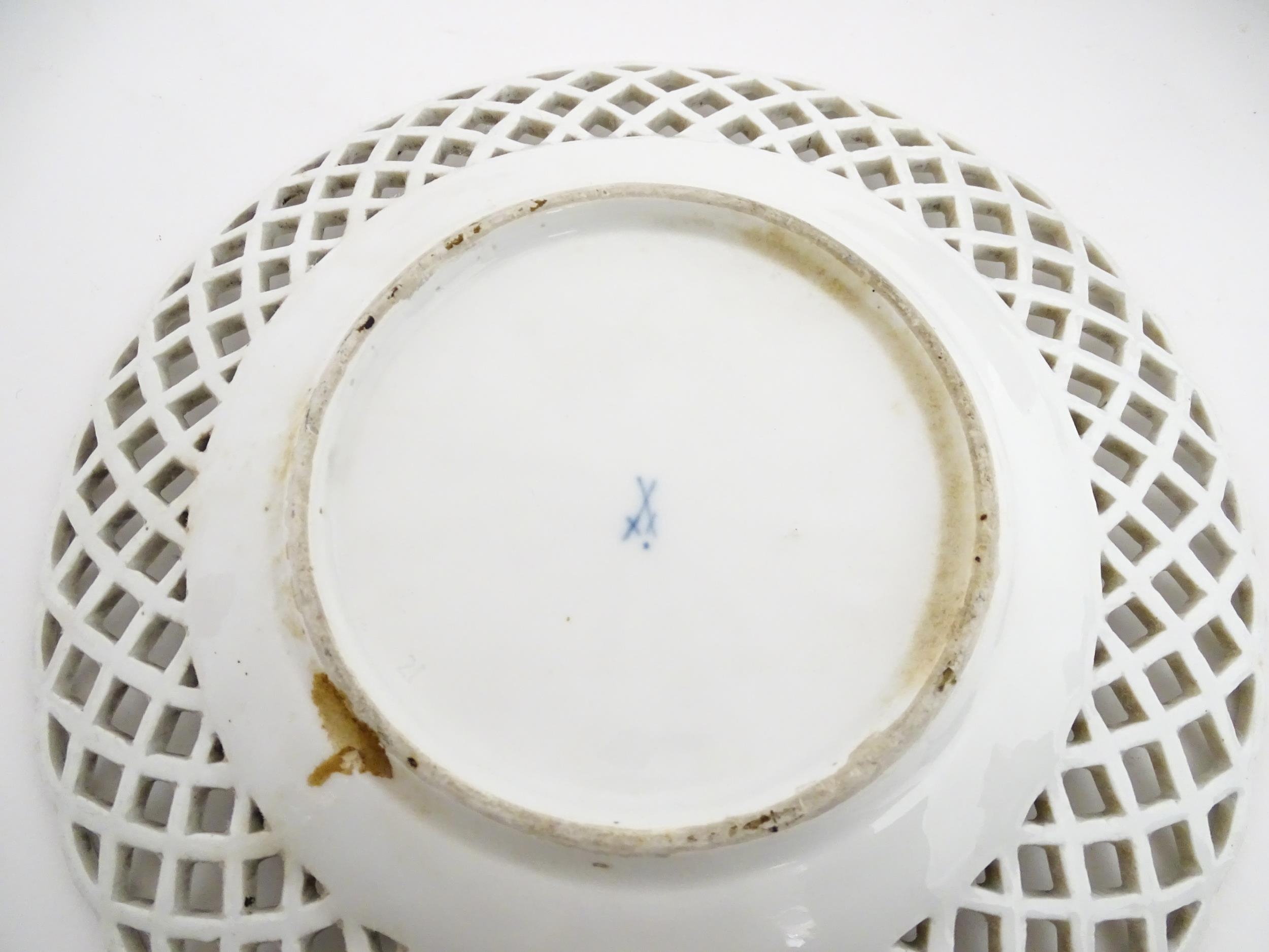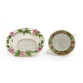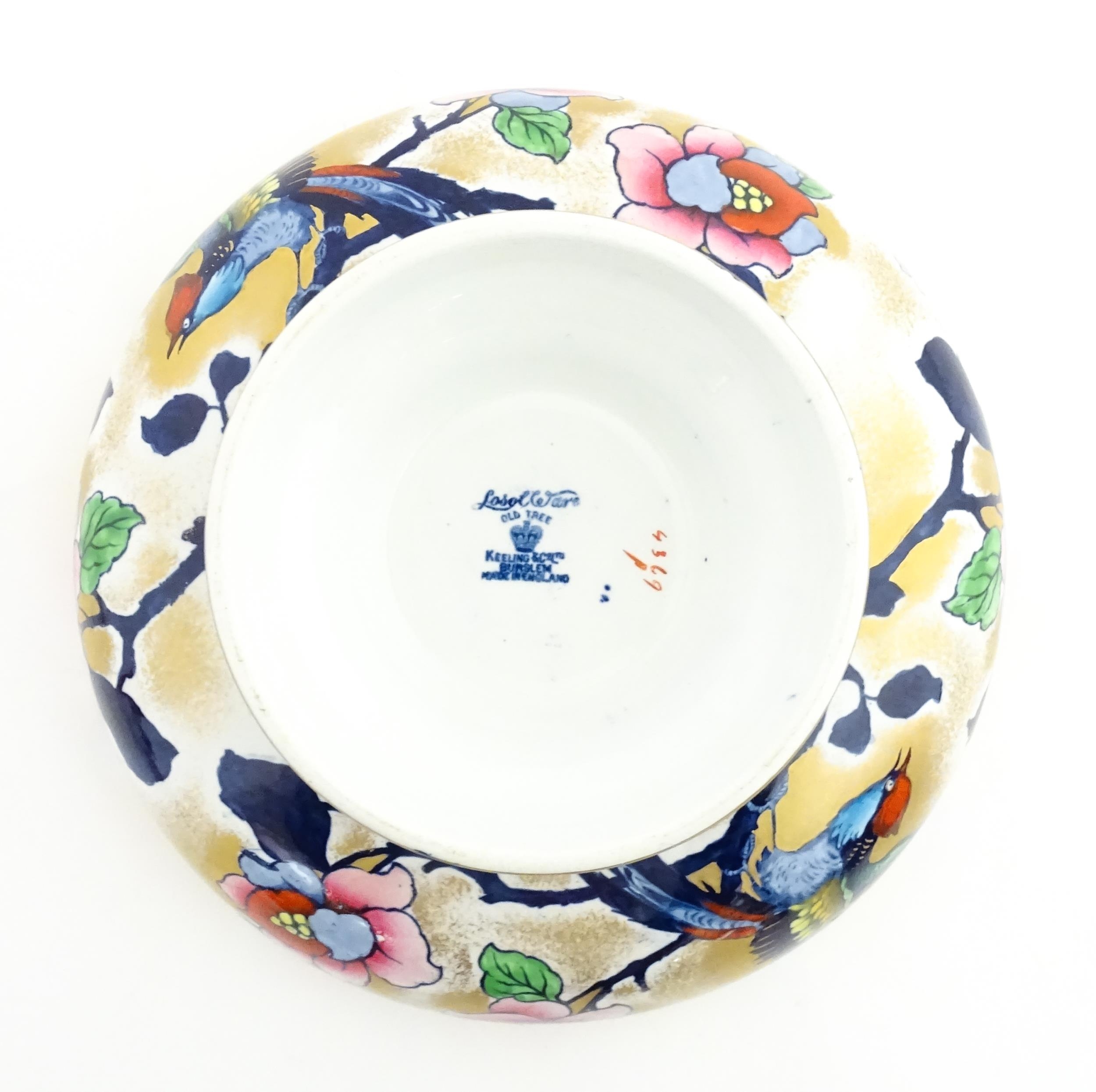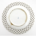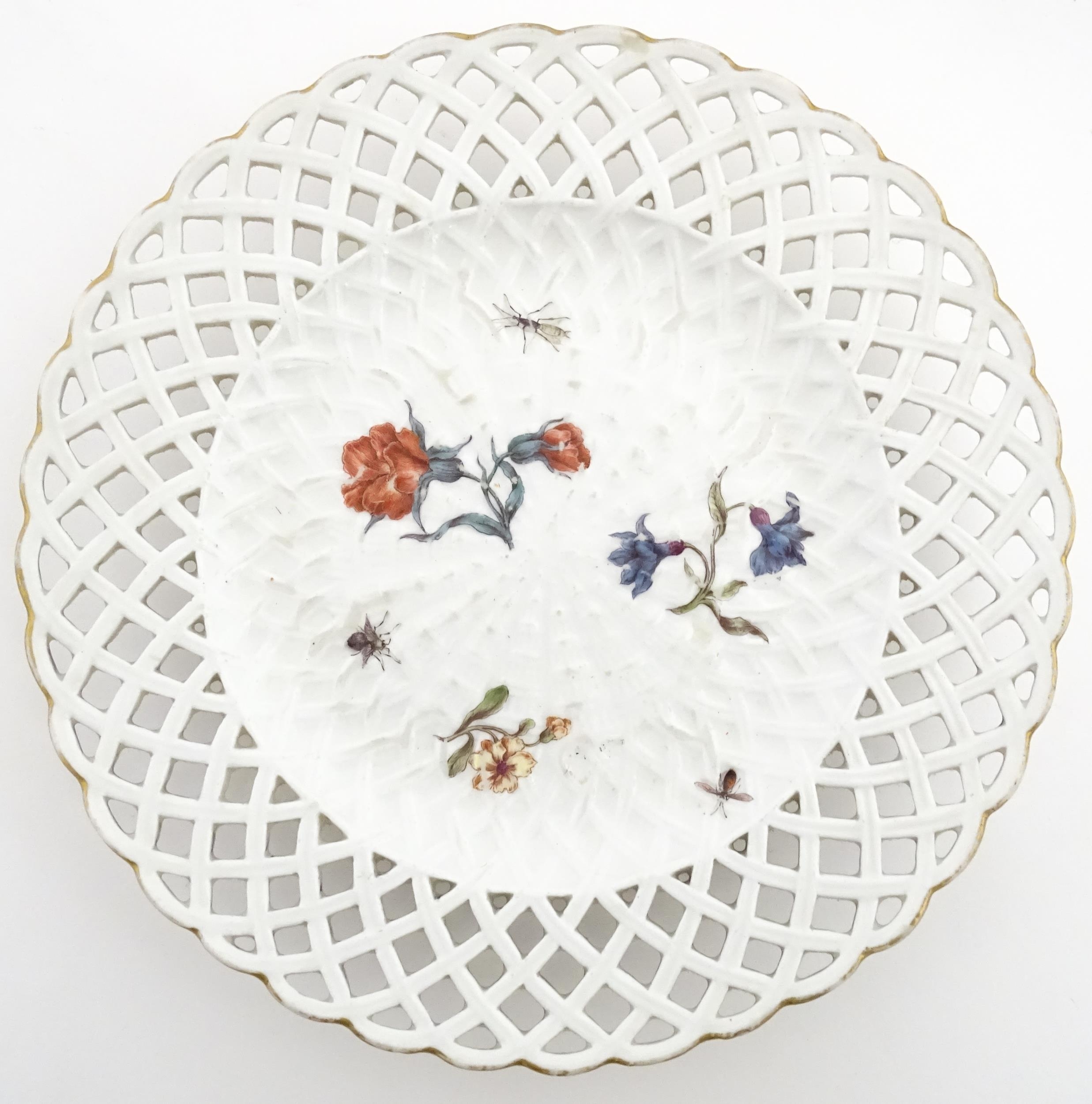 Assorted ceramics to include a Losol Ware footed bowl decorated in the Old Tree pattern, a German plate with pierced rim and floral detail, a small twin handled basket with encrusted flower detail and a Spode twin handled up. Bowl approx. 10 1/2" wide (4)