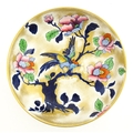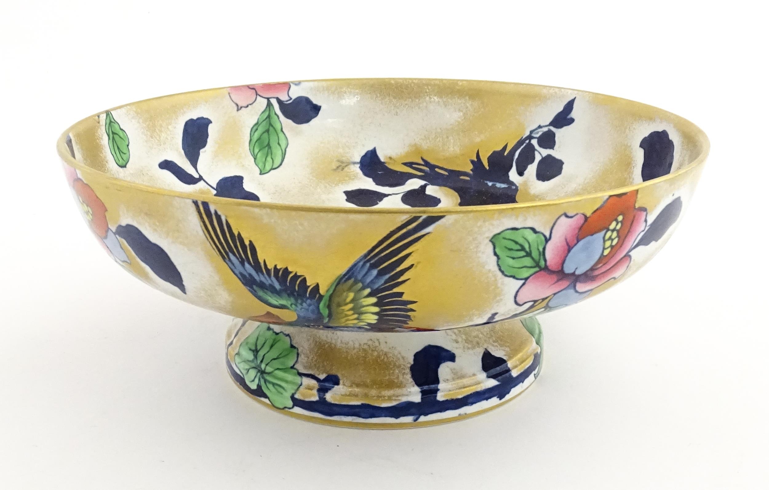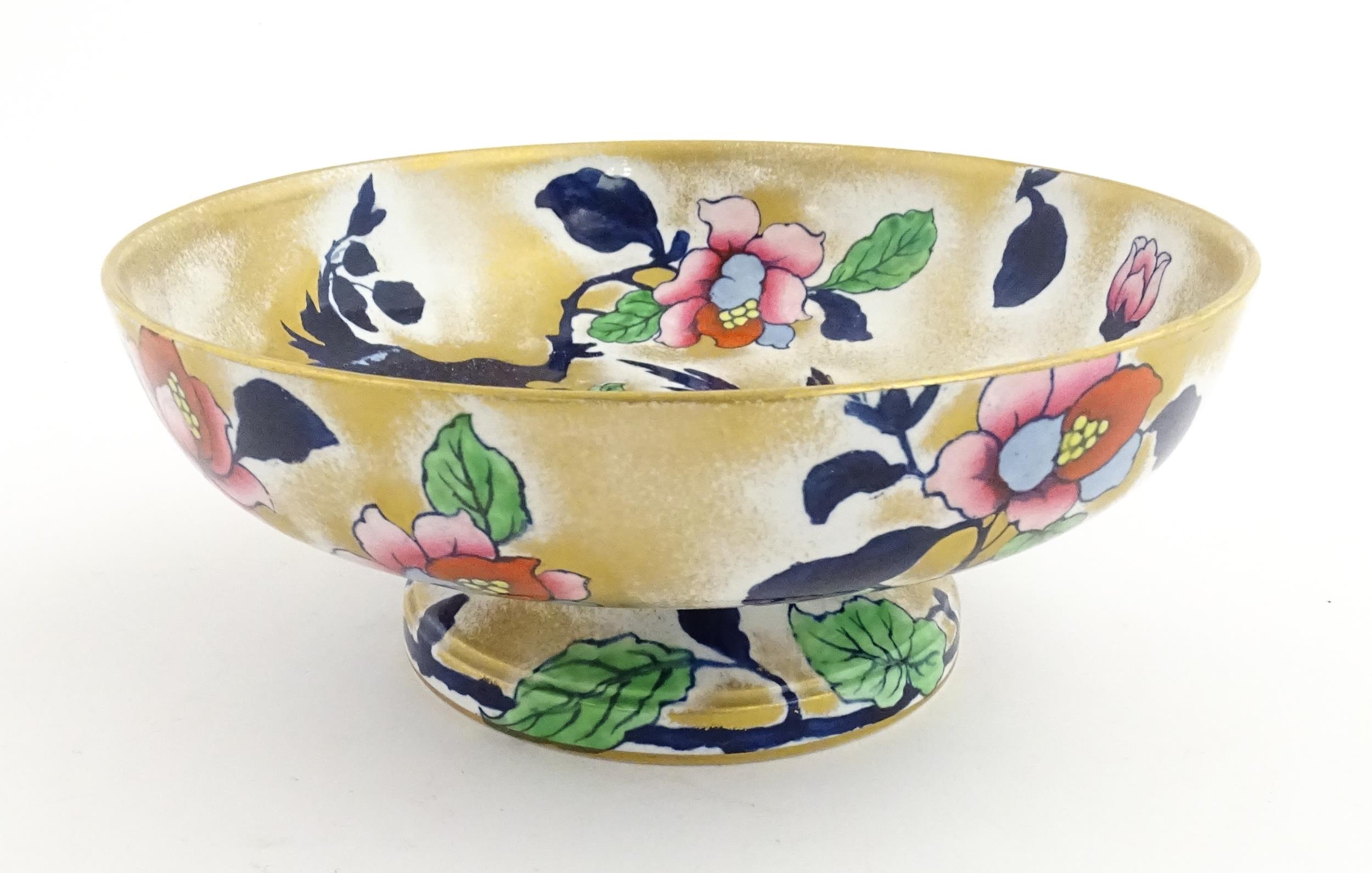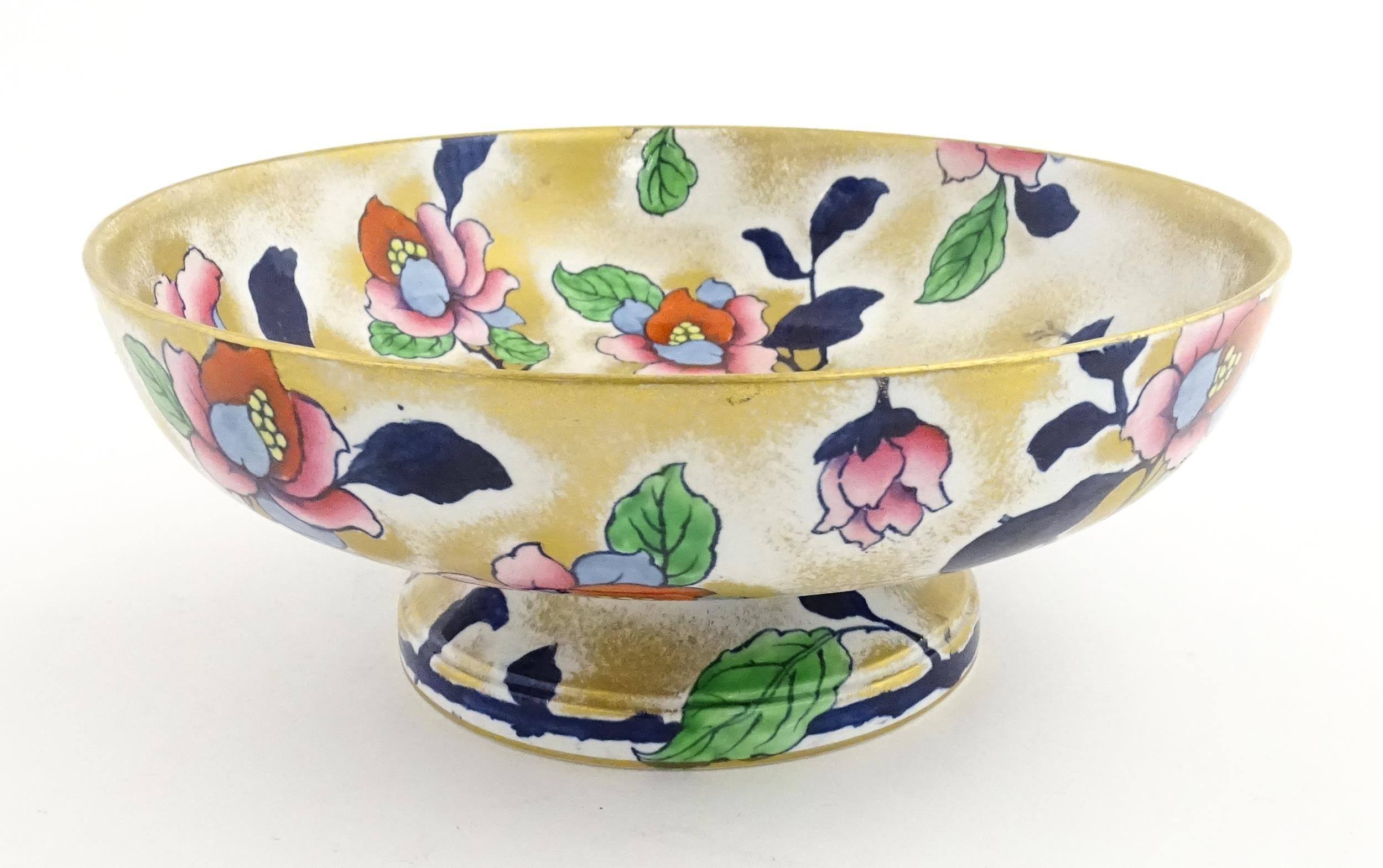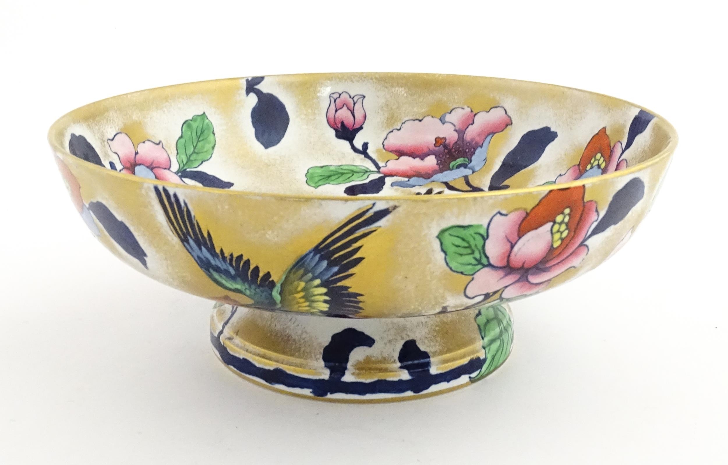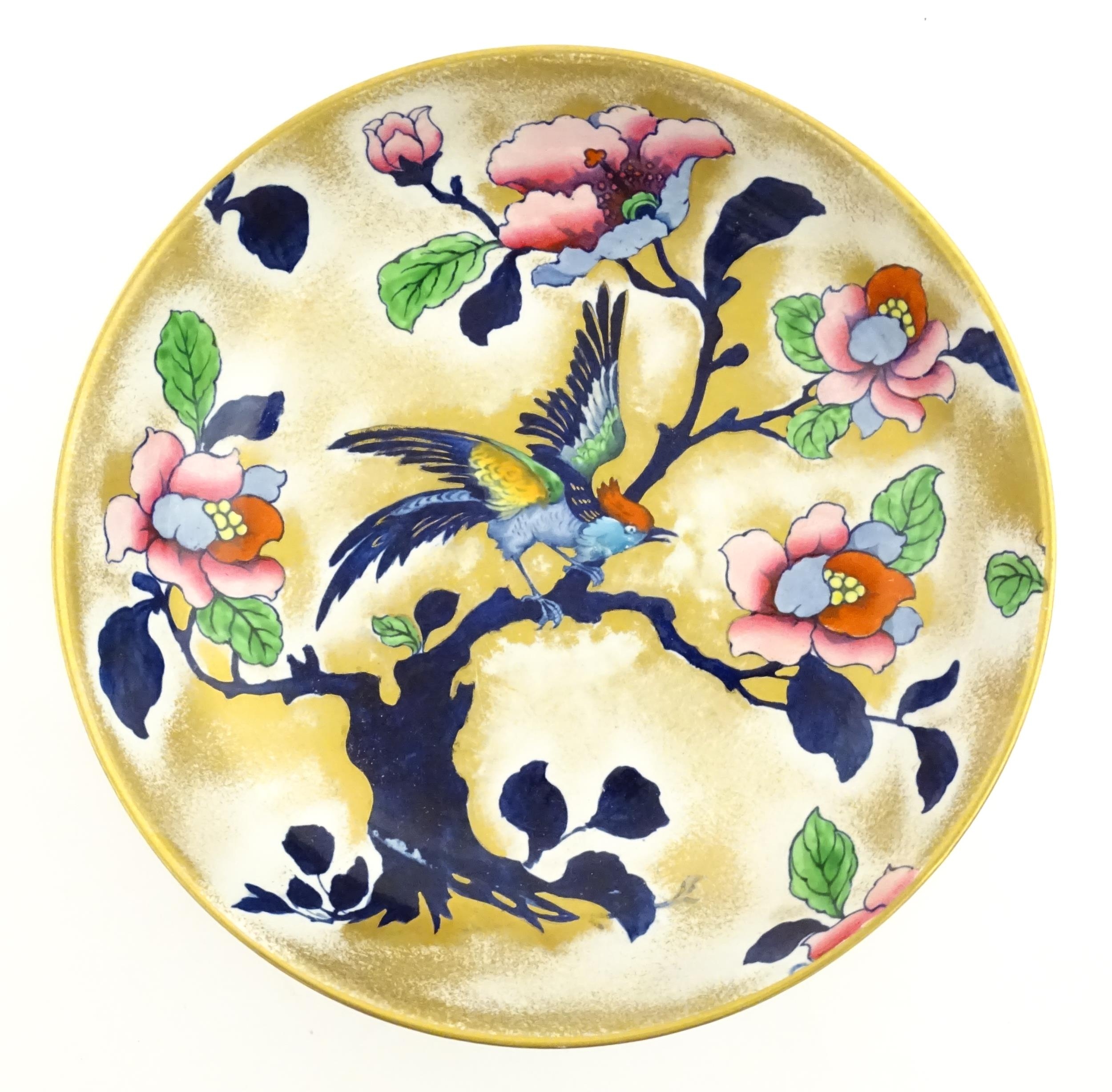 Assorted ceramics to include a Losol Ware footed bowl decorated in the Old Tree pattern, a German plate with pierced rim and floral detail, a small twin handled basket with encrusted flower detail and a Spode twin handled up. Bowl approx. 10 1/2" wide (4)