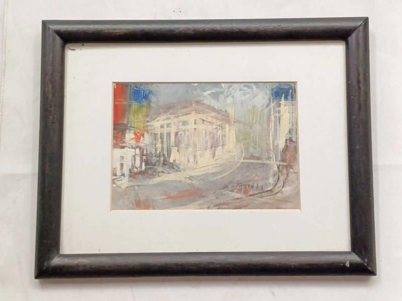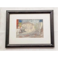 ANGELA HUGHES PICCADILLY CIRCUS LABEL TO REVERSE FRAMED WATERCOLOUR 13CM X 19CM