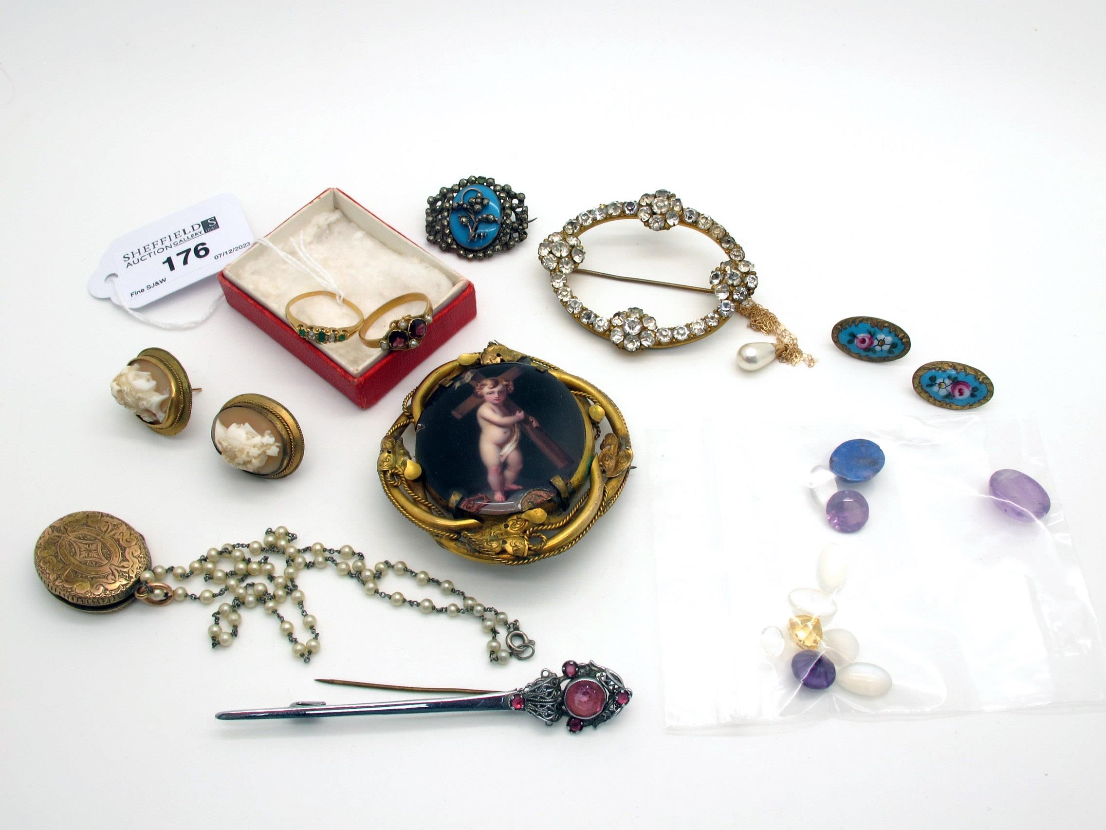 An Antique Dainty Emerald and Diamond Five Stone Ring, (misshapen) a large Victorian oval locket back mourning brooch, a pair of oval shell carved cameo earrings, each depicting female profile, further vintage brooches, oval locket pendant, unmounted cabochon stones, further ring, etc.