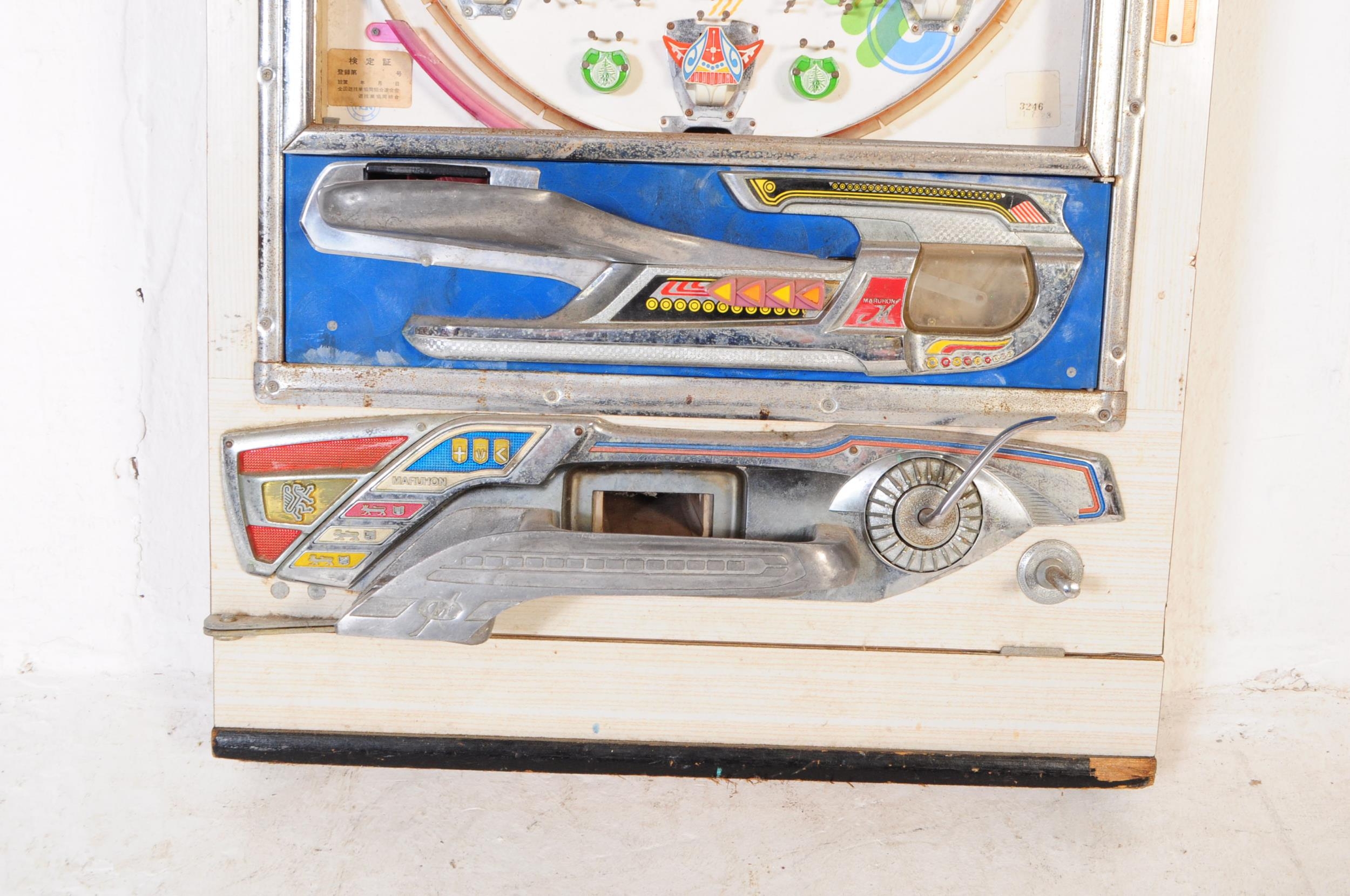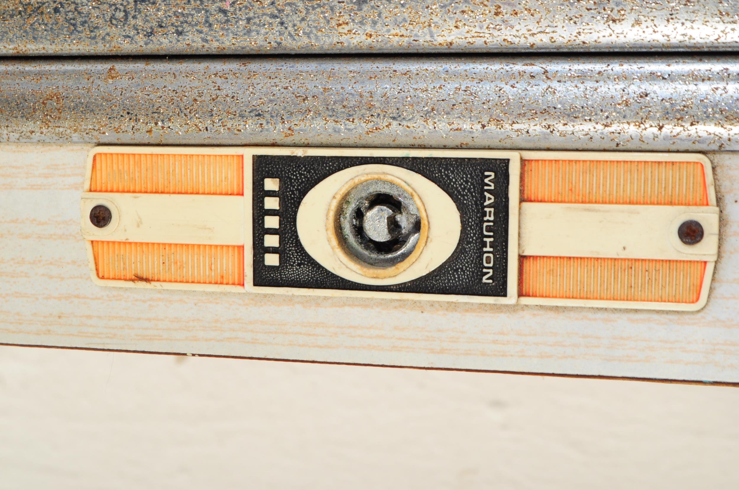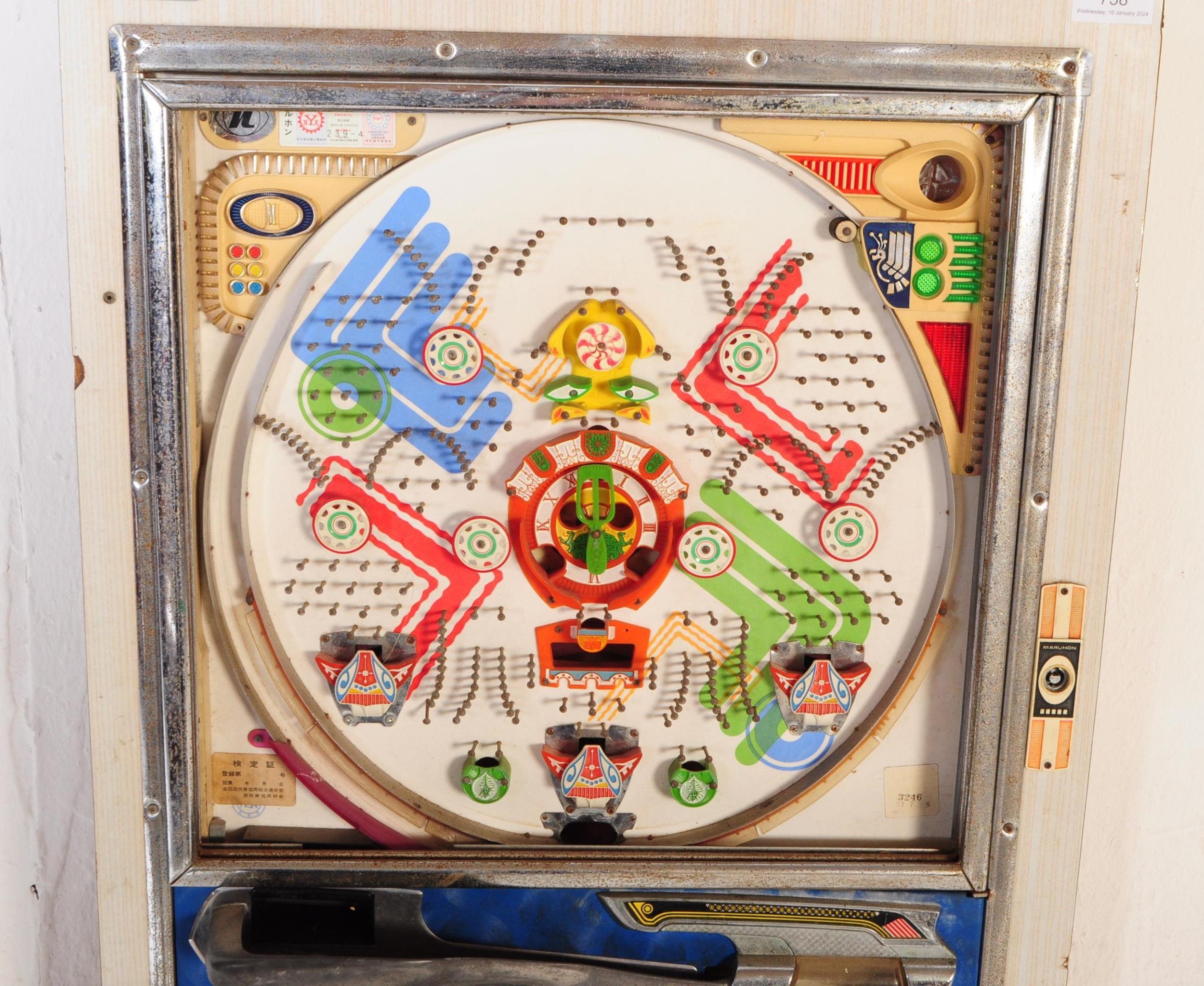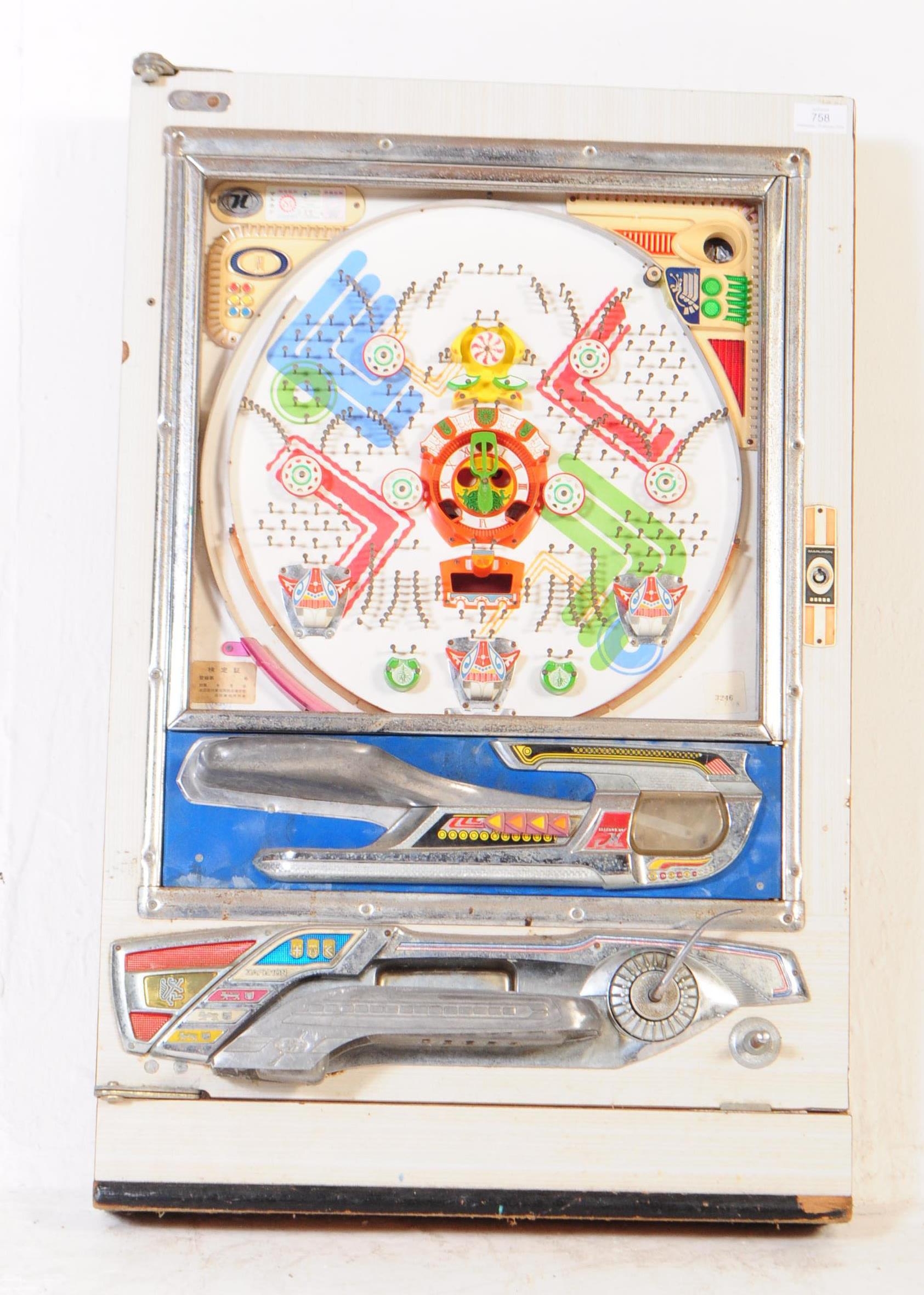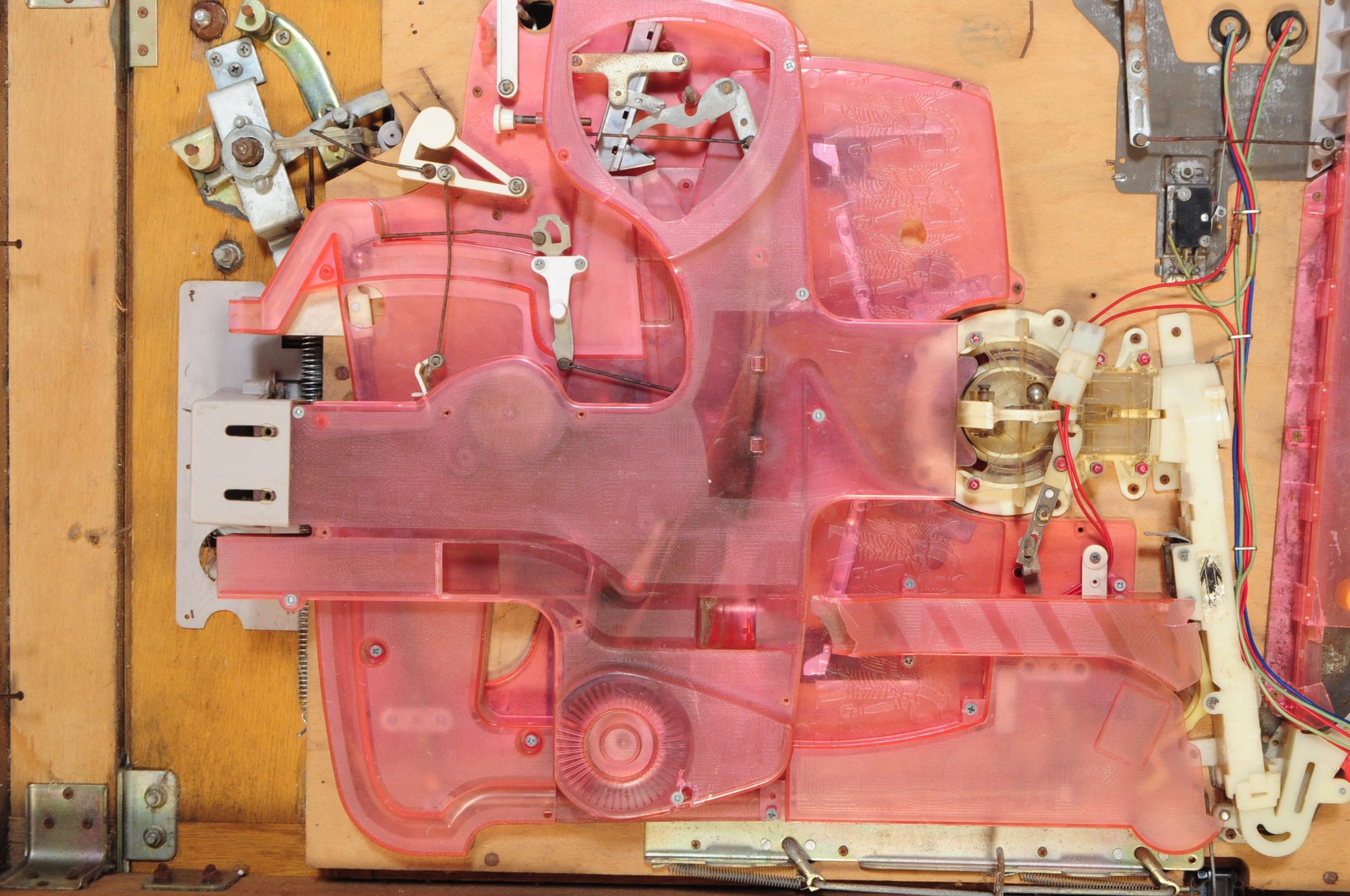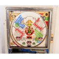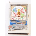 An original 1960's retro amusement arcade glass pinball machine. Colourful artwork decoration with stainless steel surround and fittings with a clear central square glass viewing pane. Measures 81 x 52 x 13 cm.