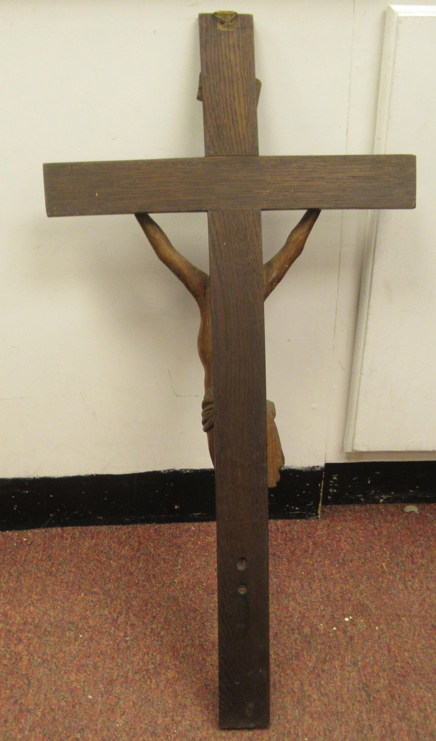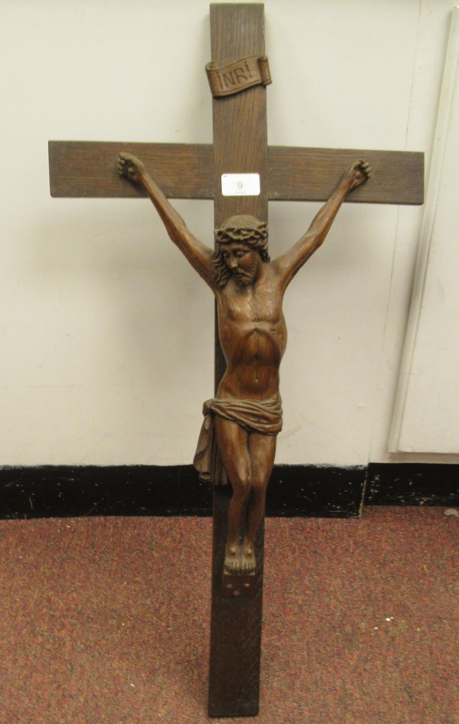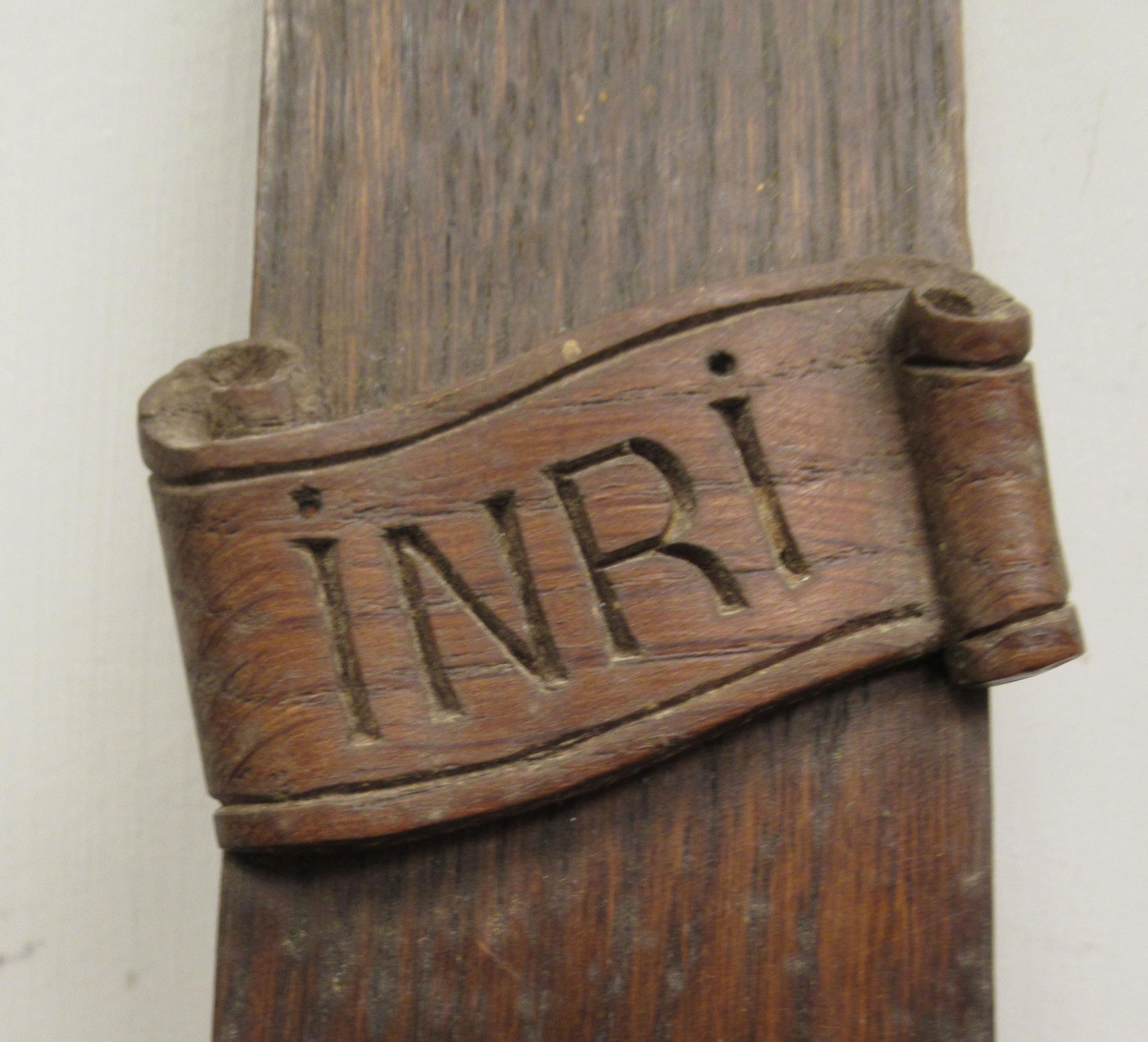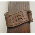 A late 19thC carved oak crucifix, a banner on the cross, inscribed 'RNRI' and inscribed L Verbeke 29"h overall