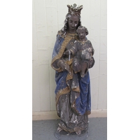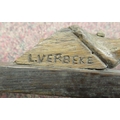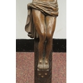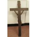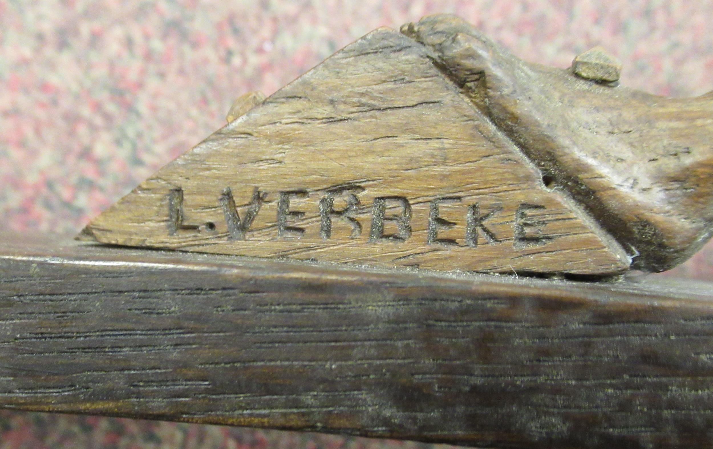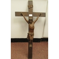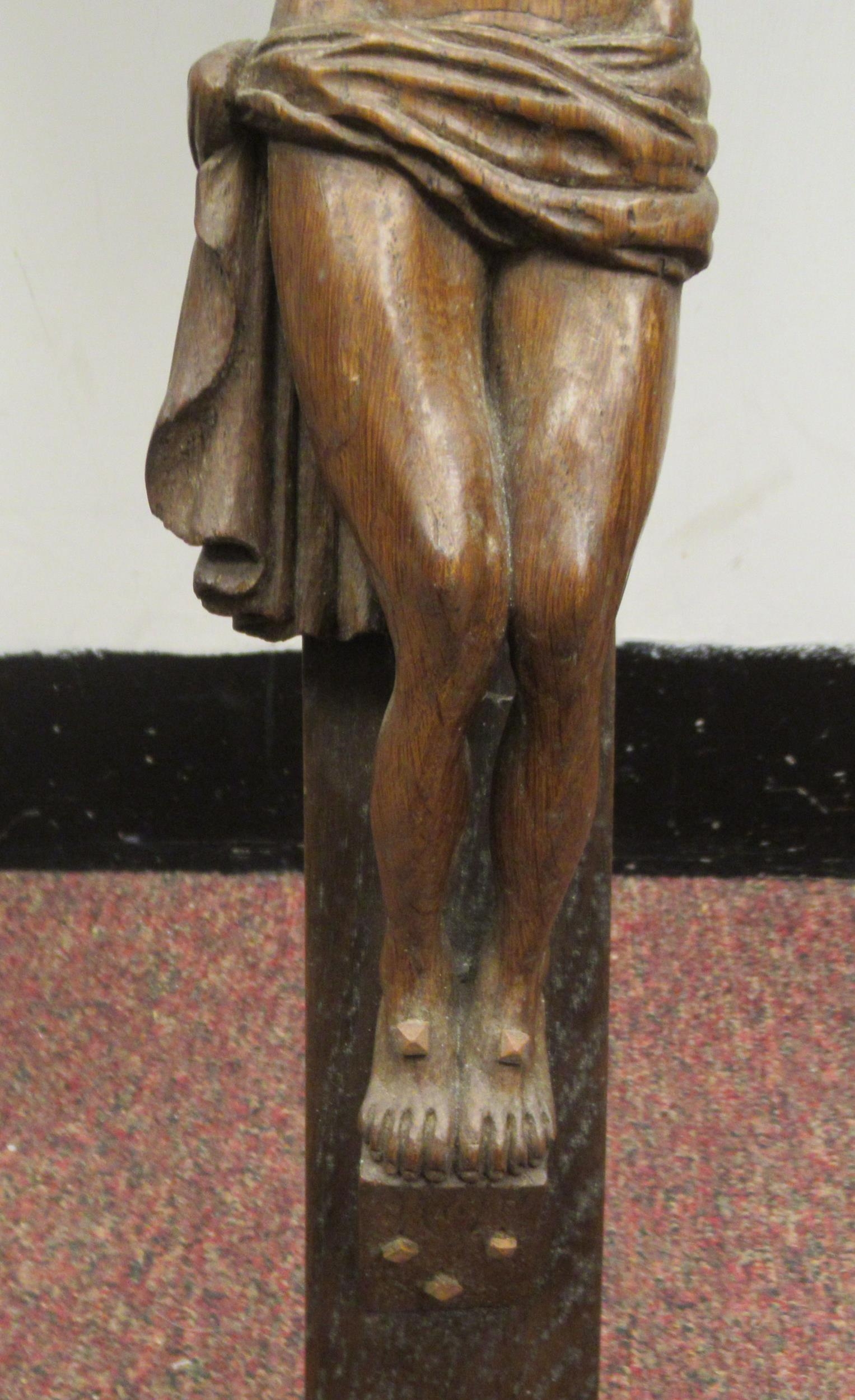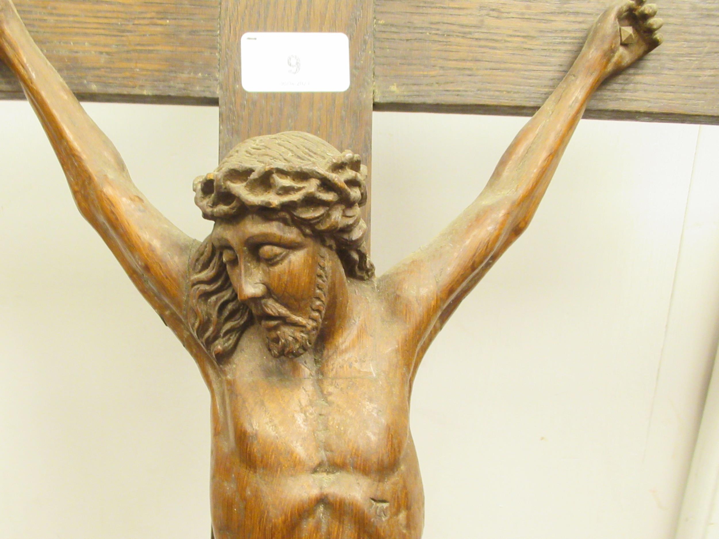 A late 19thC carved oak crucifix, a banner on the cross, inscribed 'RNRI' and inscribed L Verbeke 29"h overall