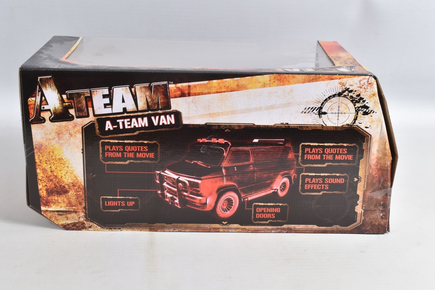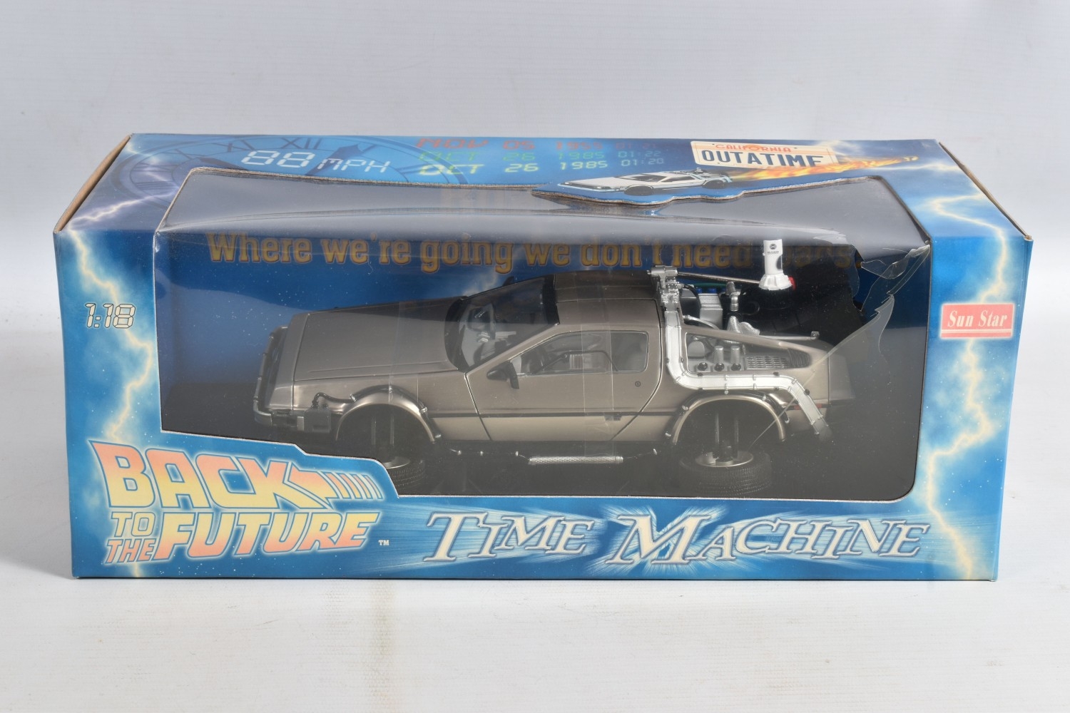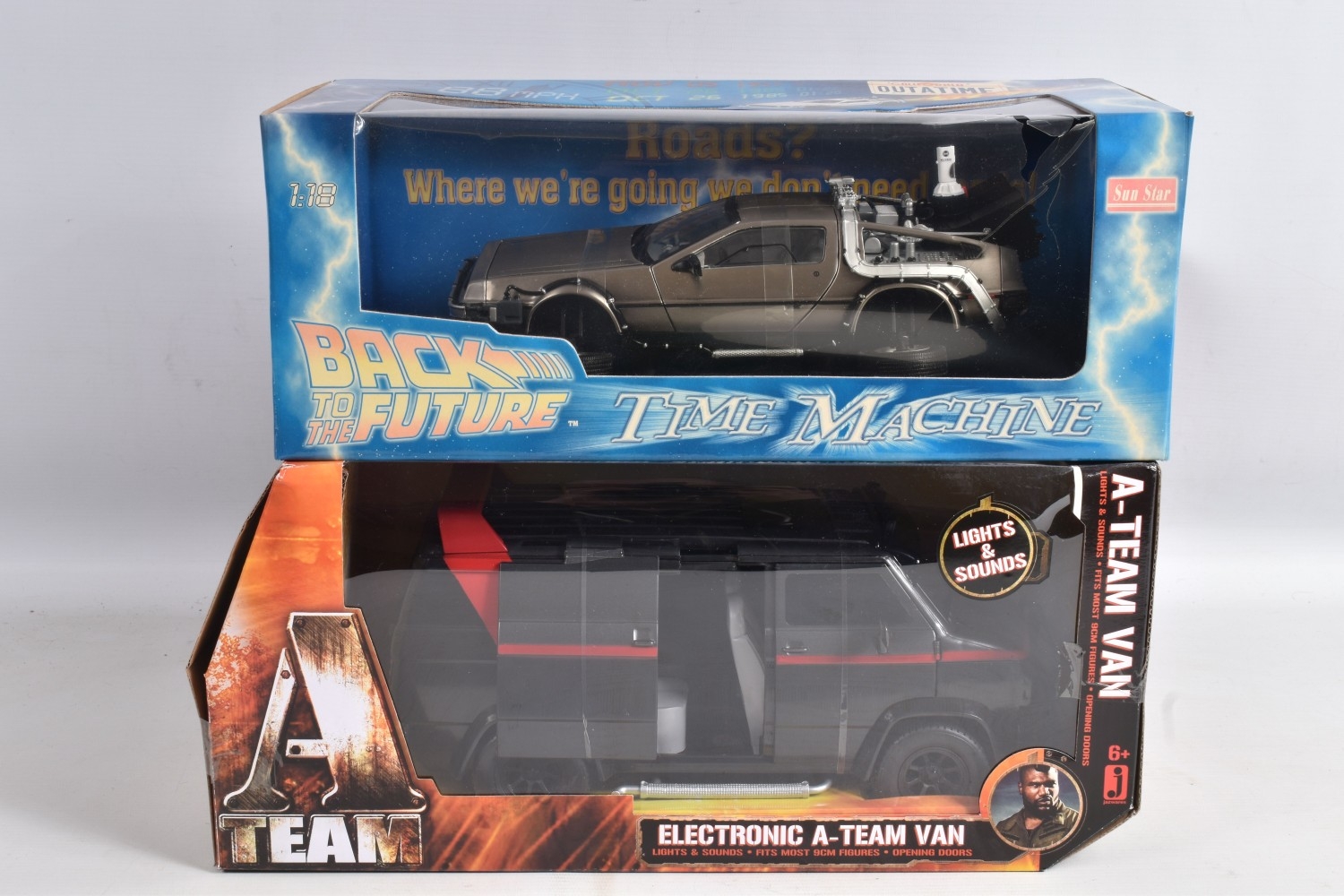TWO BOXED FILM RELATED MODEL VEHICLES, the first a Tomy A Team electronic van, no. 71467, box still sealed, dust to top, the second a diecast Sun Star Back to the Future Time Machine, 1:18 scale, no. 2710, model appears new and never out of the box, but plastic window damaged with a hole