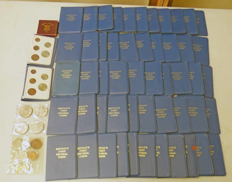 54 BRITAINS FIRST DECIMAL COINS SETS, 1953 9 - COIN SET, 1951 GEORGE VI FESTIVAL OF BRITAIN CROWN, BOXED AND 4 COMMEMORATIVE CROWNS