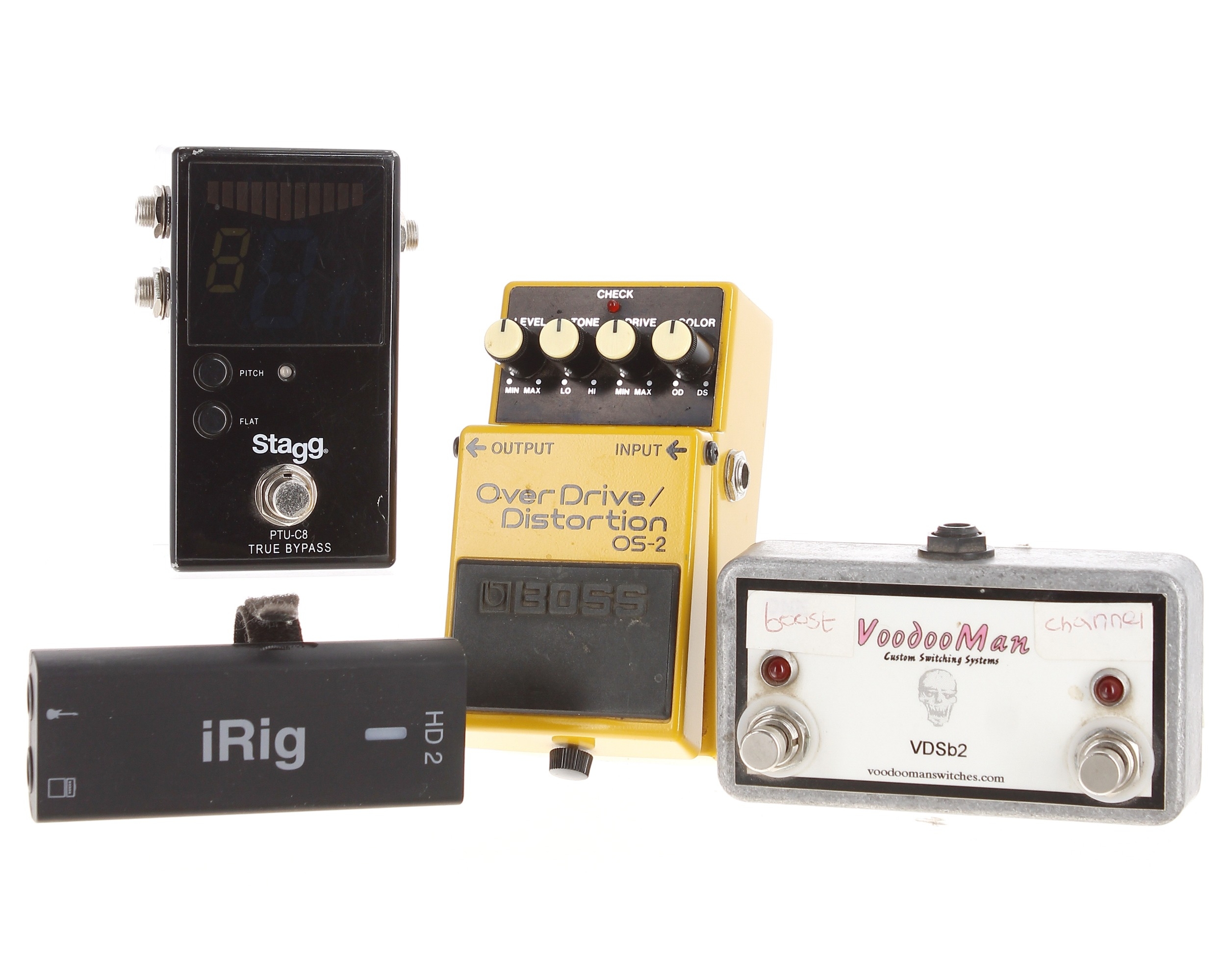 Boss OS-2 Overdrive/Distortion guitar pedal; together with a Stagg PTU-C8 True Bypass guitar pedal, a Voodoo Man Switches VDSB2 footswitch and an Amplitube iRig HD2 USB guitar interface (4)