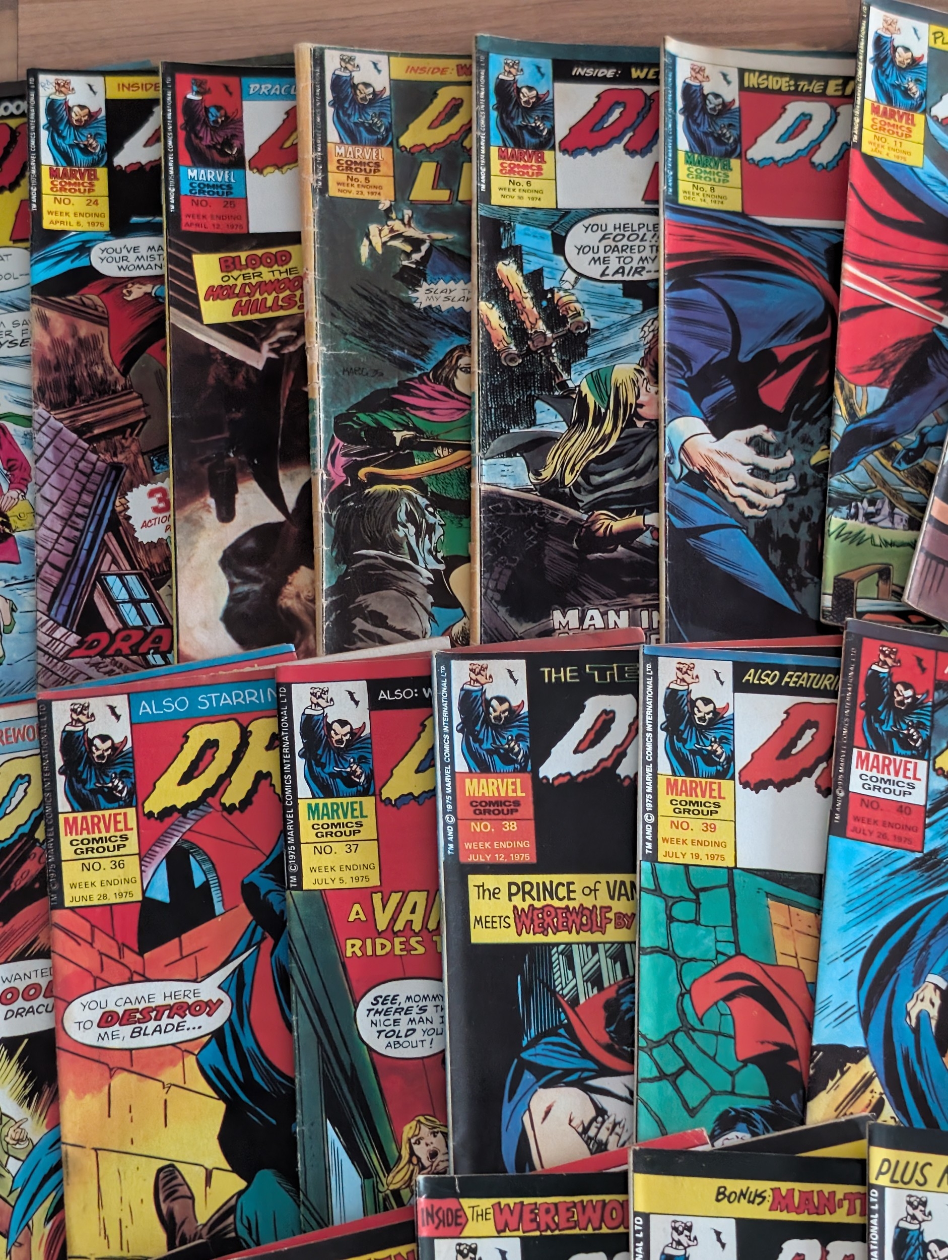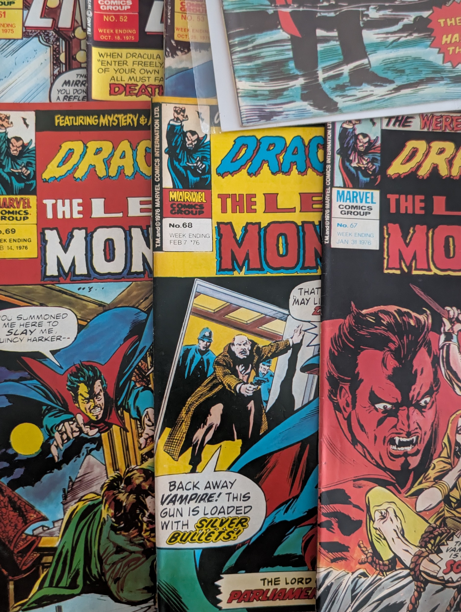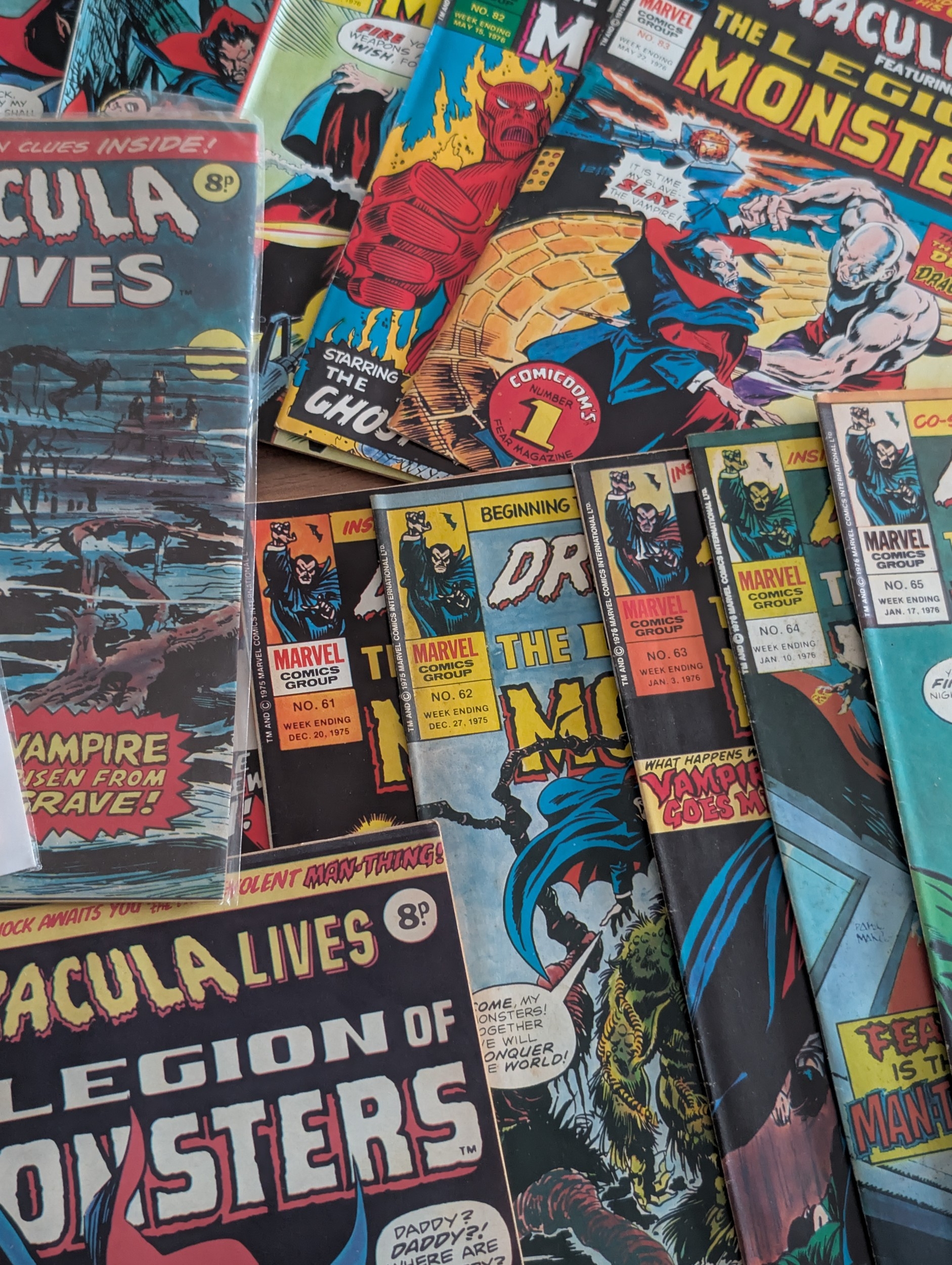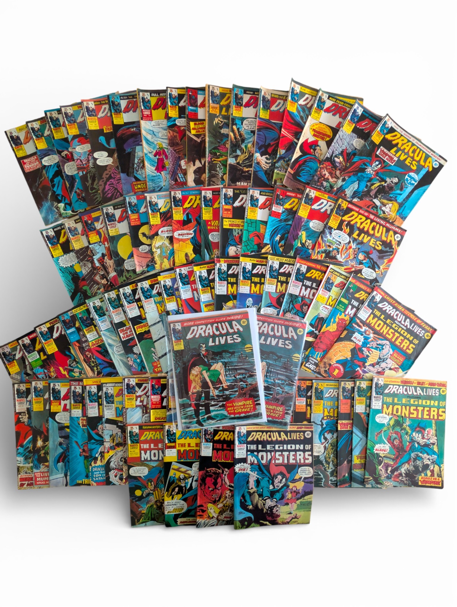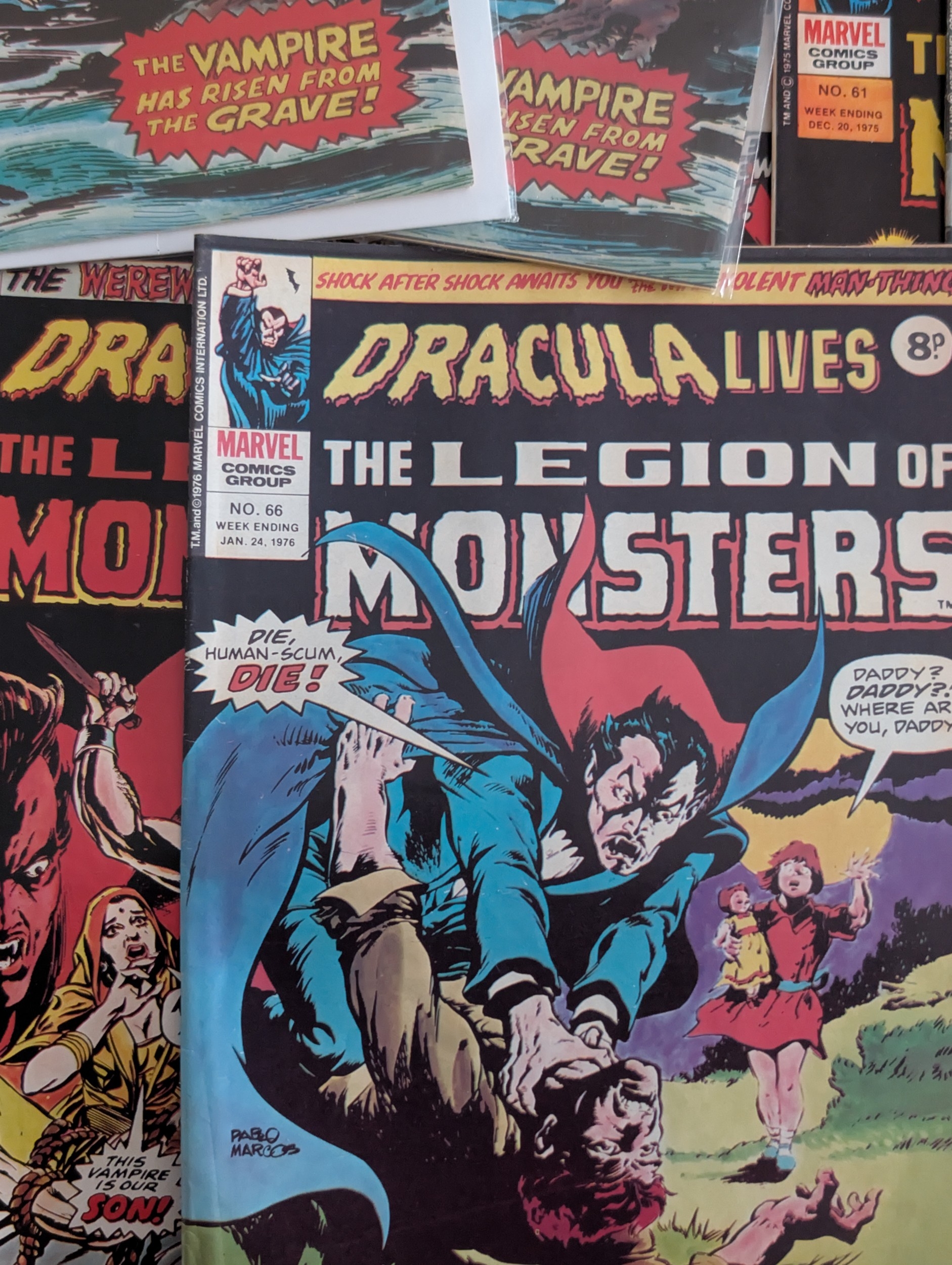 Marvel Comics – Dracula Lives! / Legion of Monsters, further extensive run, Marvel UK, mid- to late-1970s. Good selection of later issues with recurring horror themes and crossover content (Legion of Monsters, Blade, Werewolf by Night, Frankenstein’s Monster)