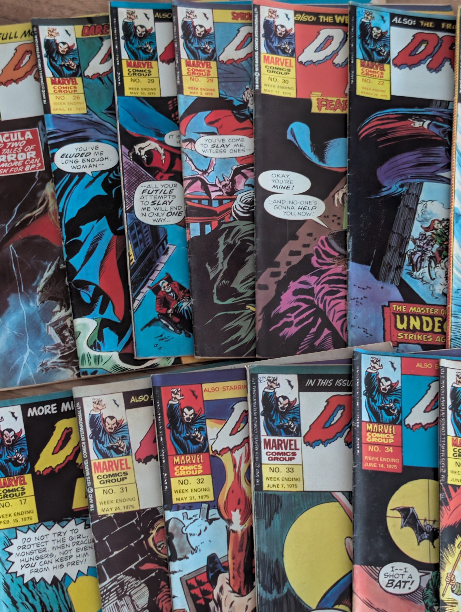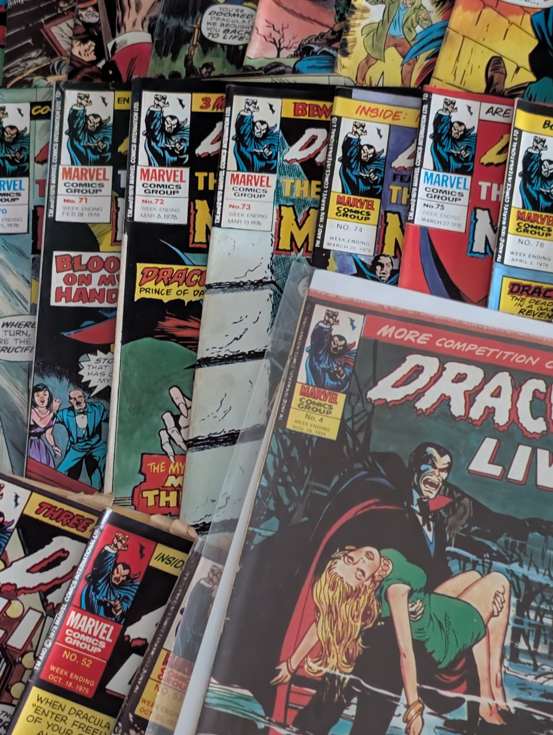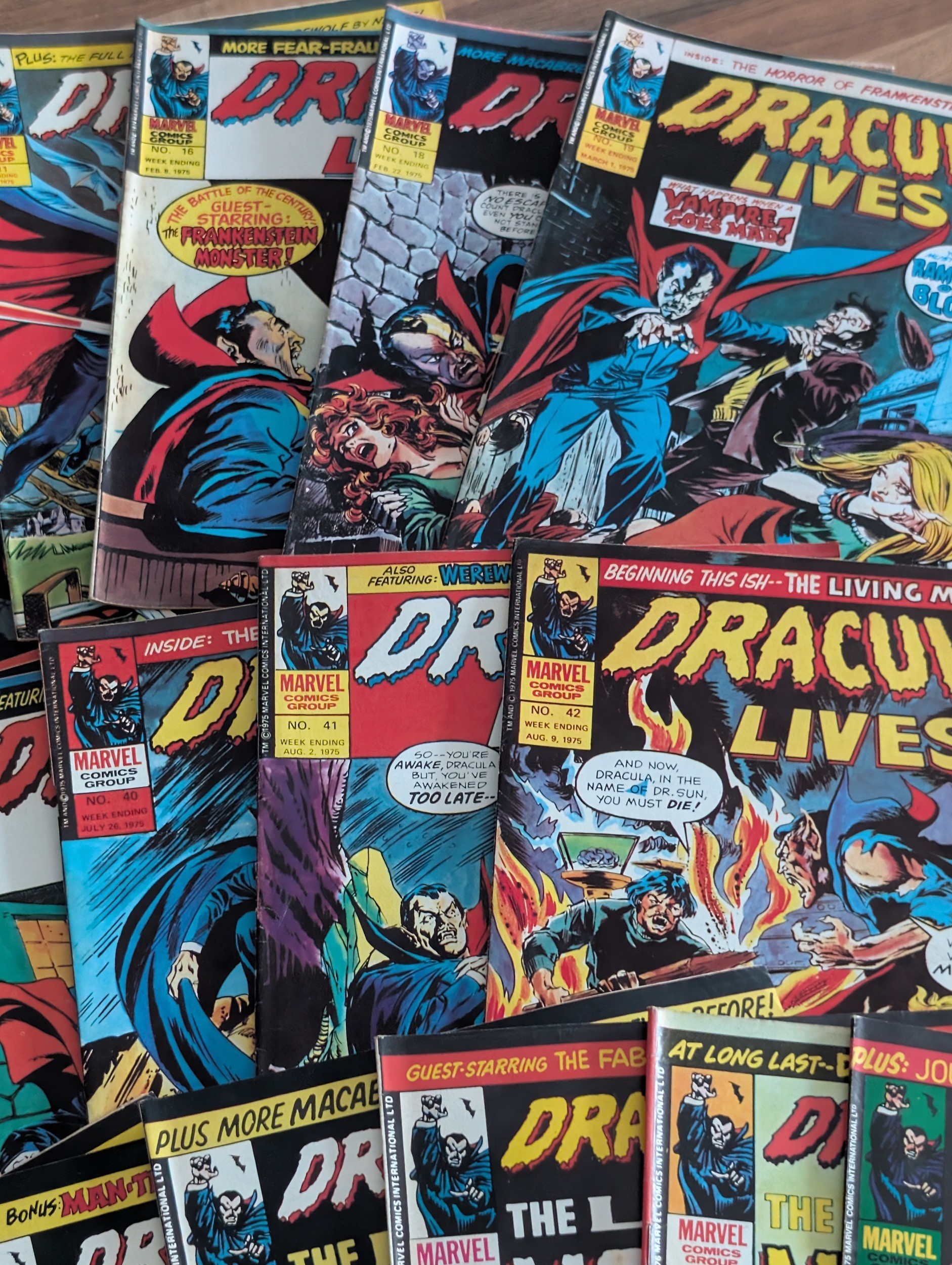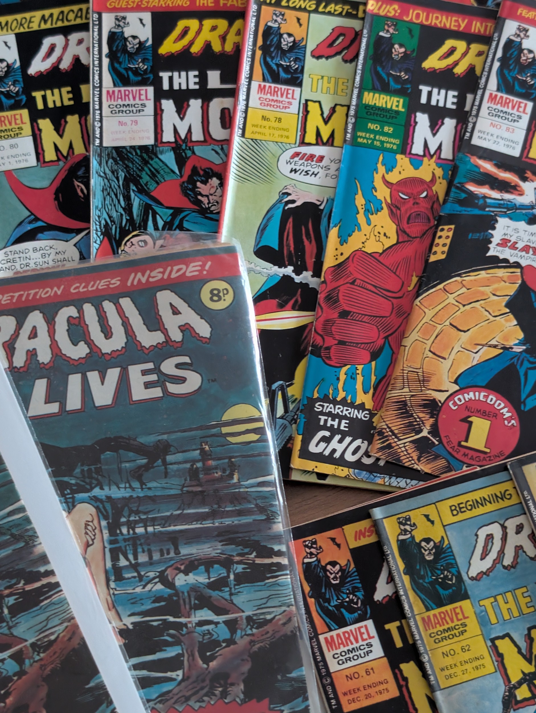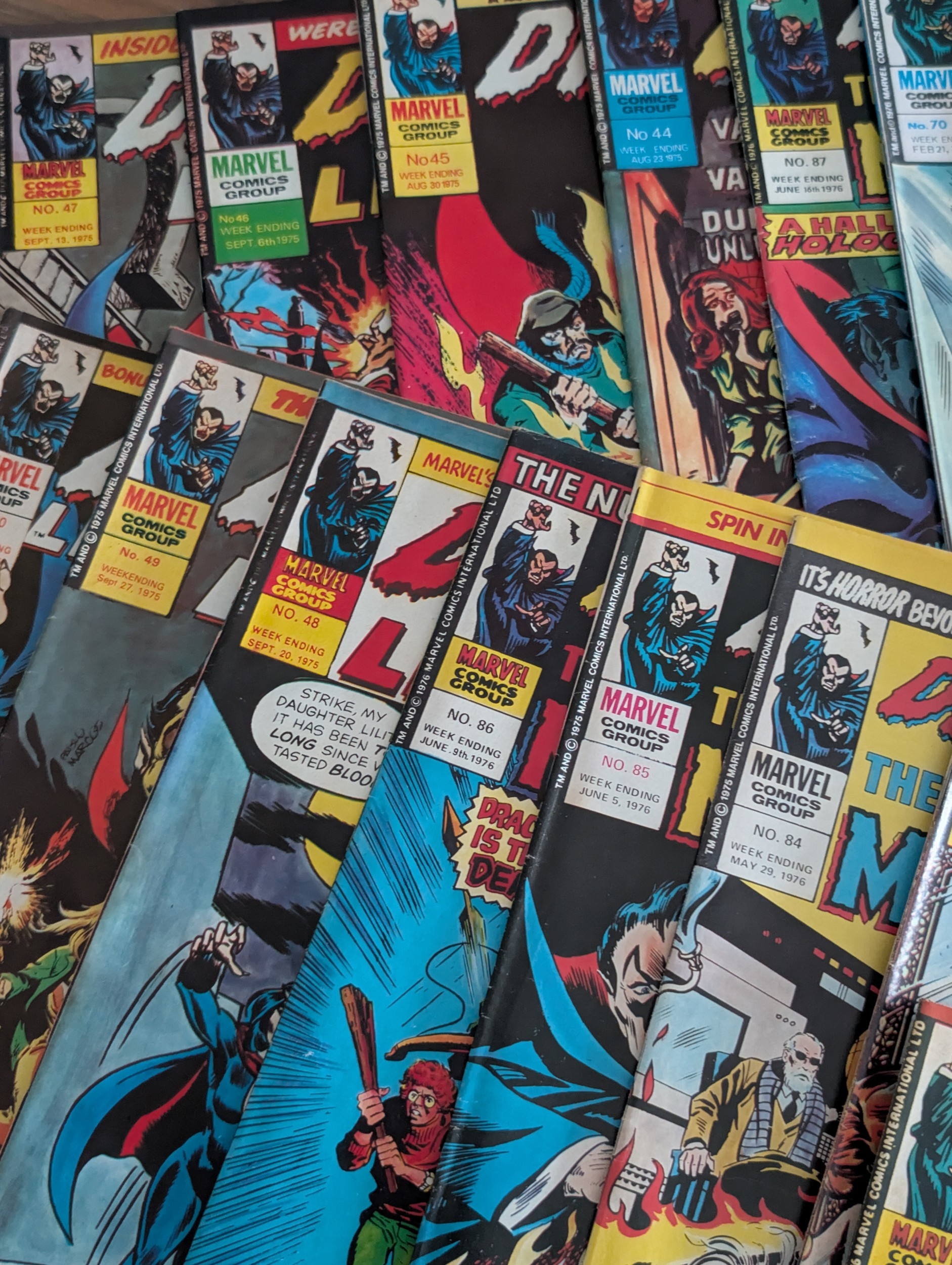Marvel Comics – Dracula Lives! / Legion of Monsters, further extensive run, Marvel UK, mid- to late-1970s. Good selection of later issues with recurring horror themes and crossover content (Legion of Monsters, Blade, Werewolf by Night, Frankenstein’s Monster)