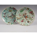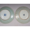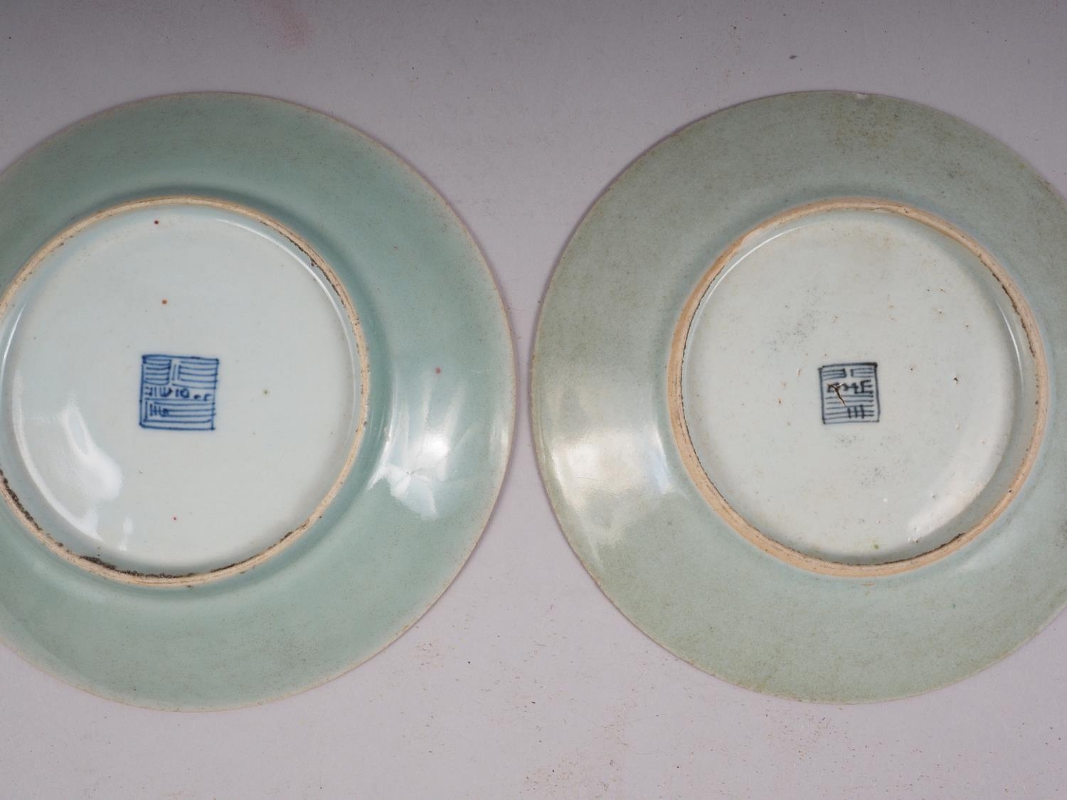 Two Chinese celadon glazed plates with bird, insect and flower design with seal marks to bases, 7 1/2" dia