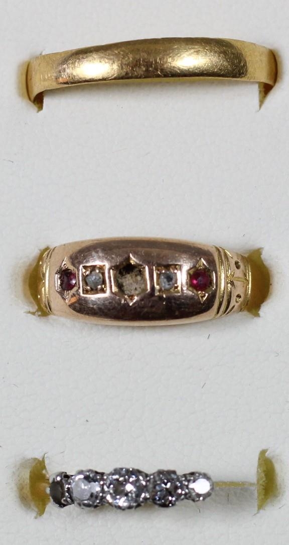 A 15 ct rose gold ruby and diamond ring, one setting vacant, 1.5 gm, an 18ct and diamond ring, very worn and a 22ct gold wedding band, 1.2 gms.