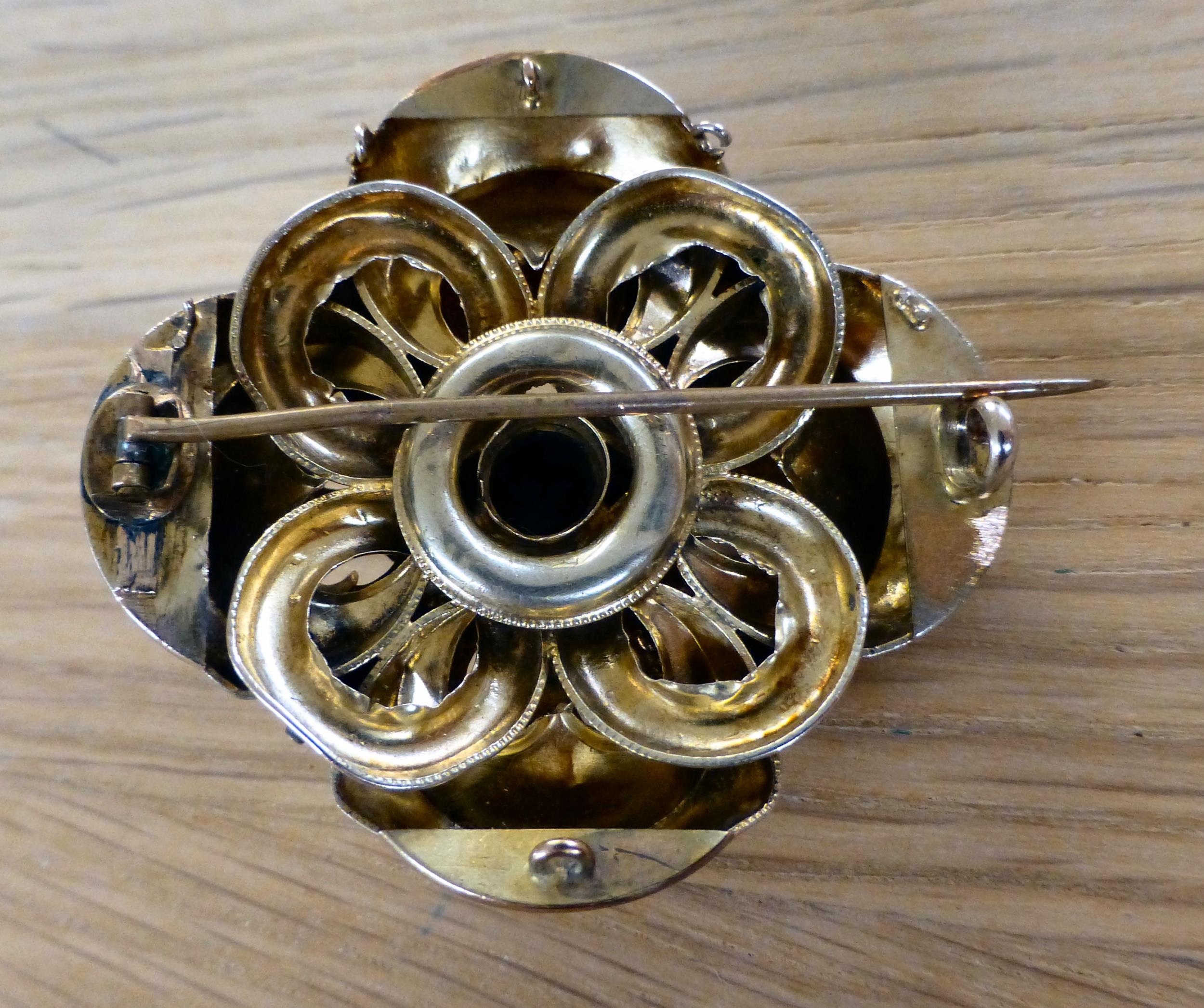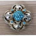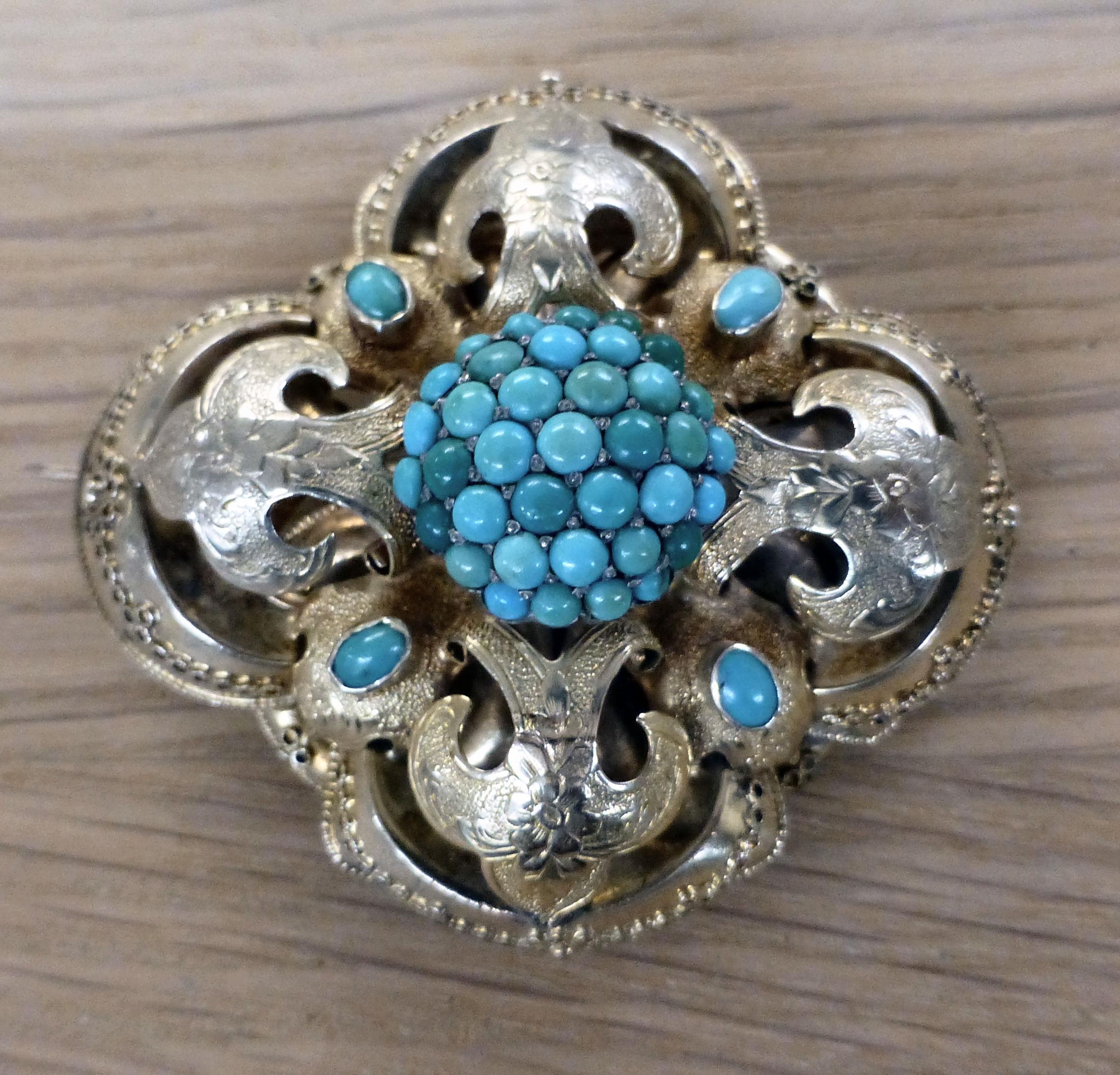 A late Victorian style yellow metal, three dimensional, engraved and turquoise coloured bead set brooch (approx. gross weight 12 grams)