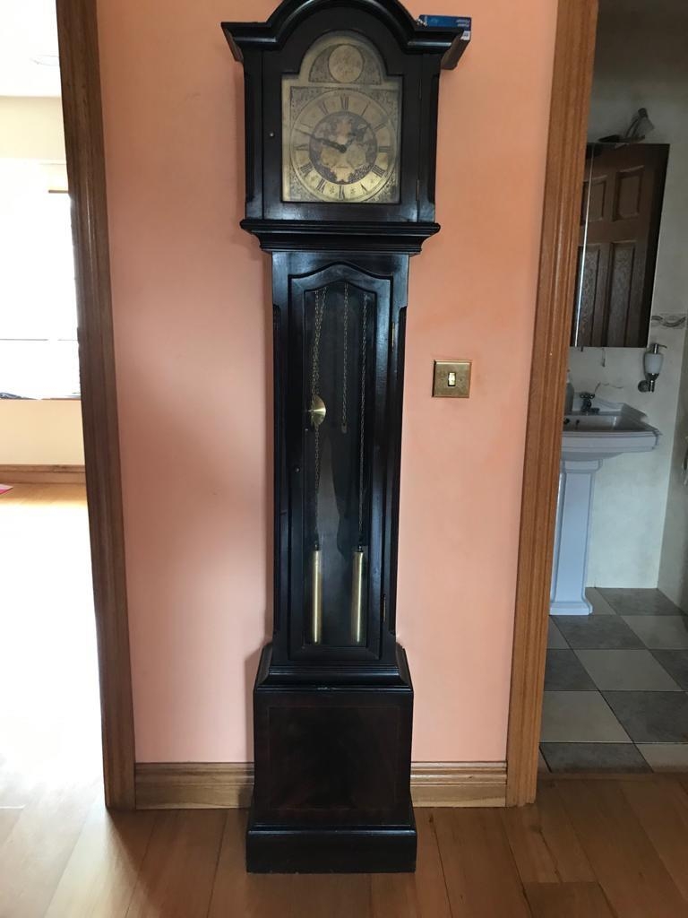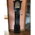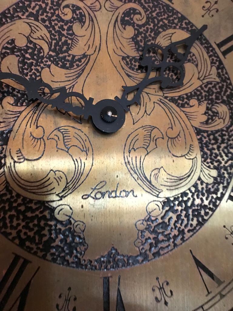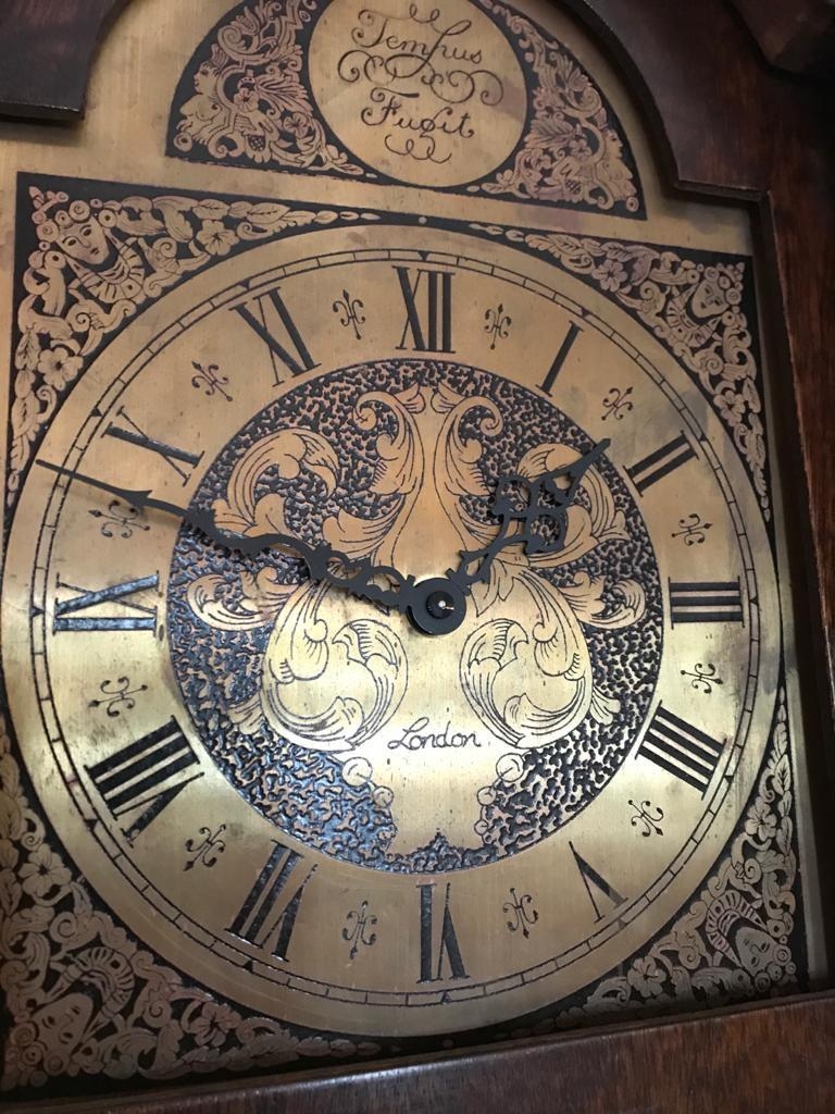 Good quality mahogany Grandfather clock with etched brass dial and single glazed door London {191 cm H x 37 cm W}.