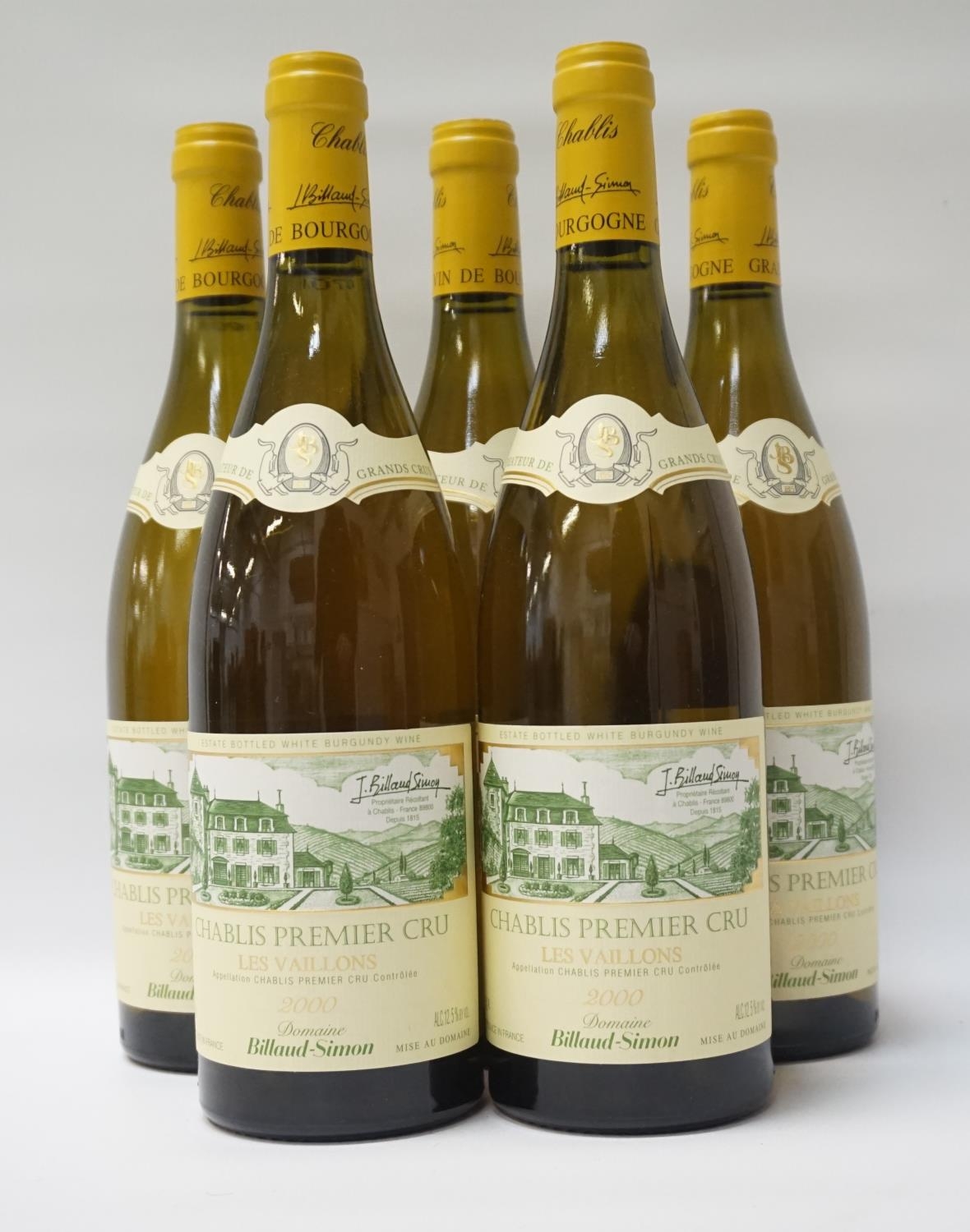 Five bottles of the 2000 Vintage Chablis from Domaine Billaud-Simon, a family owned domaine with 20 hectares of vines in three grand cru vinyards. Chablis Premier Cru "Les Vaillons" 2000 Vintage. 750ml. 12.5% abv. All with excellent levels in neck. Excellent condition. The wine has been stored in a perfect custom built cellar with an even temperature and humidity in Dunkeld, Scotland. 5 bottles.