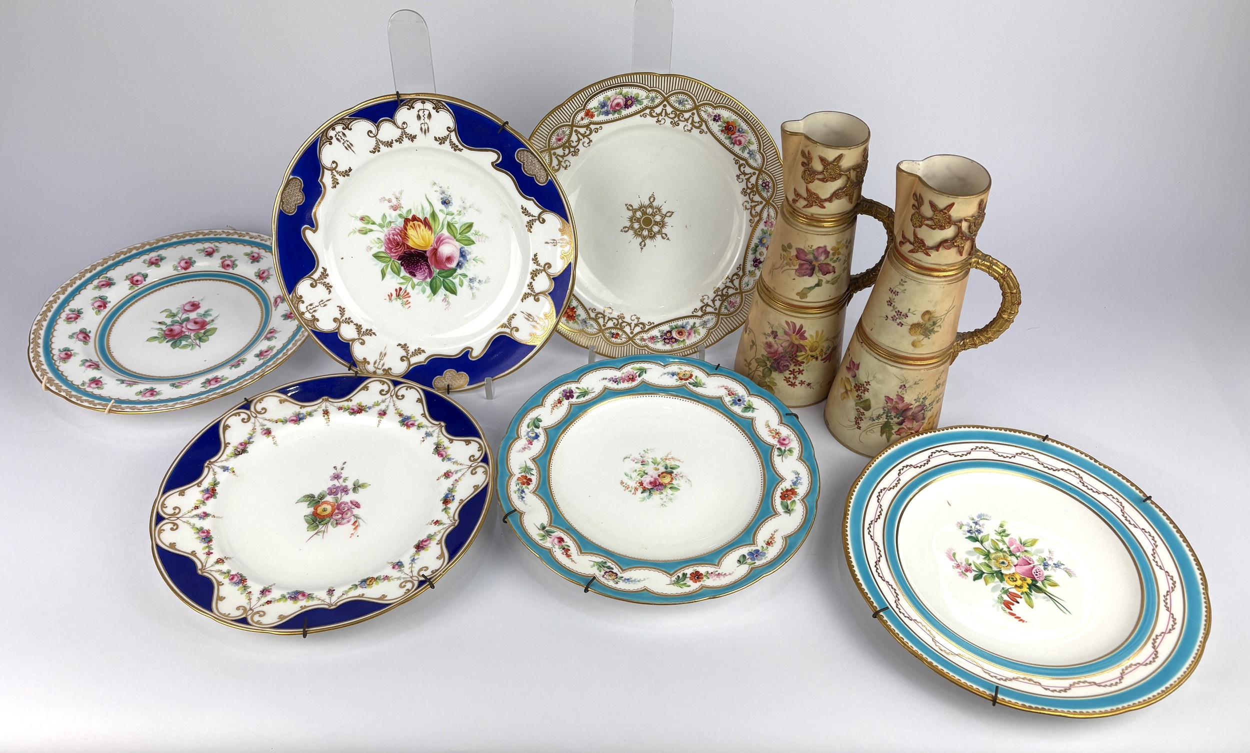 A pair of Royal Worcester blush ivory porcelain jugs decorated with flowers 1047, height 22.5cm, and a collection of six various floral porcelain plates