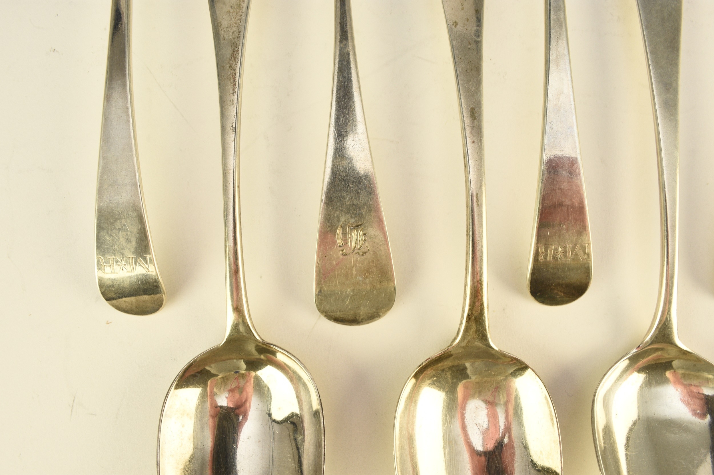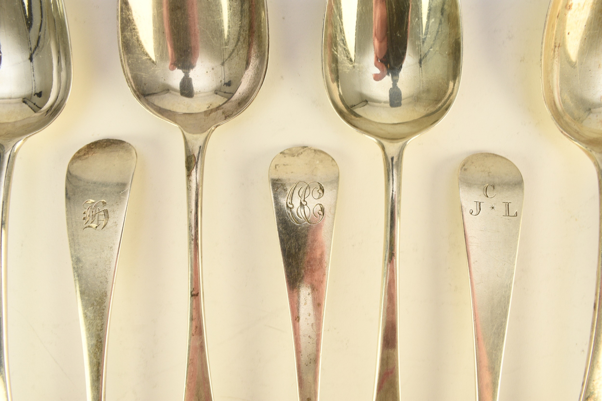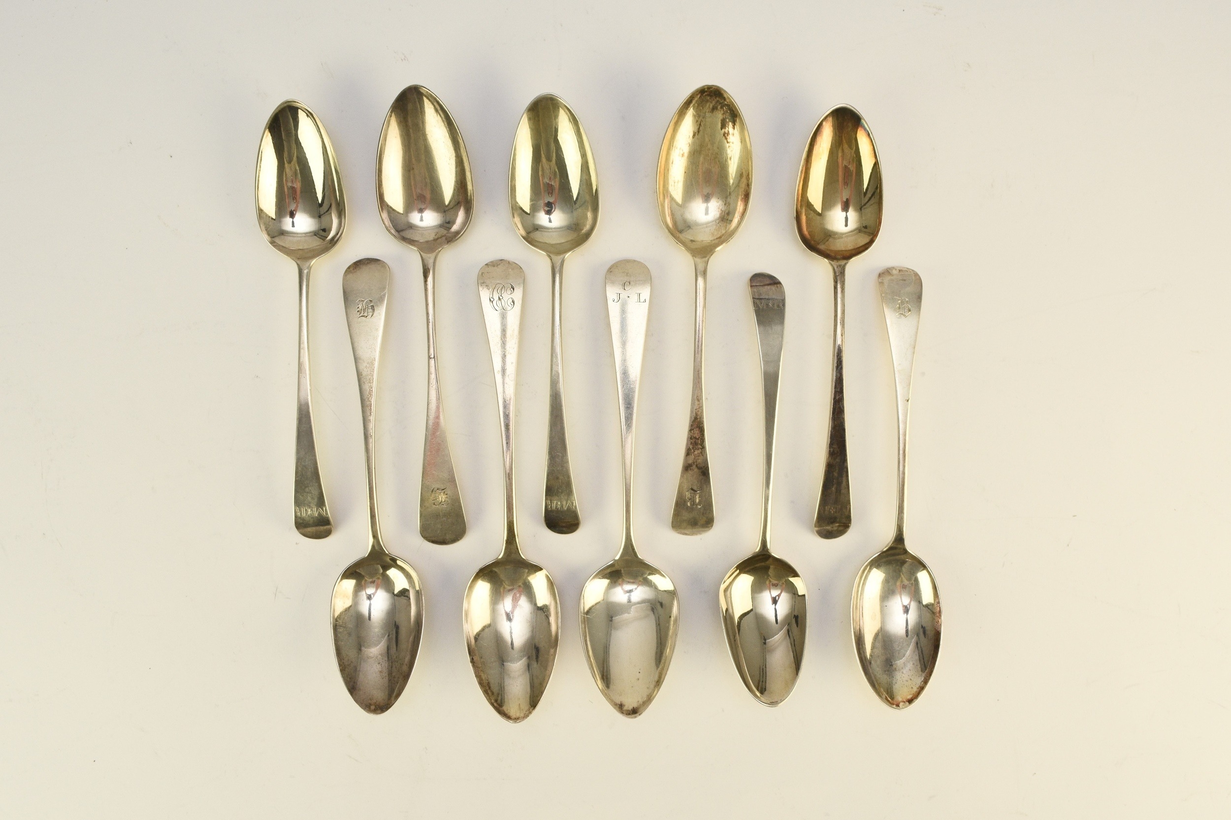 A collection of ten silver Old English pattern tablespoons, comprising, a set of four George III examples dated London 1785, a pair of Victorian examples dated London 1842 and four further examples, London & Sheffield, total weight approx. 19.5oz (10)