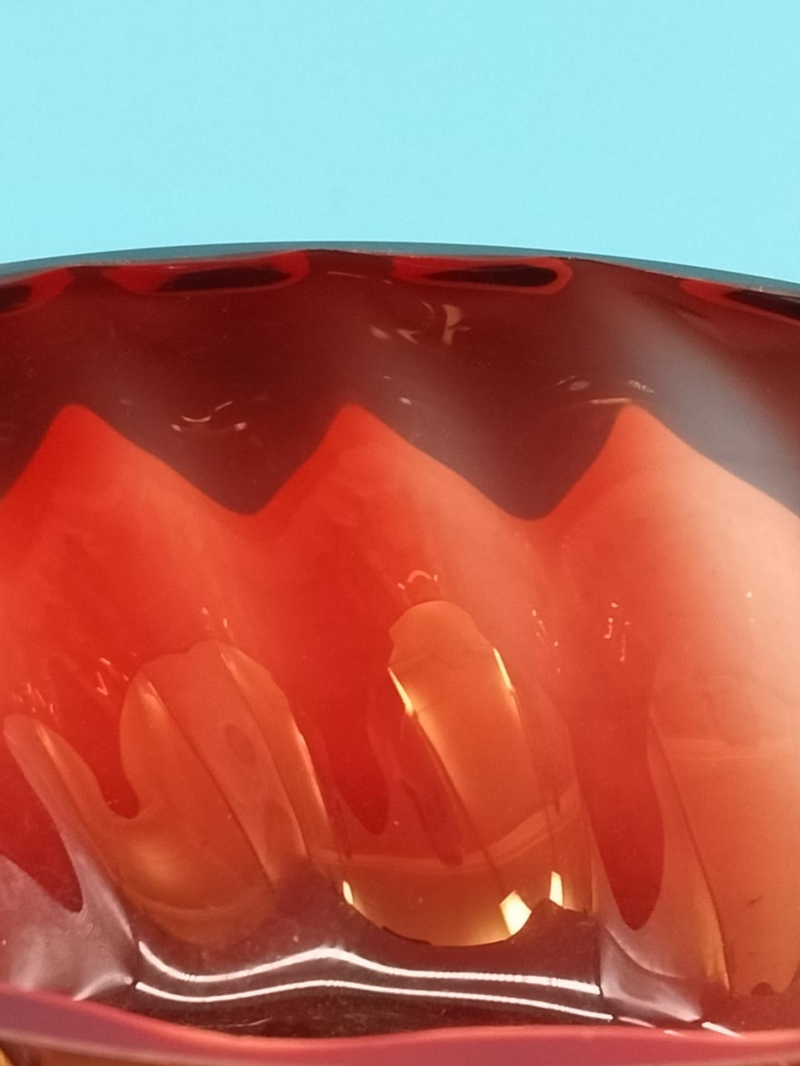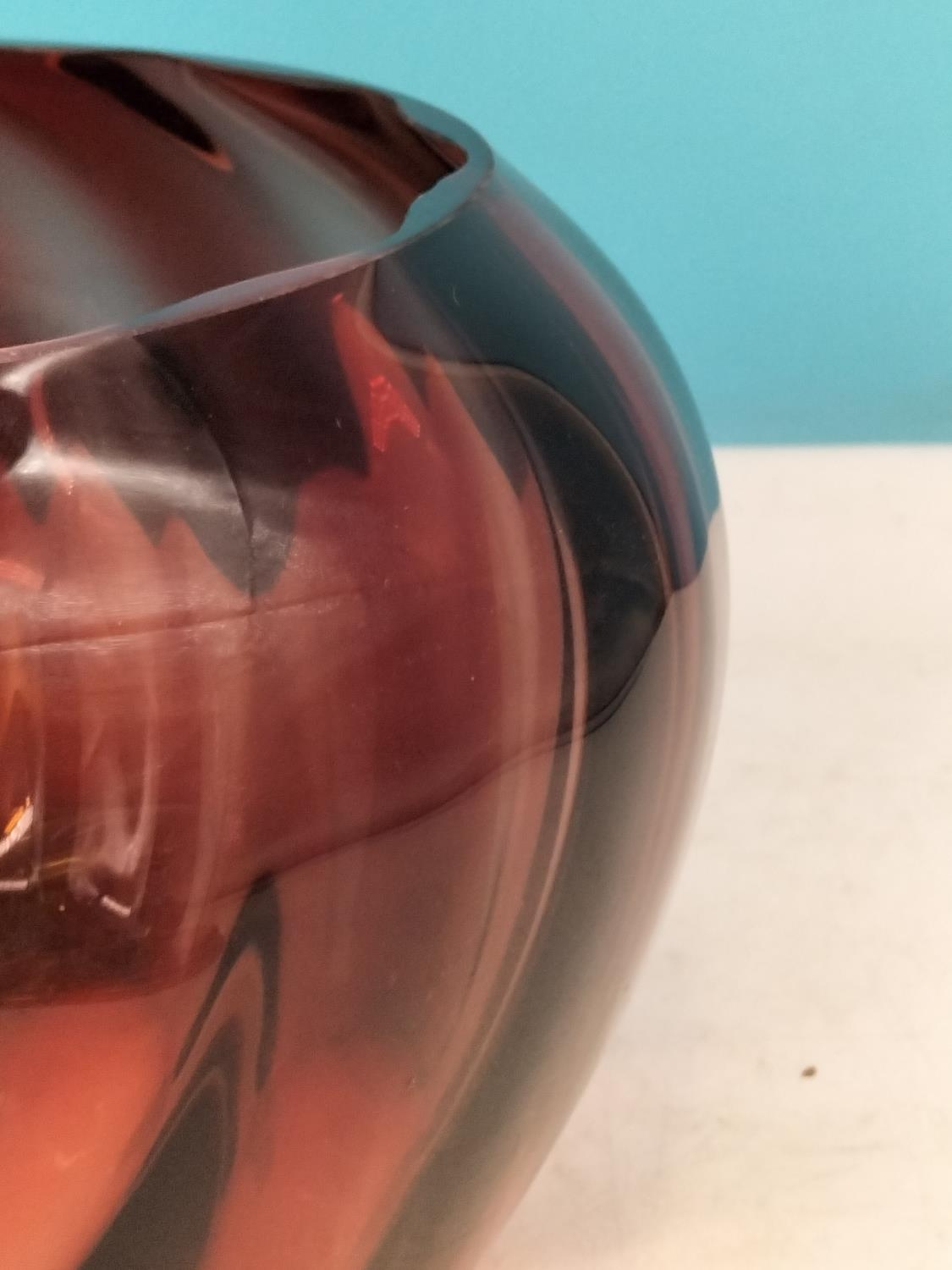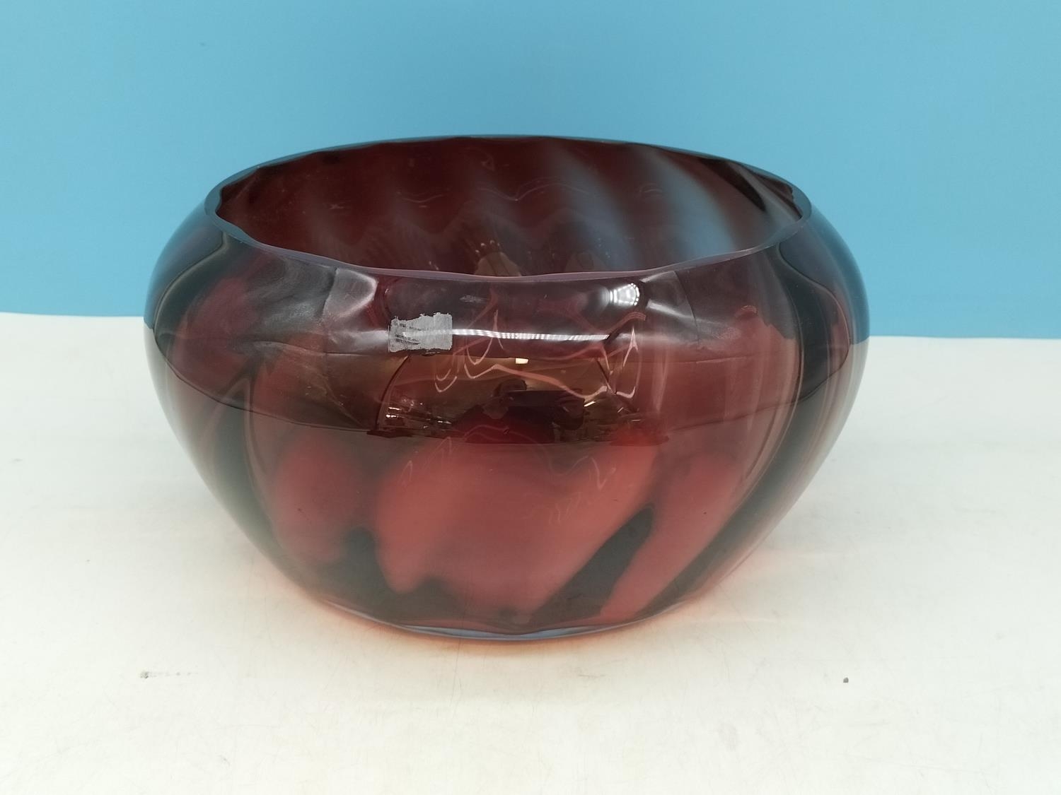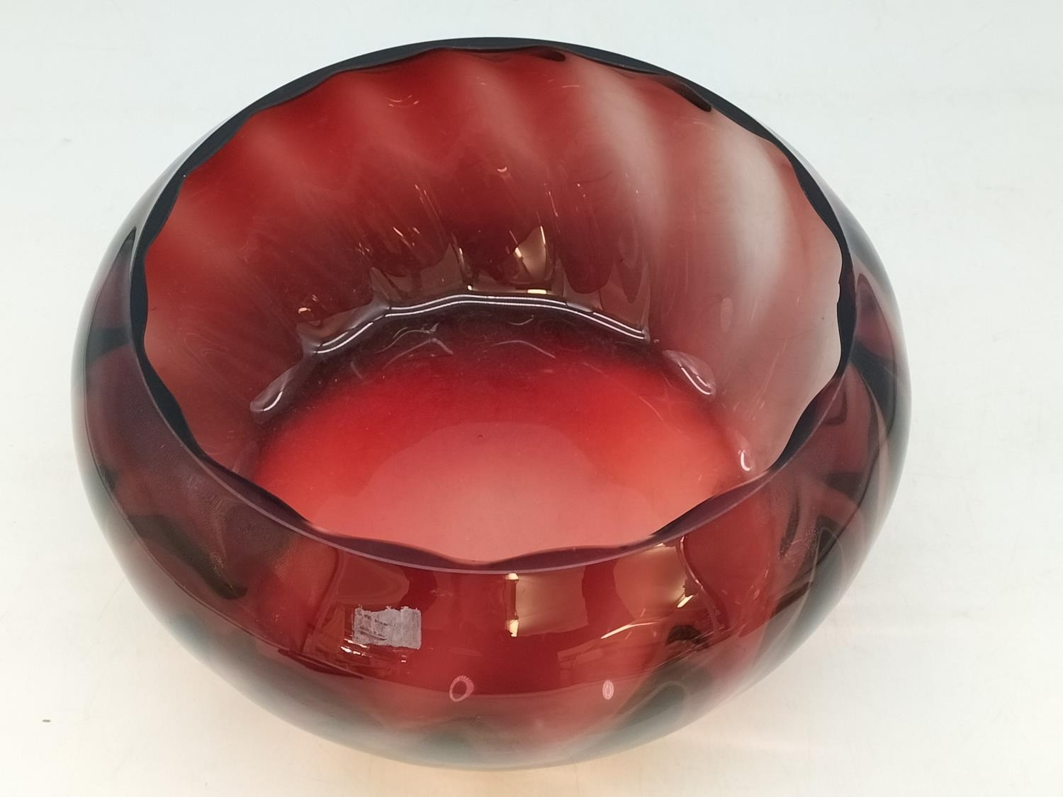 Ruby Glass Bowl. 14cm High, 27cm Diameter. Nip to Rim.
