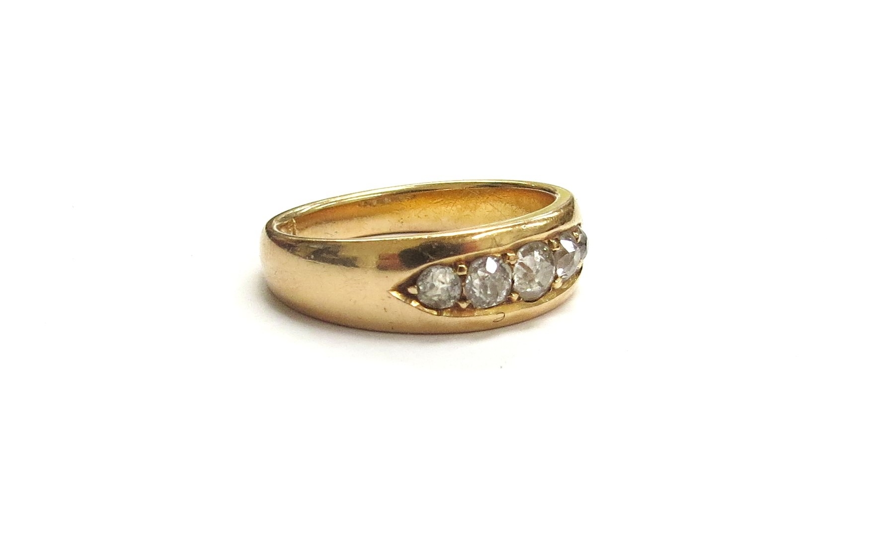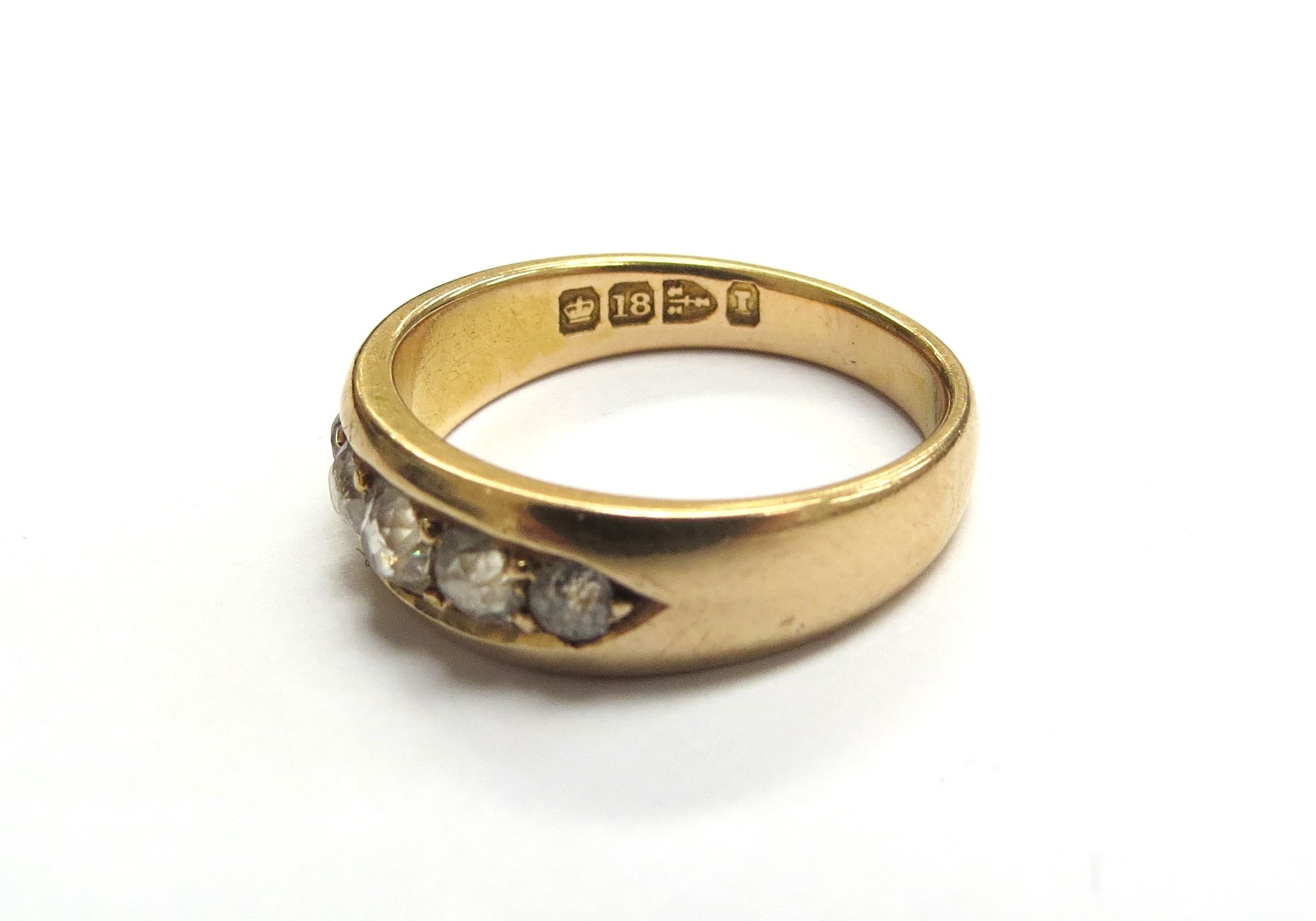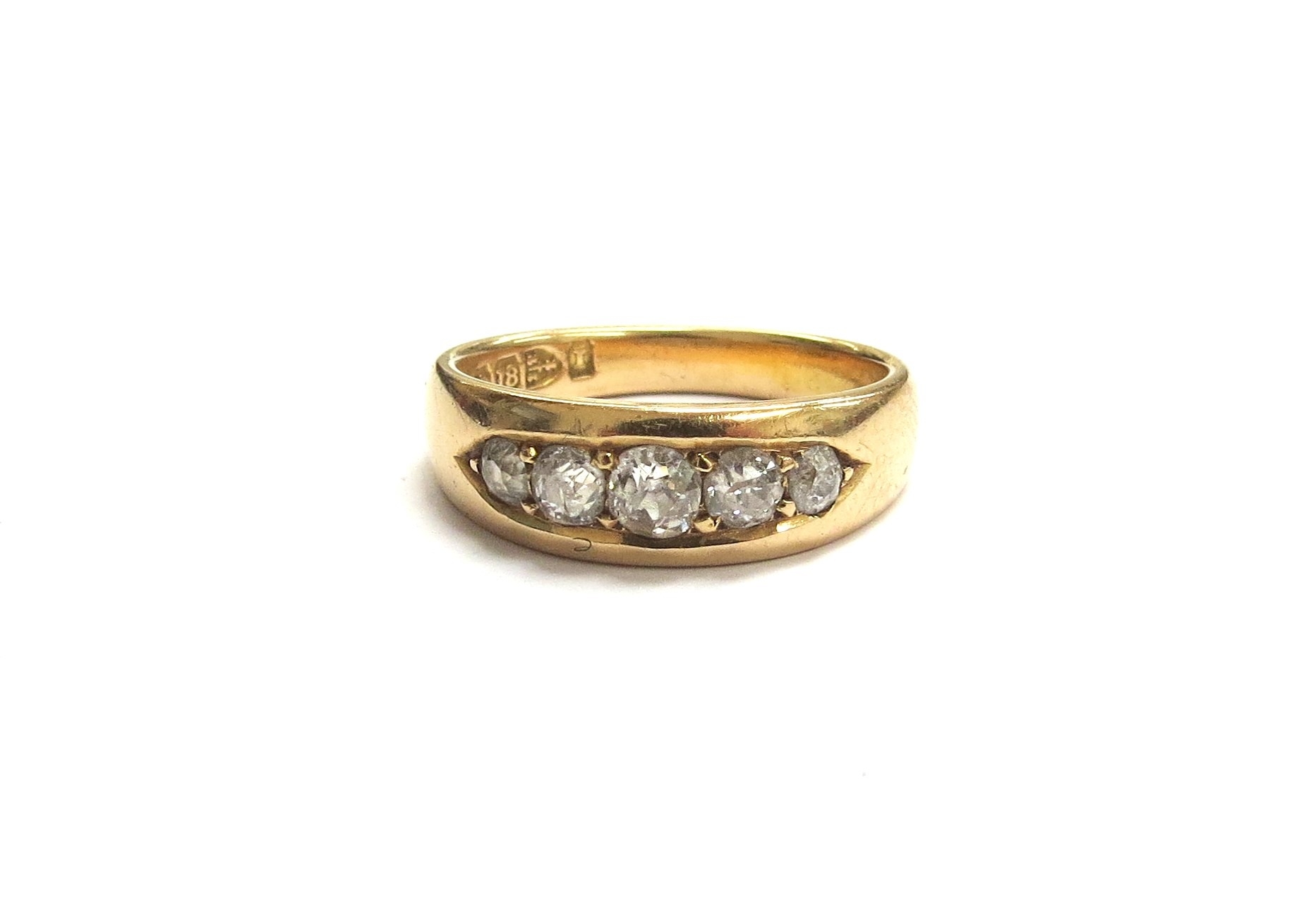 An 18ct gold ring with five graduated diamonds in boat shaped mount, Chester hallmarks. Size O, 5.6g