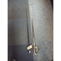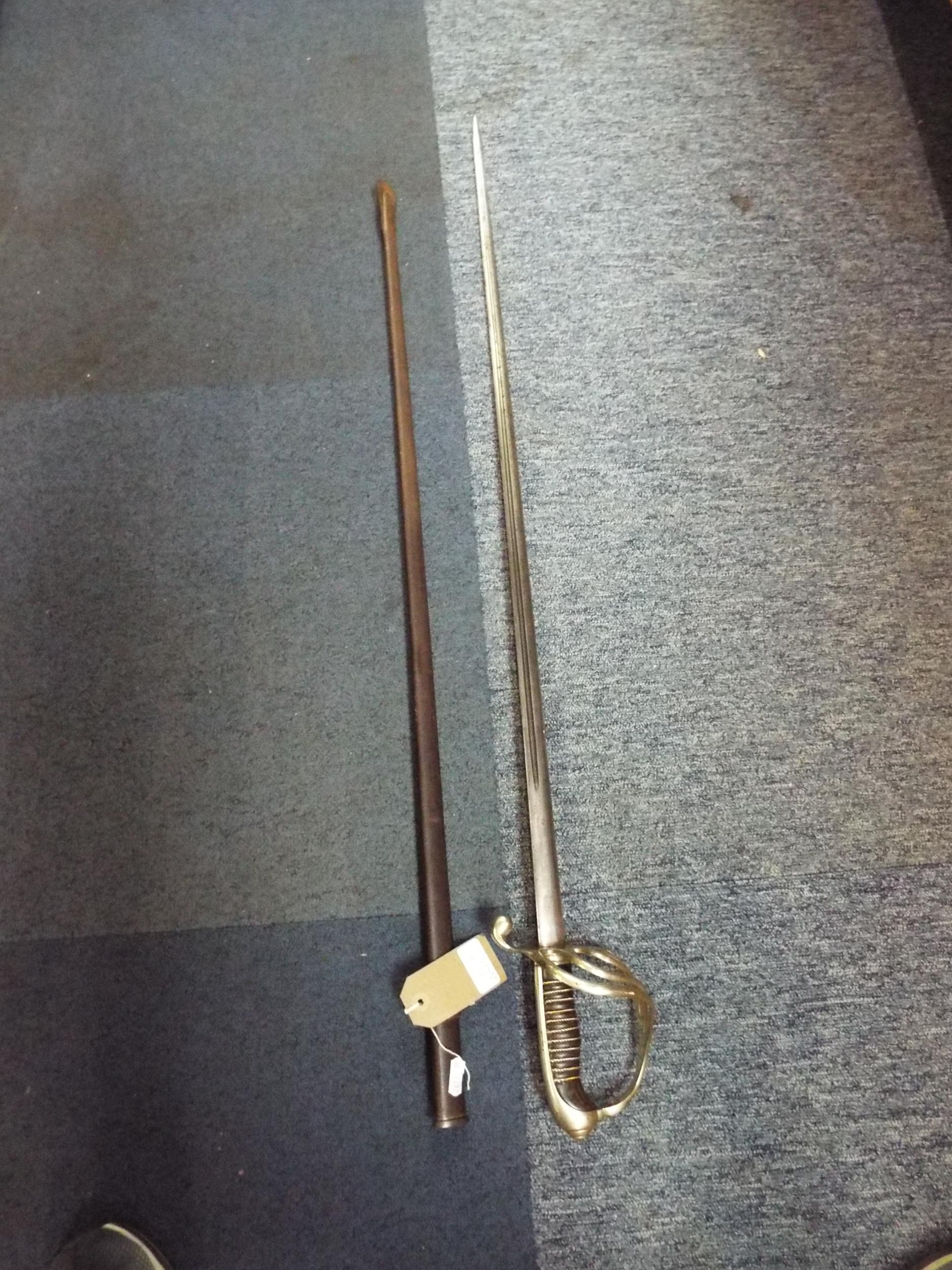 A pre 1945 plus 1919 inscription German dress sword having brass hilt, leather grip housed in a steel scabbard