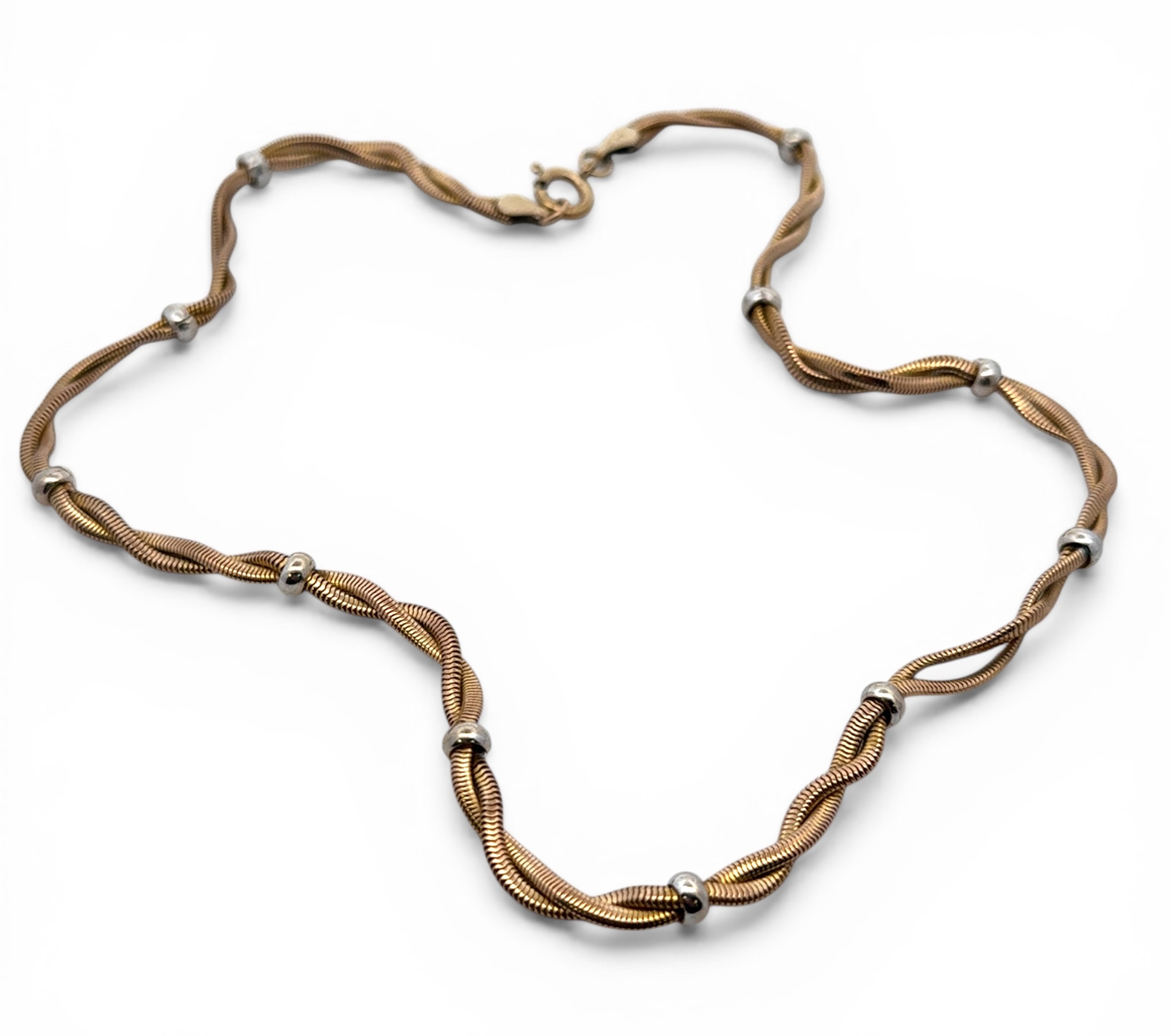 A 9ct yellow and white gold necklet with a yellow gold twisted rope effect and white gold balls. Length approx 43cm.