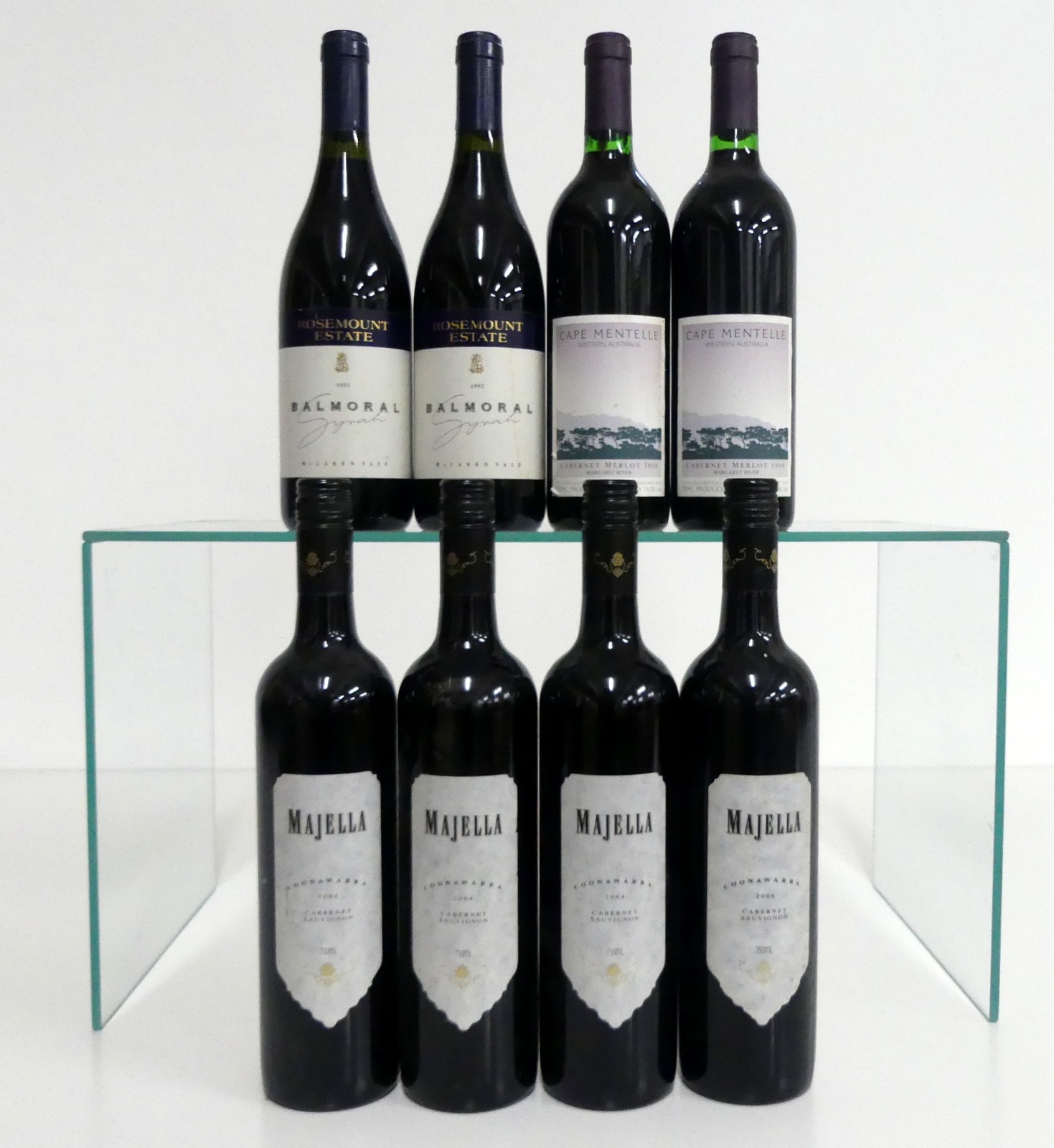 2 bts Rosemount Estate Balmoral Syrah 1995 McLaren Vale i.n, bs 2 bts Cape Mentelle Cabernet Merlot 1998 Margaret River 3 bts Majella Cabernet Sauvignon 2004 Coonawarra hf 1 bt Majella Cabernet Sauvignon 2006 Coonawarra Above 8 bottles