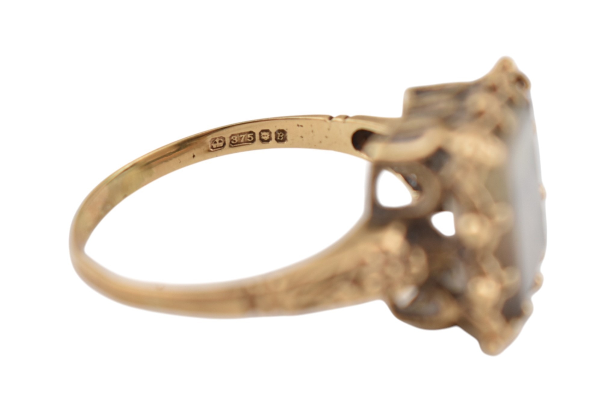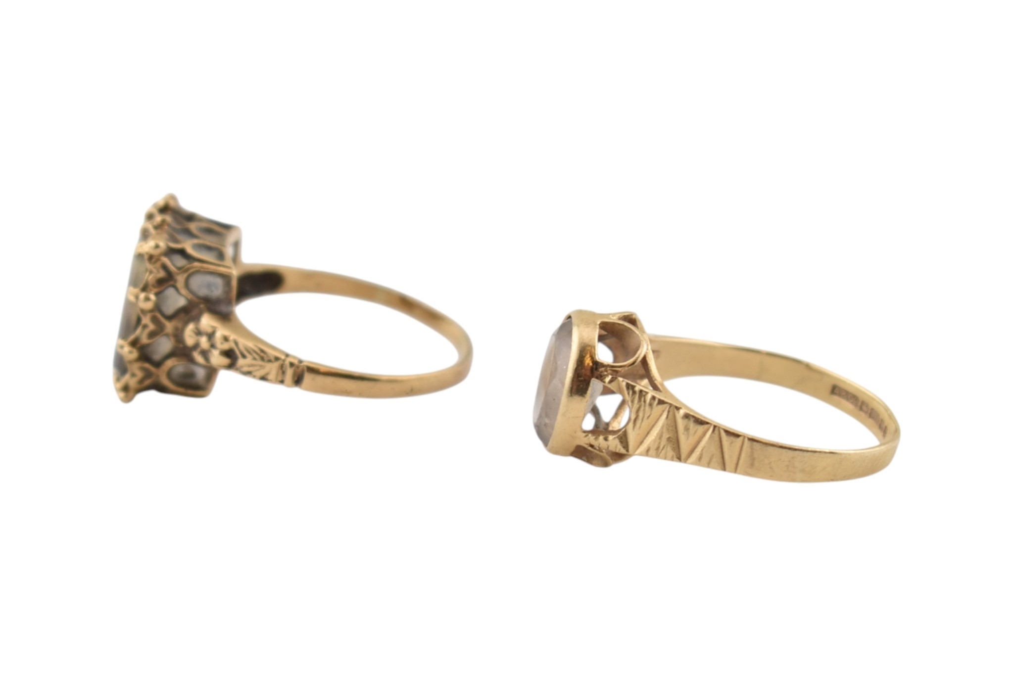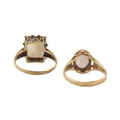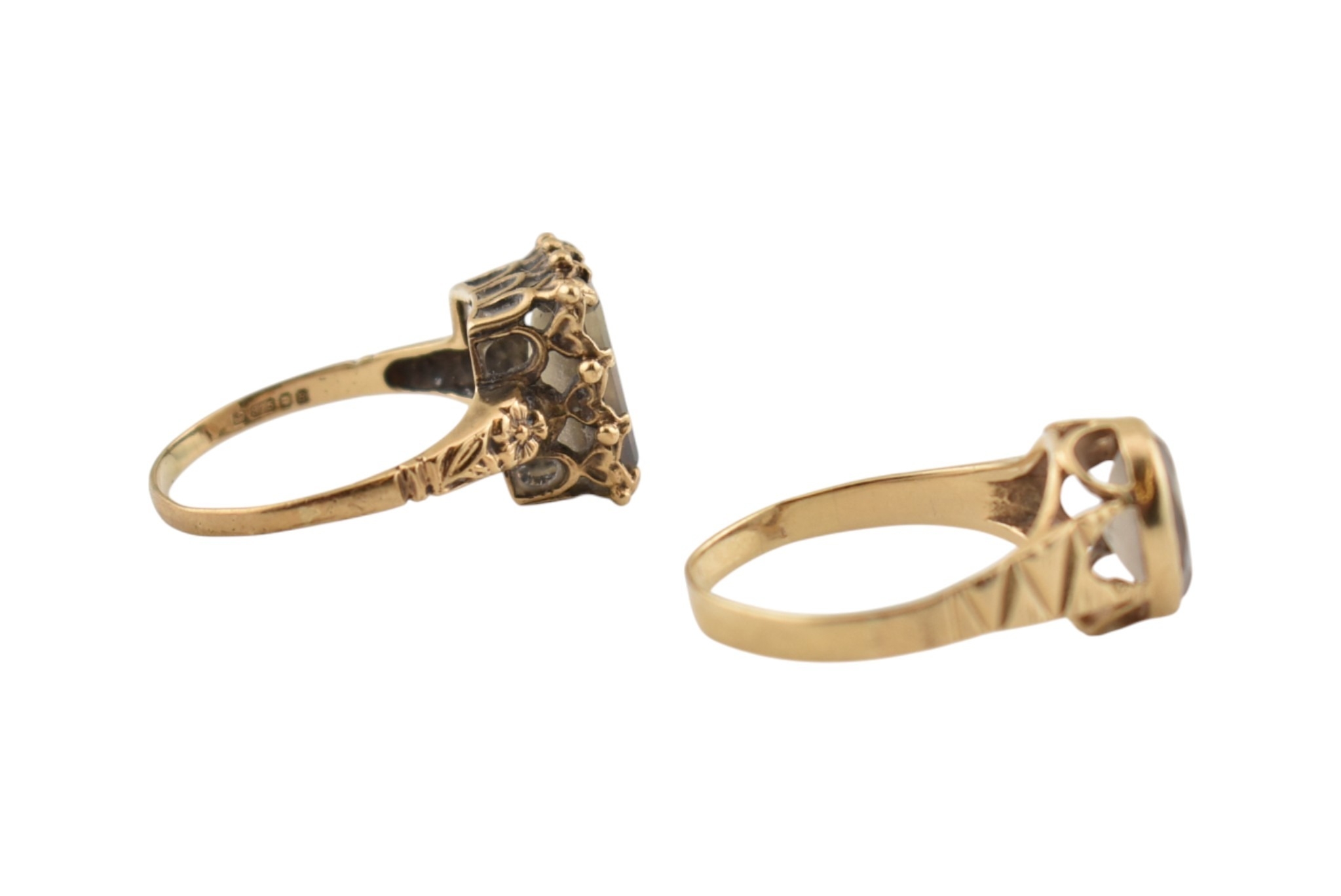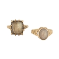 Two hallmarked 9ct gold single stone rings. Each with single quartz / white stones. Hallmarked London & Birmingham. Total weight 5.8g.