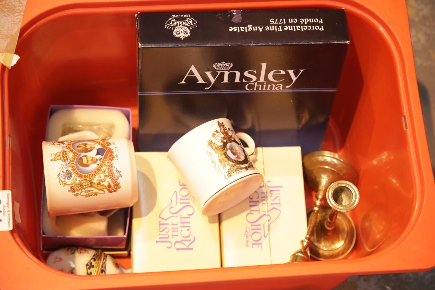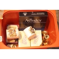 Box mixed items including brass candlesticks. This lot is not available for in-house P&P.