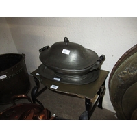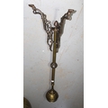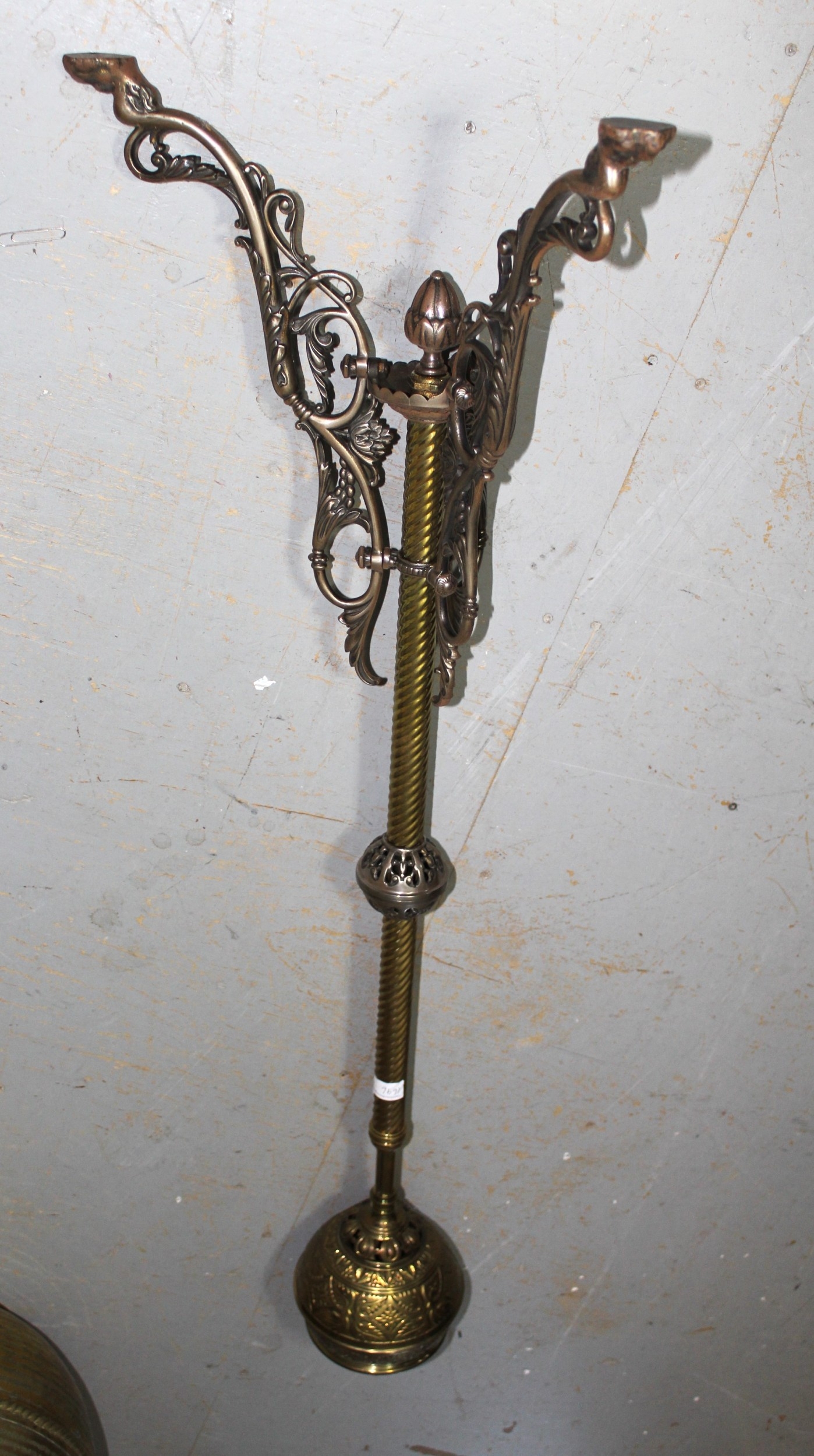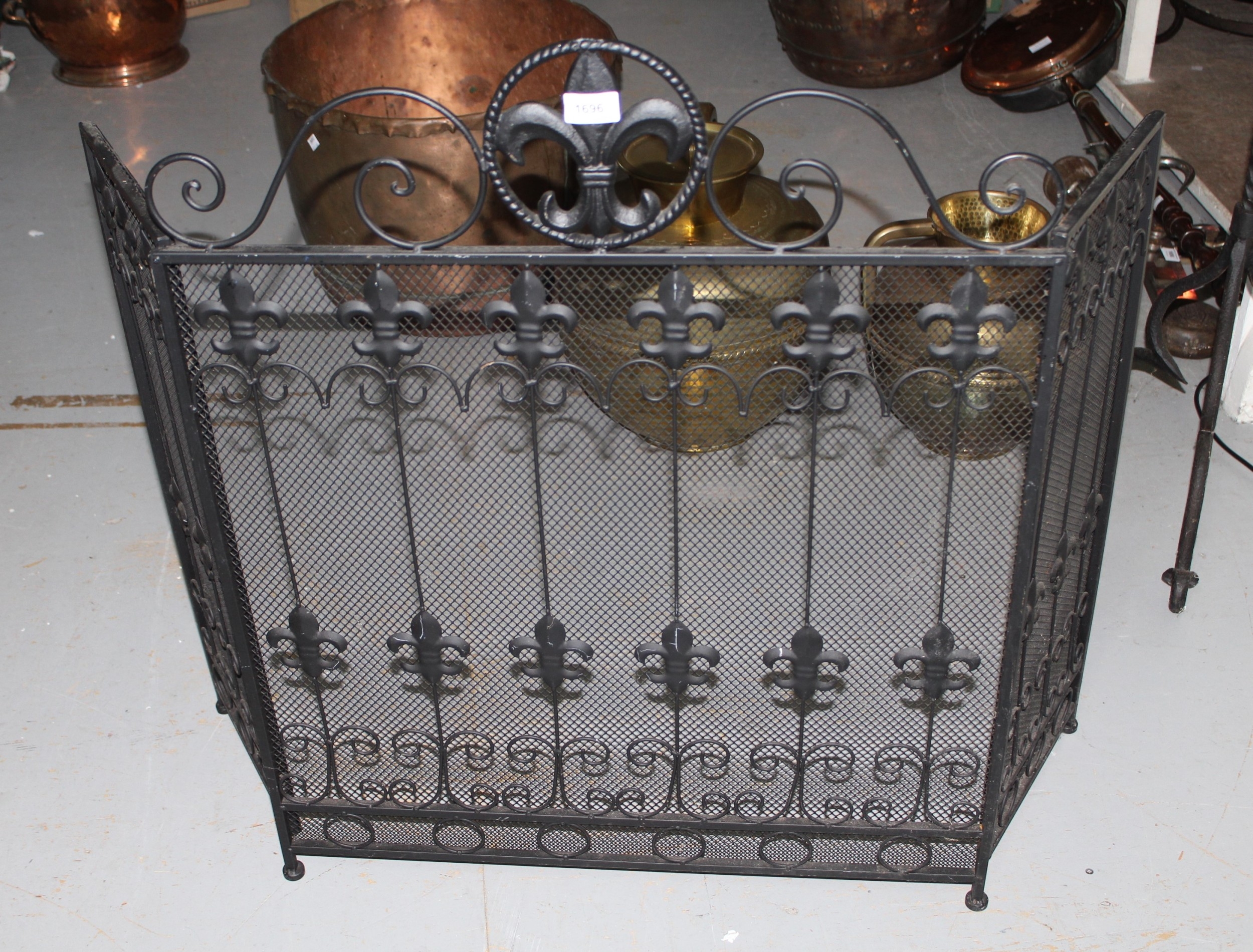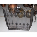 Black painted wrought iron triple section fire screen together with a brass telescopic standard lamp (at fault)