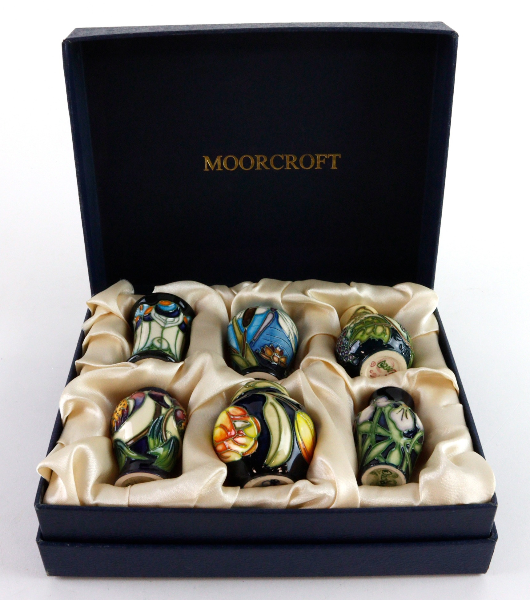 Moorcroft. A collection of six Moorcroft miniature vases & ginger jar, makers marks to base of each, height 55mm approx., contained in fitted Moorcroft box