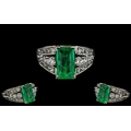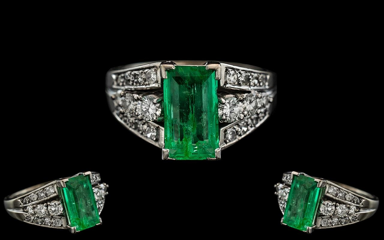 18ct White Gold - Superb Quality Emerald and Diamond Set Dress Ring. c.1930's. The Natural Step-cut Columbian Emerald of Excellent Colour, Est 2.00 cts, Set with Diamonds to Shoulders of Excellent Colour / Clarity. Est Weight 1.30 cts. Ring Size O - P. The Shank and Setting In Excellent Condition.