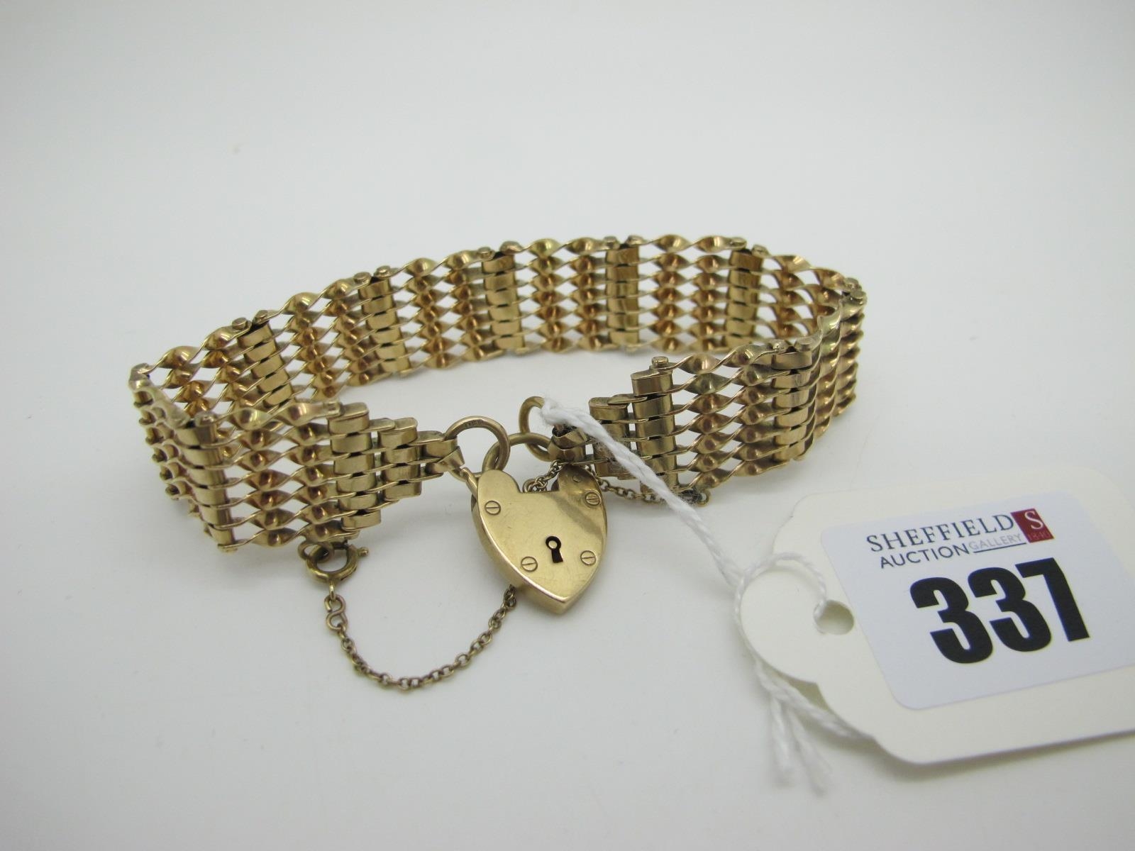 A 9ct Gold Gate Style Bracelet, to 9ct gold heart shape padlock clasp (19grams).