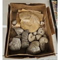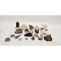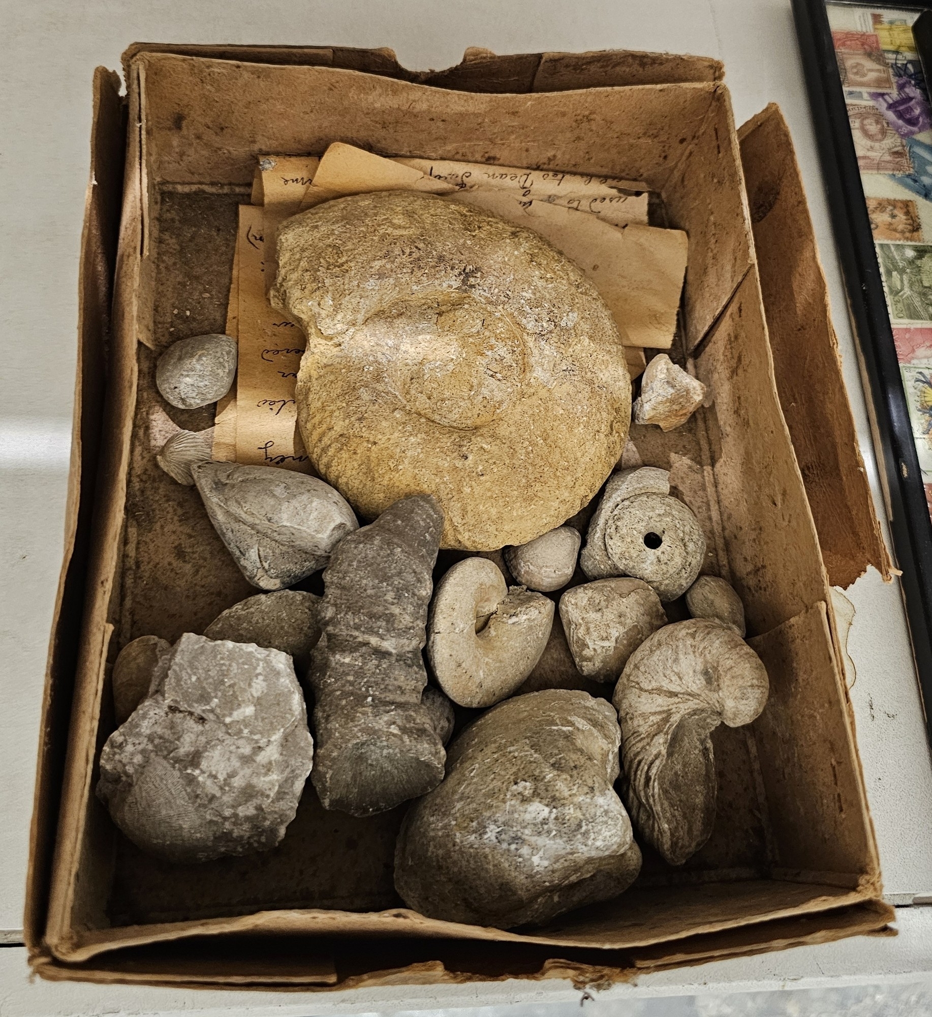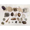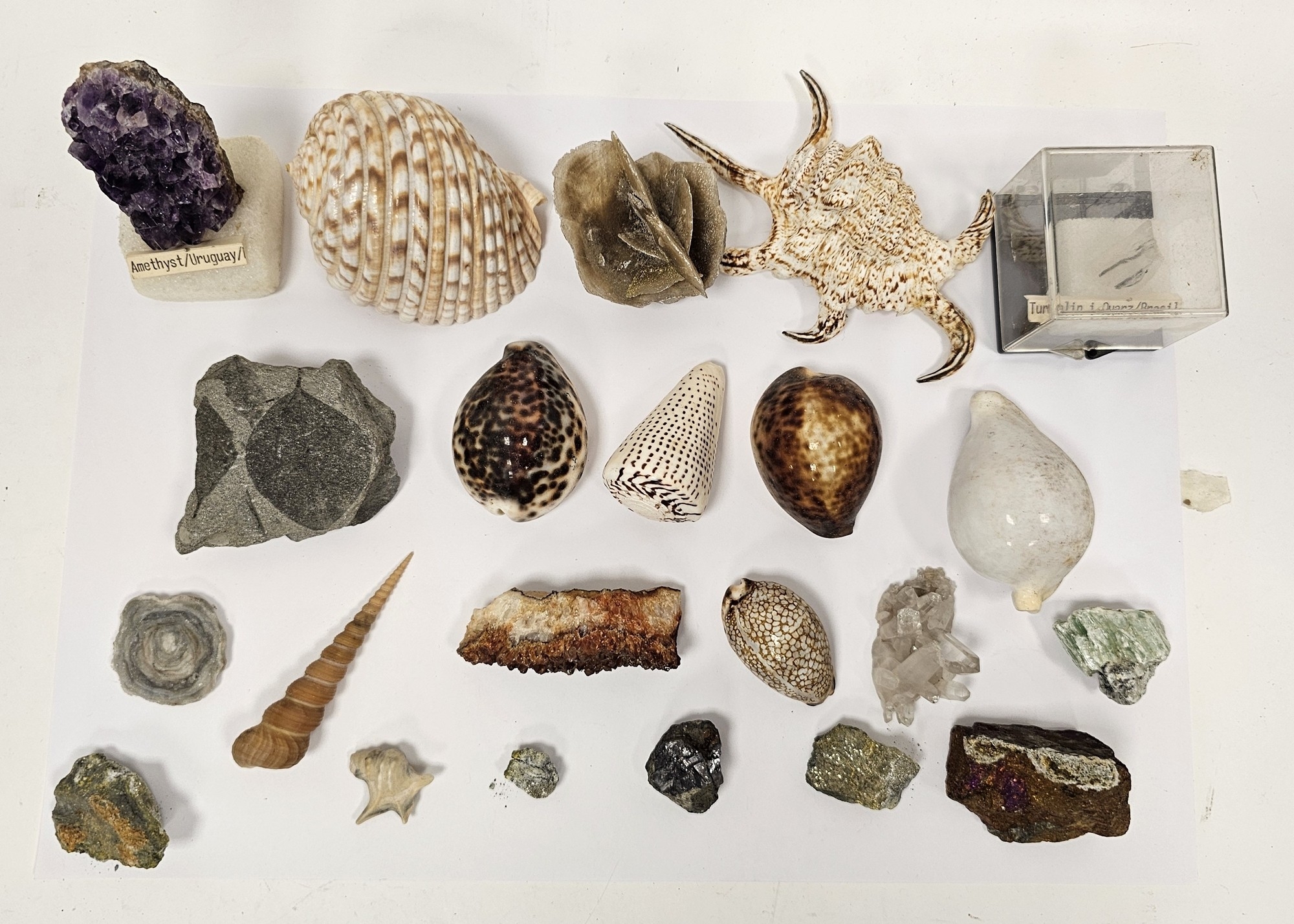 Collection of fossils, shells and gemstones including an ammonite fossil, 12cm wide, a tonna shell, leopard cone shell, a rose crystal, an amethyst geode crystal, a tourmaline quartz, a citrine geode crystal, a spider conch shell and other fossils, shells and crystals
