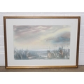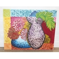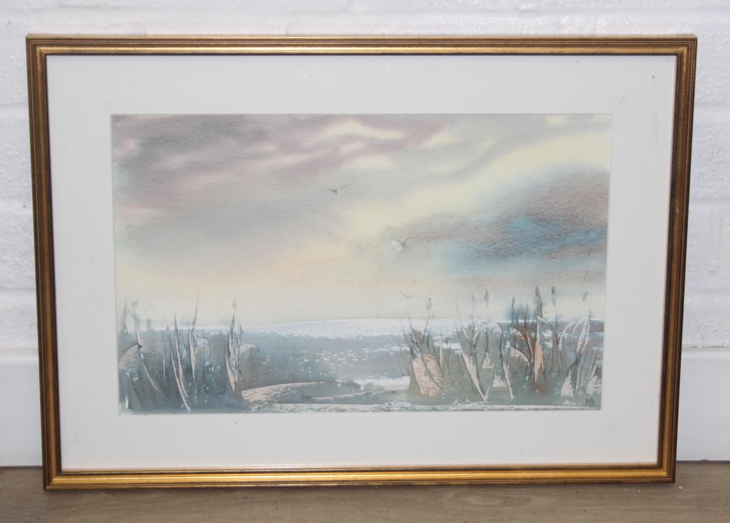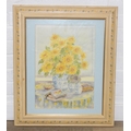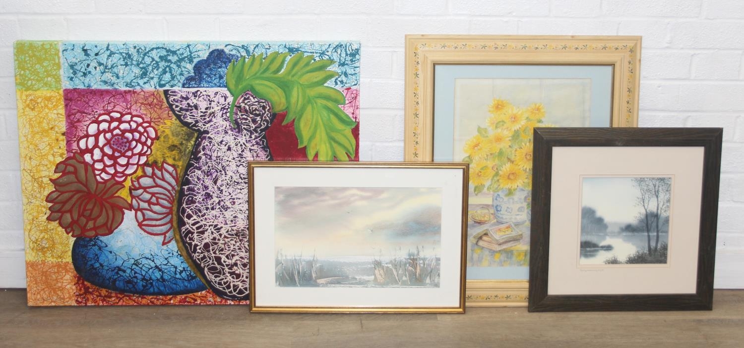 Qty of paintings to inc a colourful oil on canvas of flowers, a watercolour of sunflowers in vases, indistinctly signed, Early Morning Light by Peter Robinson, & a watercolour of reed by Varvara Nieman, the largest 76cm x 61cm [4]