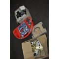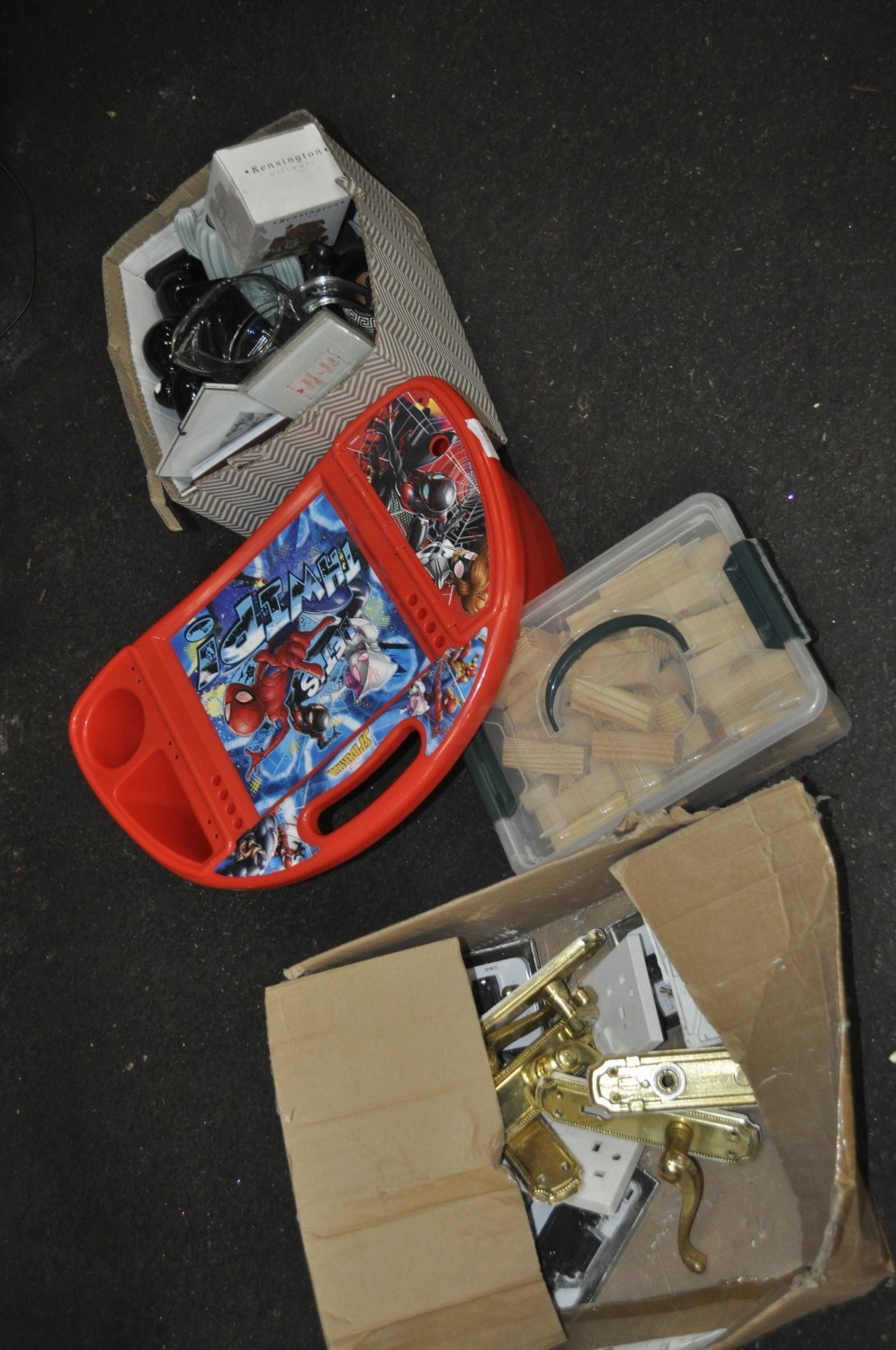 A SHELF OF WONDROUS EXCITEMENT INC A CARRIAGE CLOCK, MINI GREEK STYLE AMPHORA, KENSINGTON GIFTWARE COTTAGE, CHILDREN'S SPIDER-MAN ACTIVITY TABLE, GENUINE JENGA BLOCKS ETC