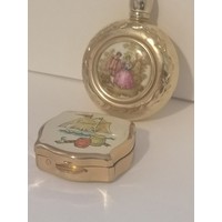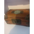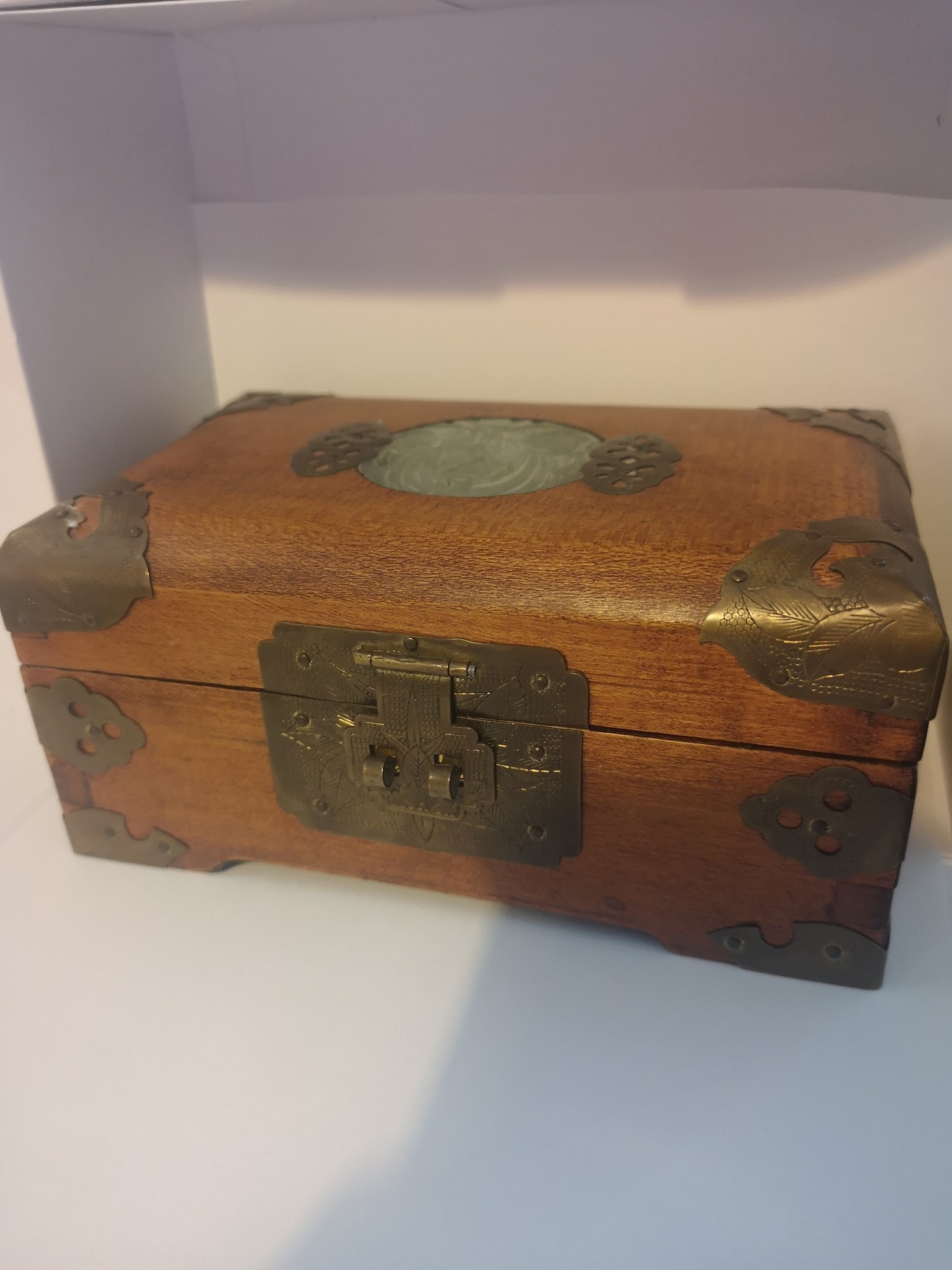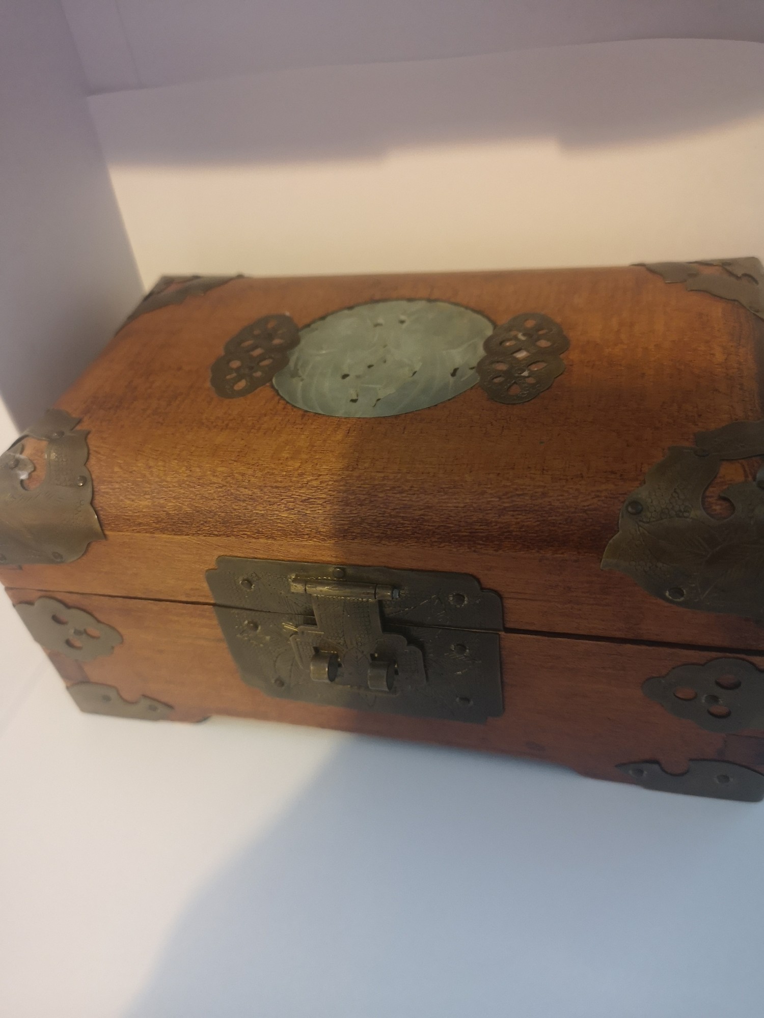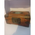 Chinese carved box with brass bound with faux jade centre.