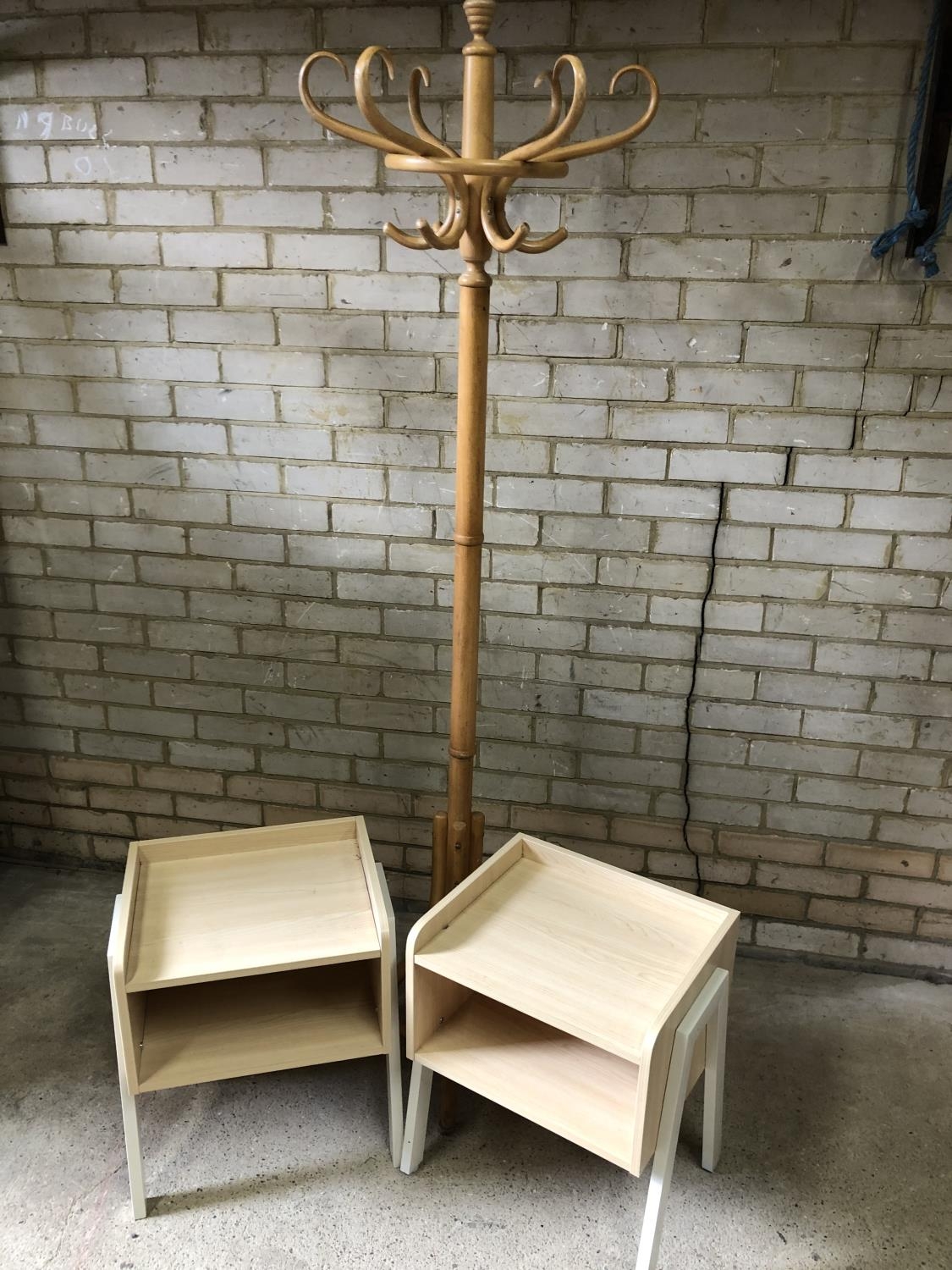 A modern bentwood coat stand together with a pair of bedsides