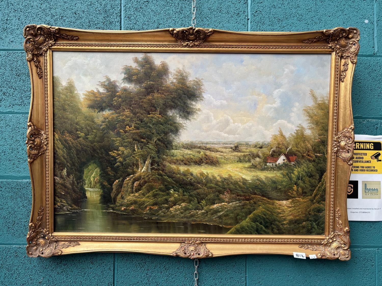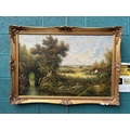 Ornately framed original oil on canvas of a serene rural landscape (105x74cm)