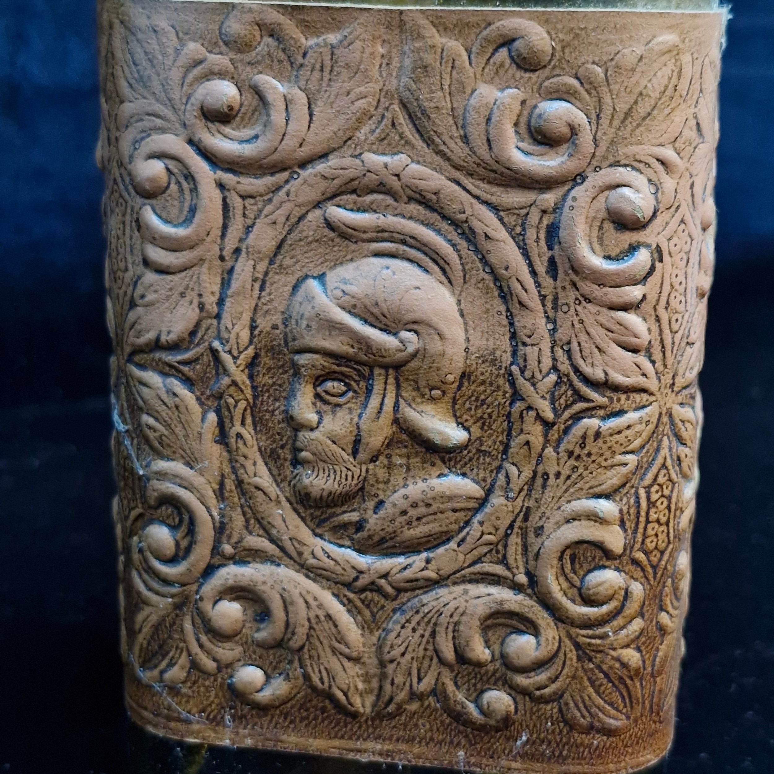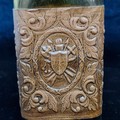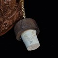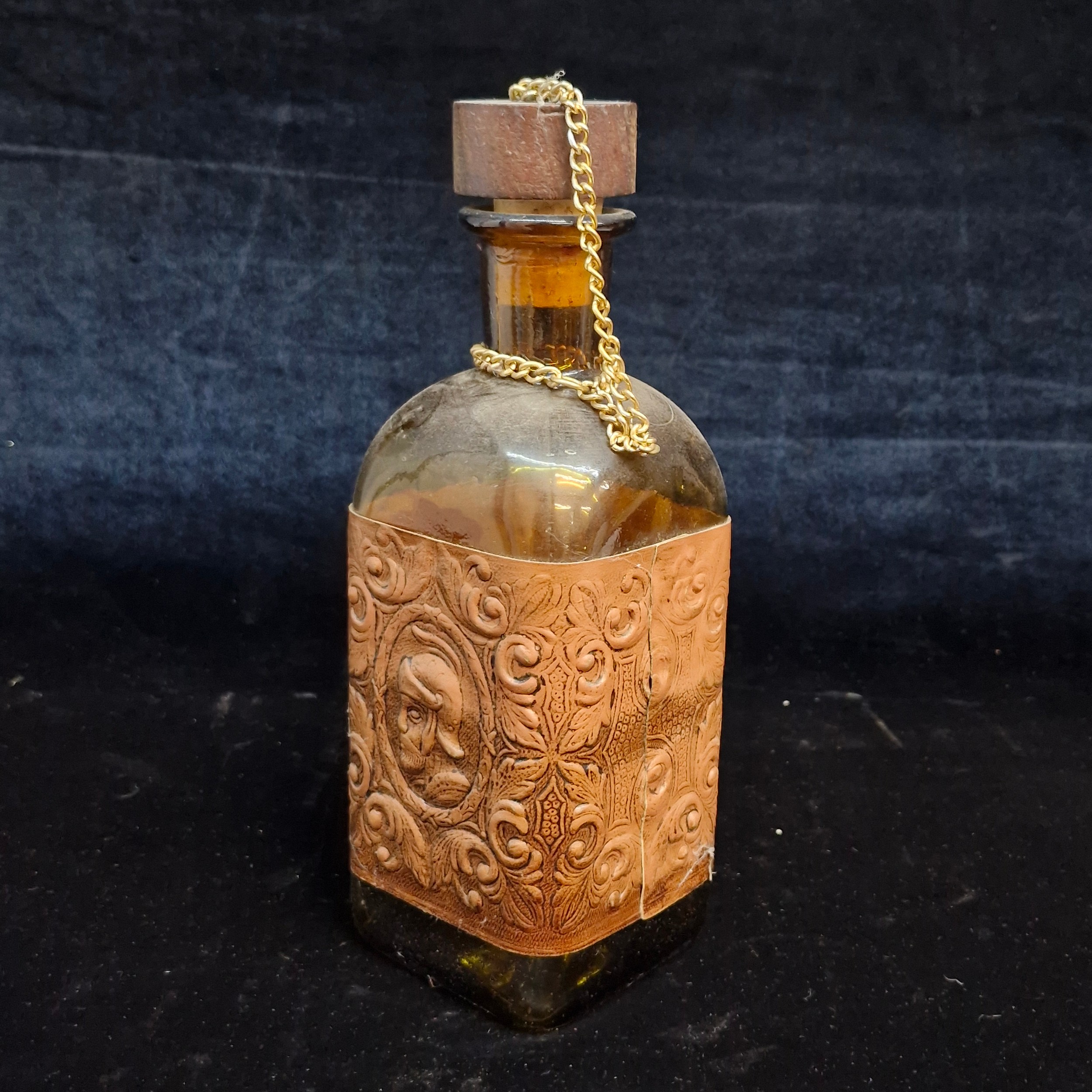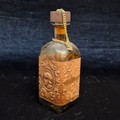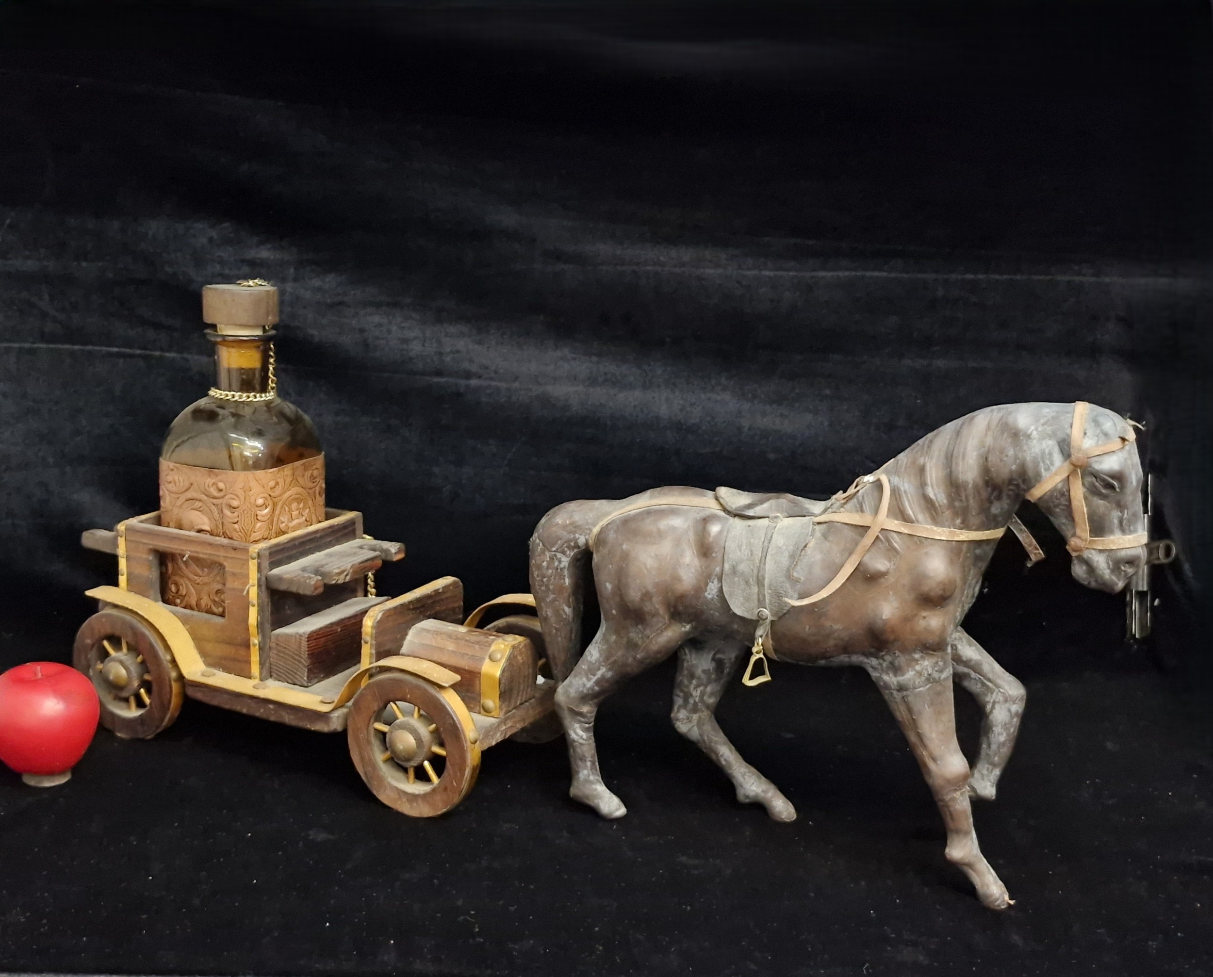 A vintage collectible figure of a horse and a wooden carr, which serves as a display for a bottle. Bottle with original cork stopper.