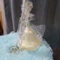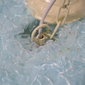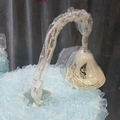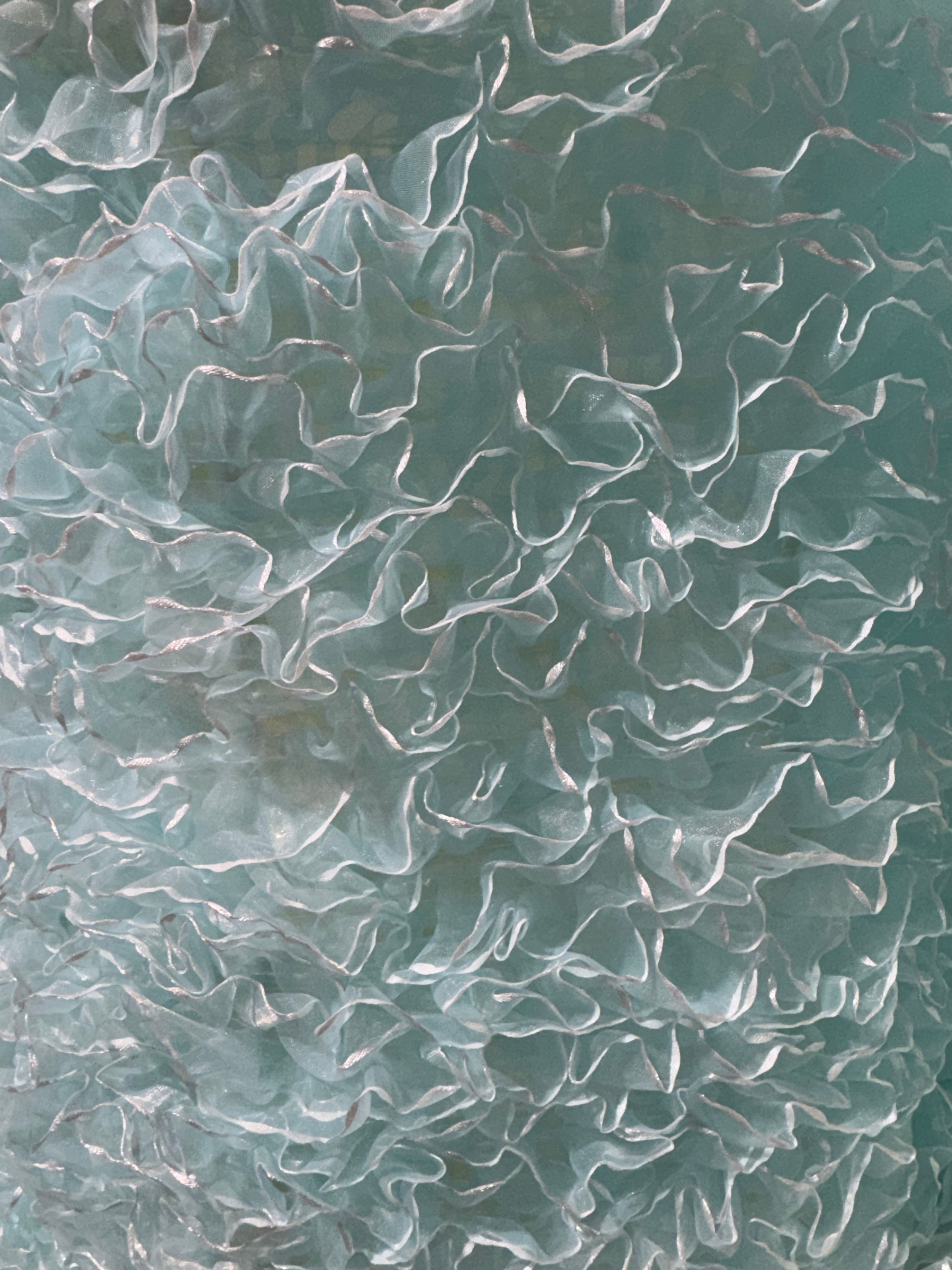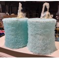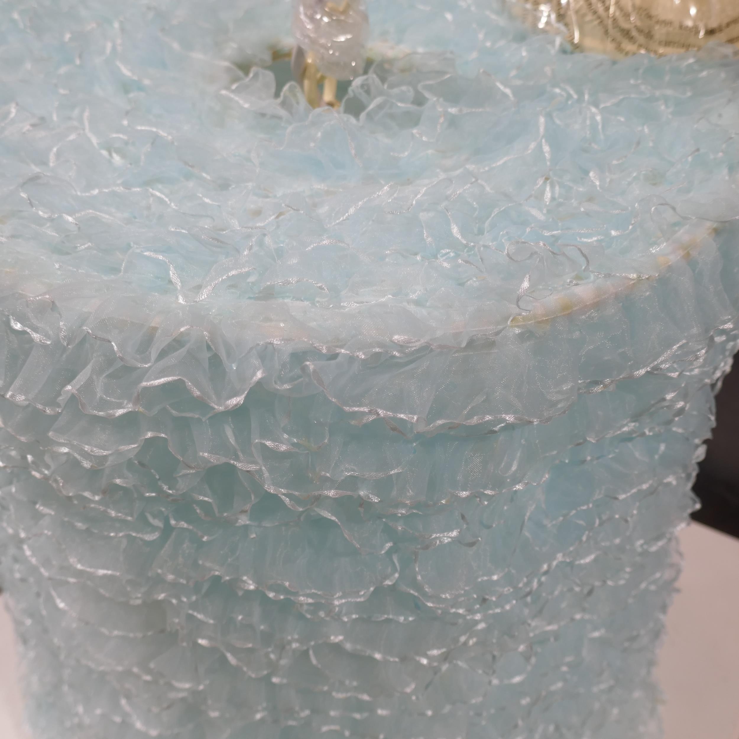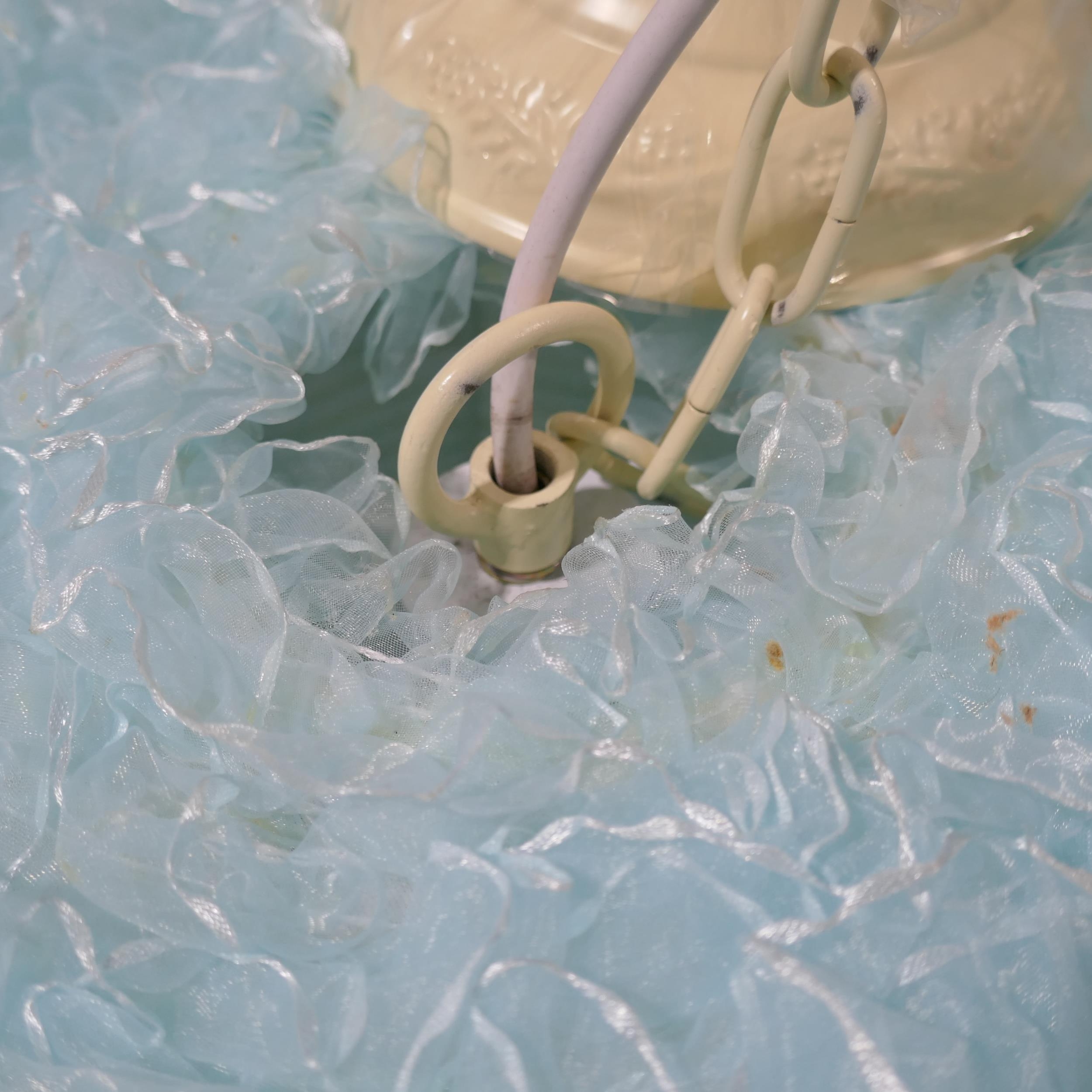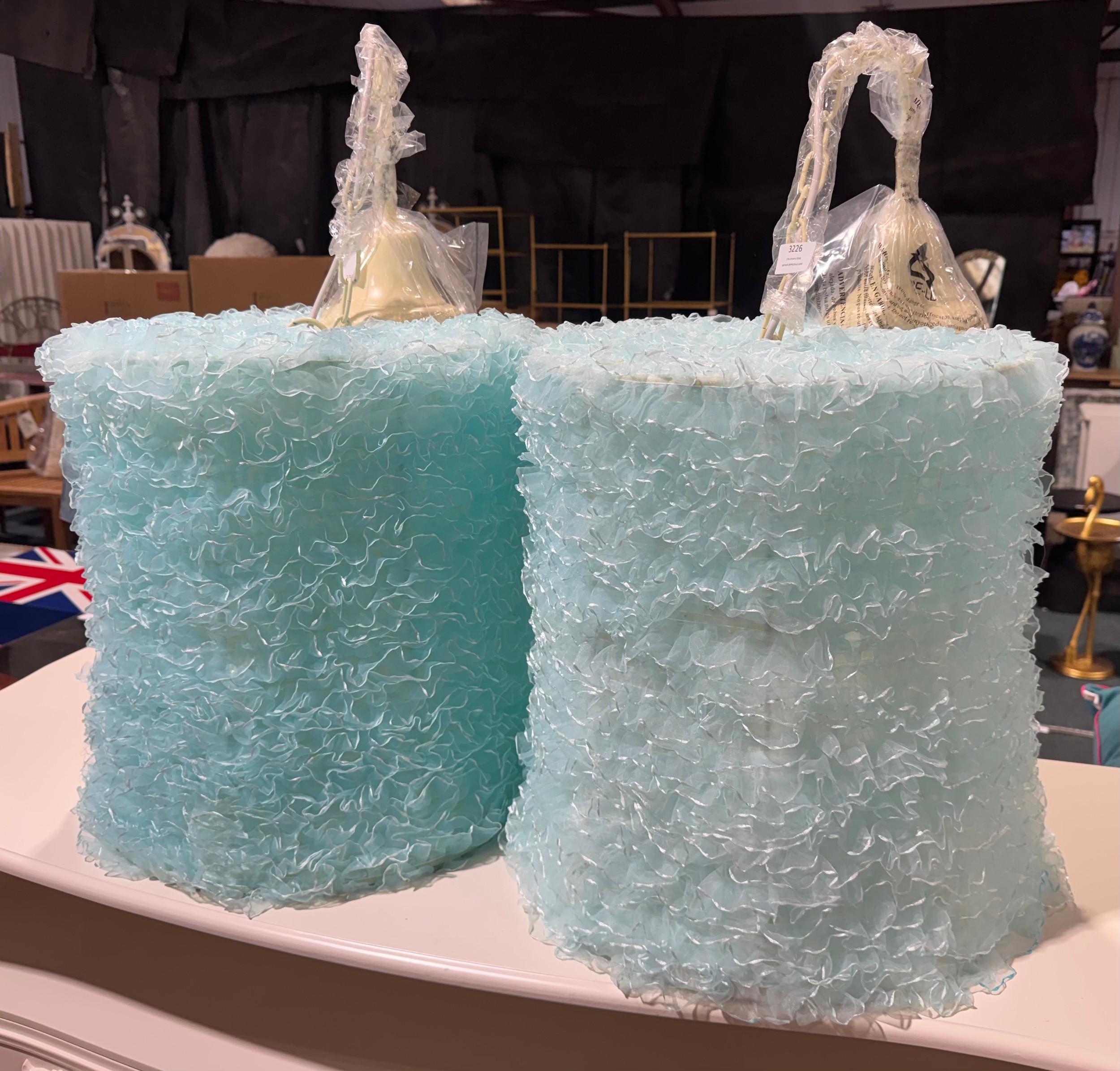 A pair of light blue ceiling pendants