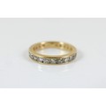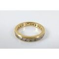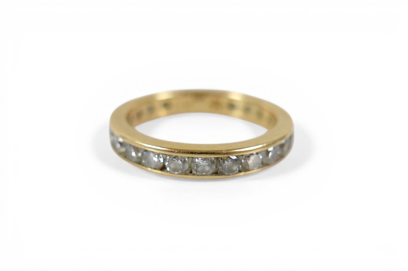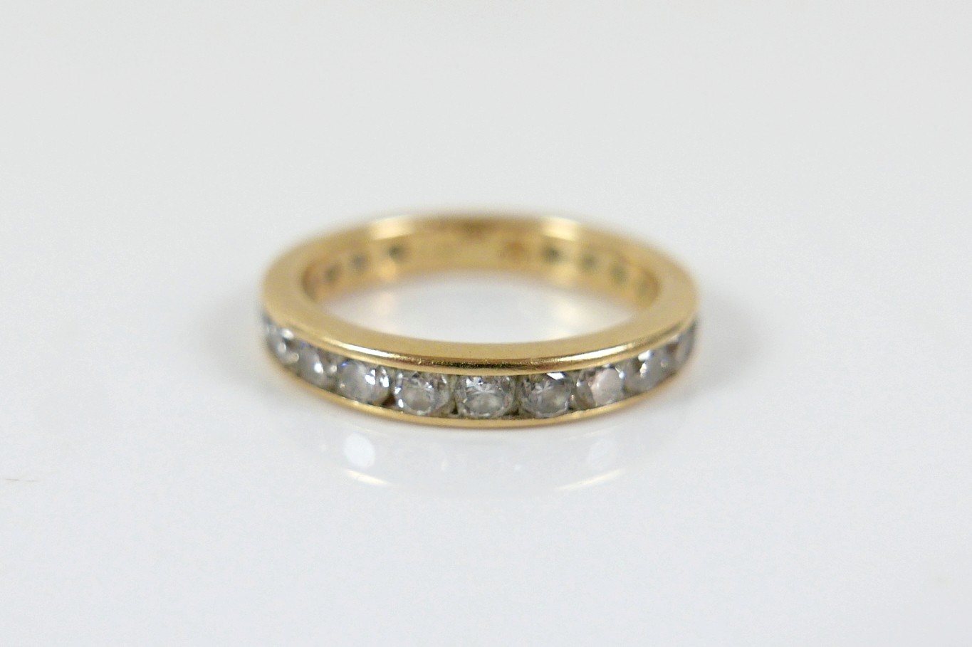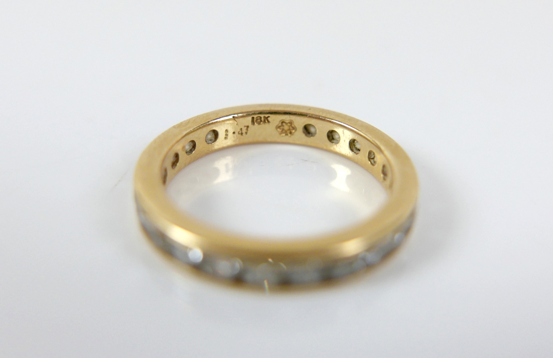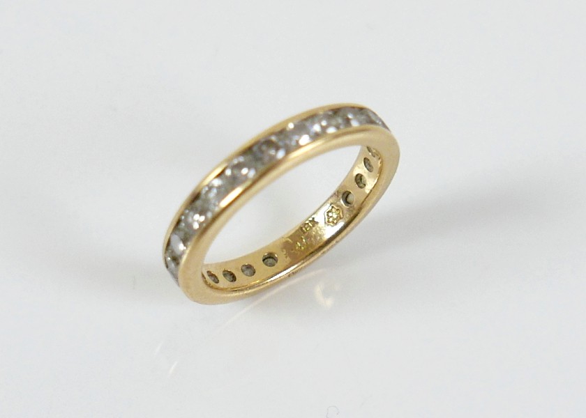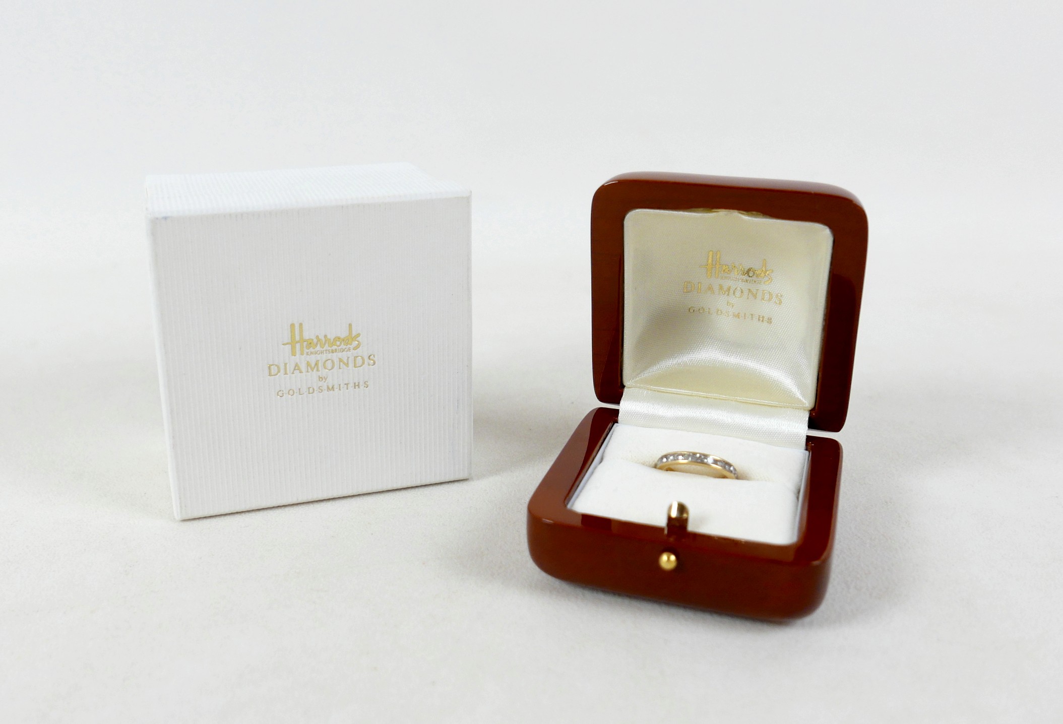 A Harrods 18ct yellow gold eternity ring set with 1.47ct diamonds, size K, 3mm band, 2.9g, with box and outer box.