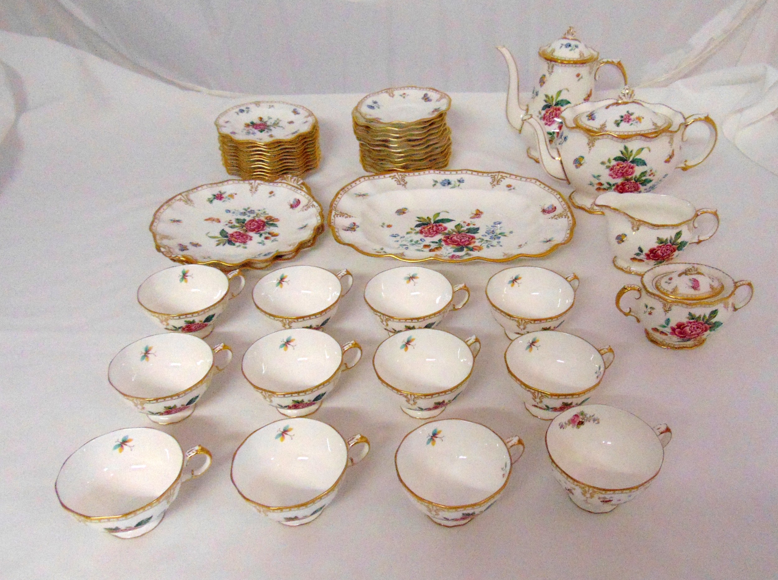 Royal Crown Derby, Derby Days tea service to include teapot, coffee pot, sugar bowl, milk jug, sandwich plate, cake plates, cups and saucers and side plates (43)