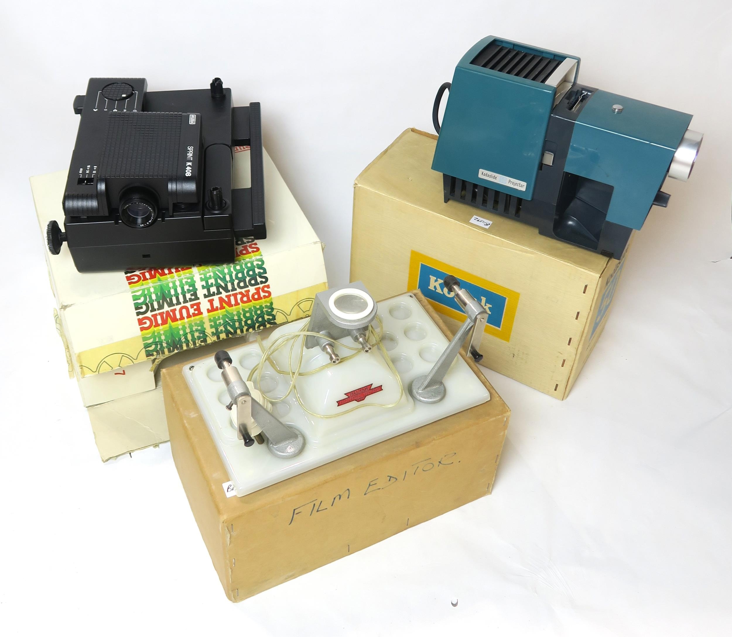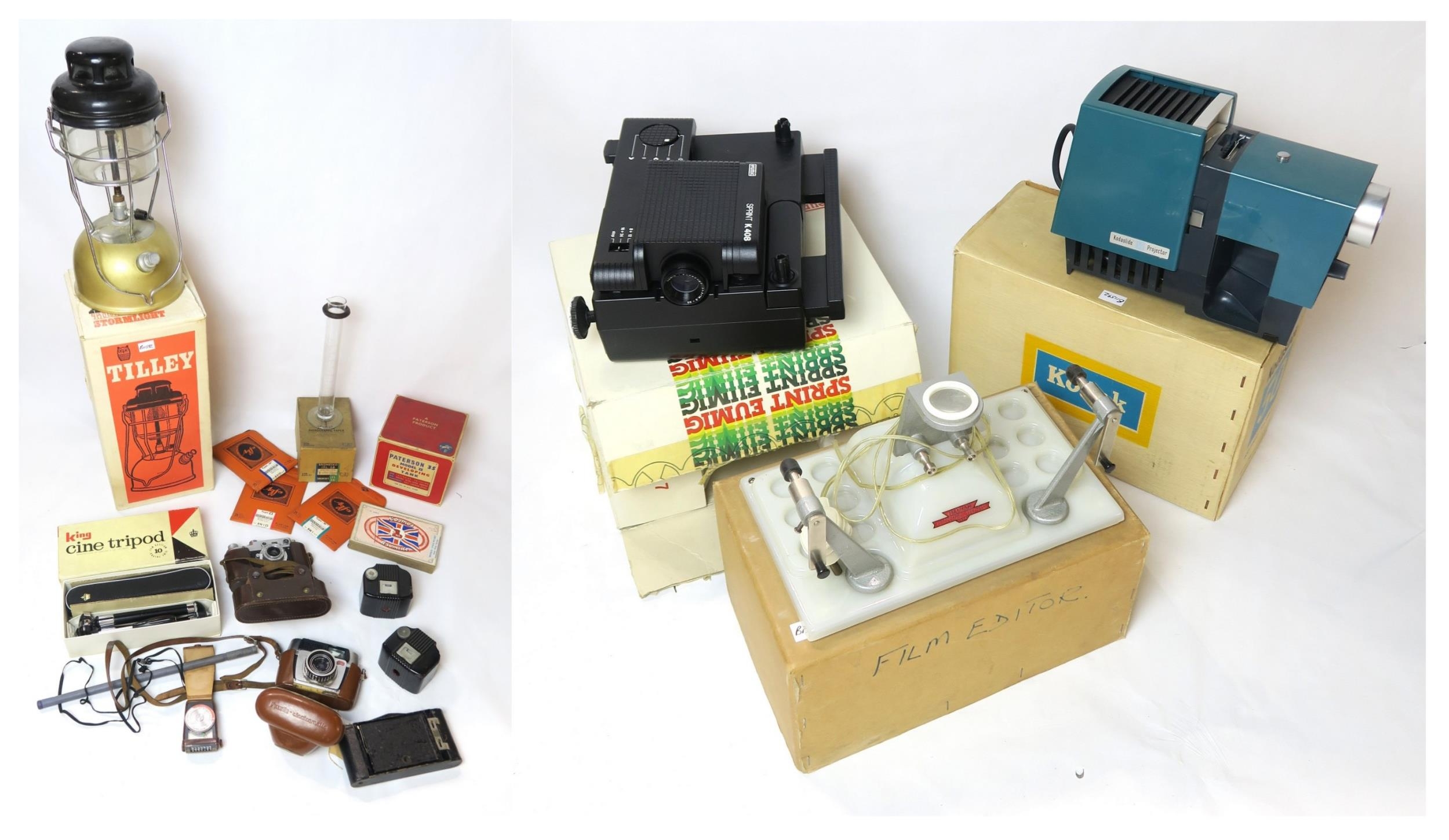 A large quantity of photography and projecting equipment, to include a boxed Eumig Silent Projector Super 8, boxed Kodak Kodaslide 50 projector, various photographic papers, vintage cameras etc.; together with a Tilley storm light