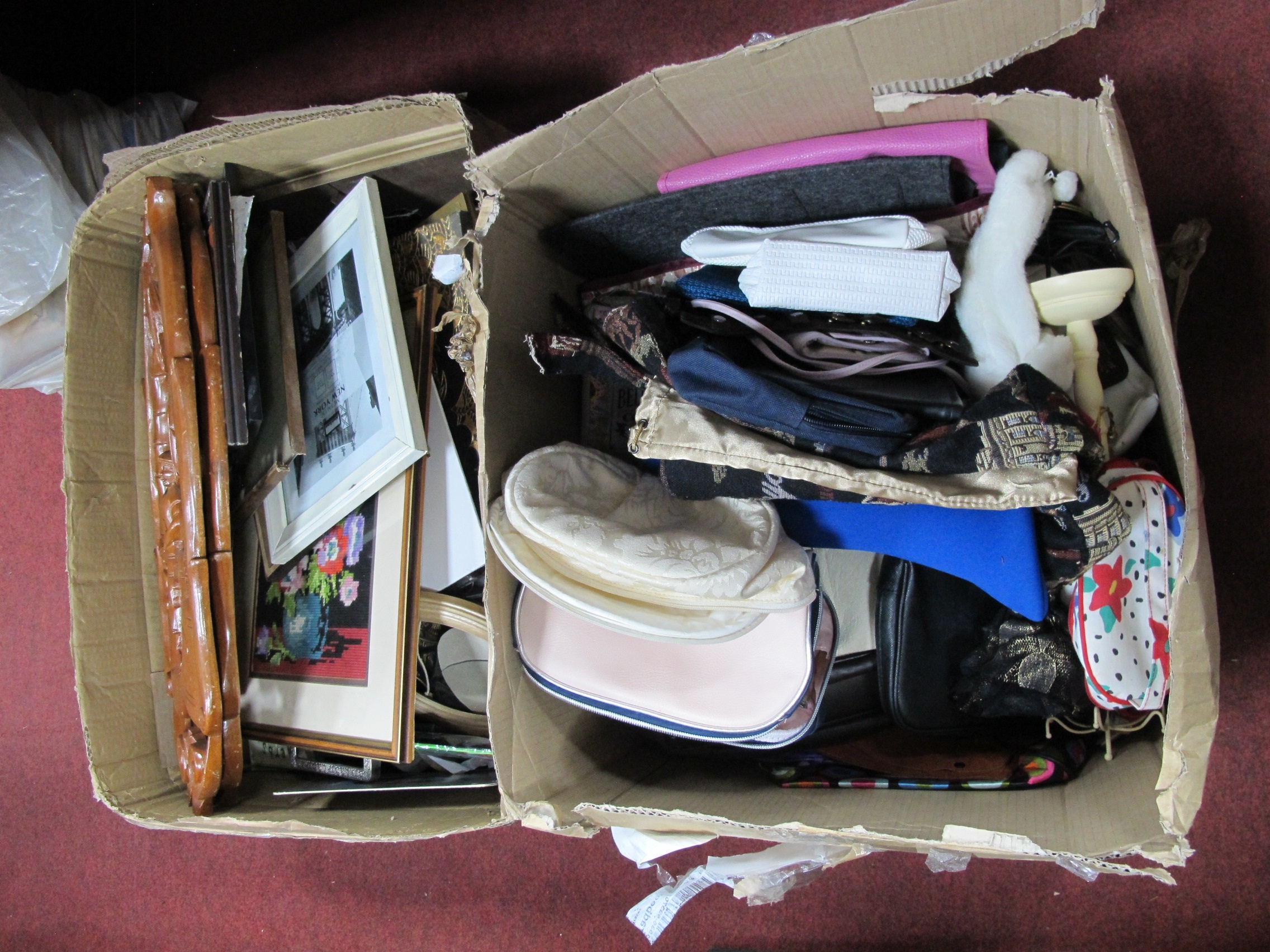 Handbags, picture frames, Oriental wall hangings, etc:- Two Boxes.
