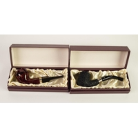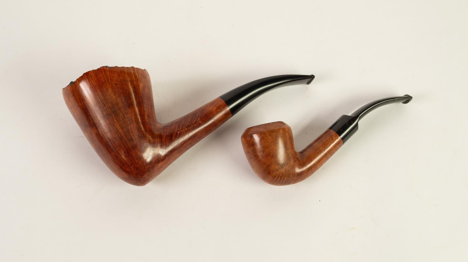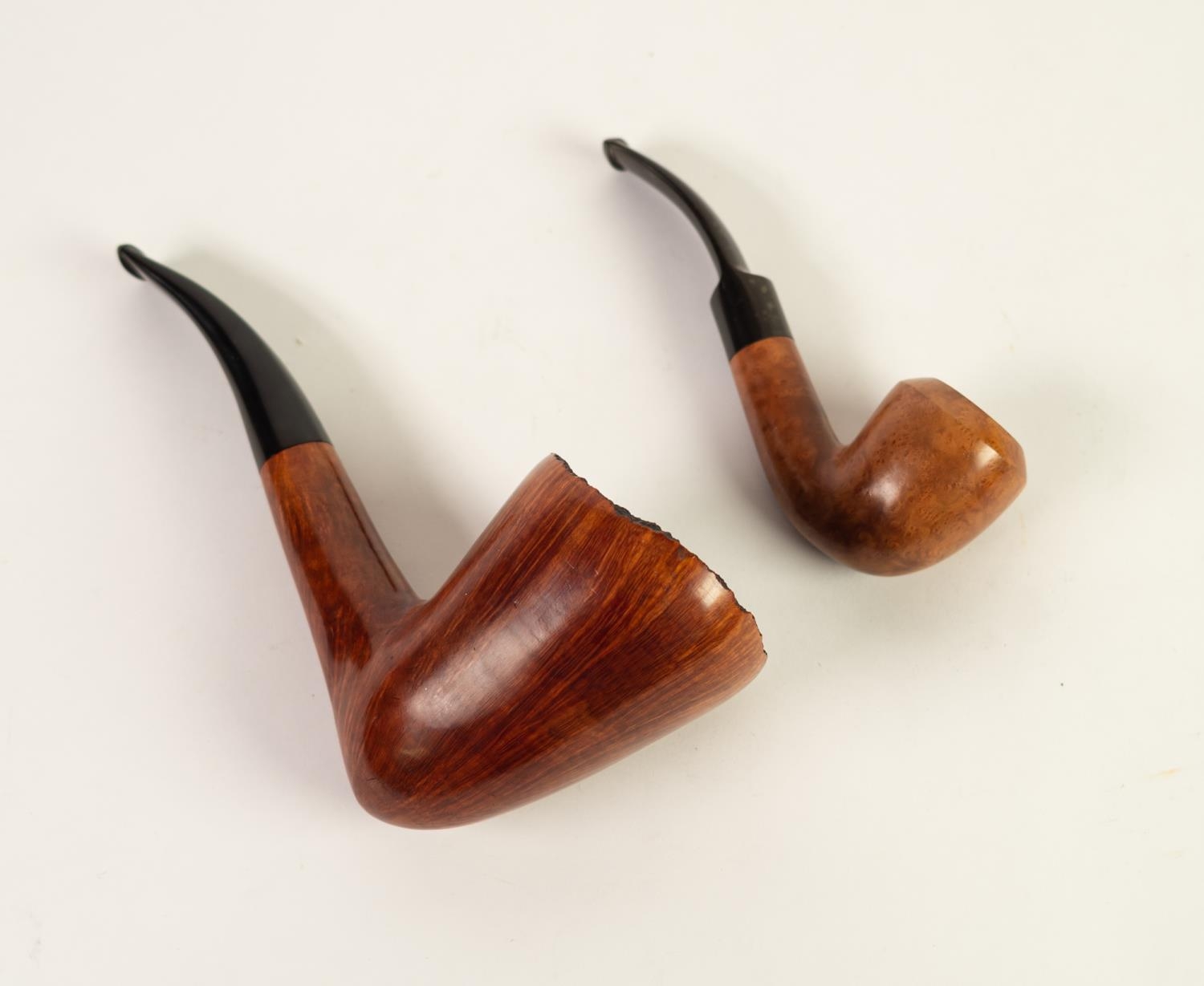 TWO FREDERICK TRANTER BRIAR SMOKING PIPES, one with large/ oversized bowl, the other of traditional form, (2)