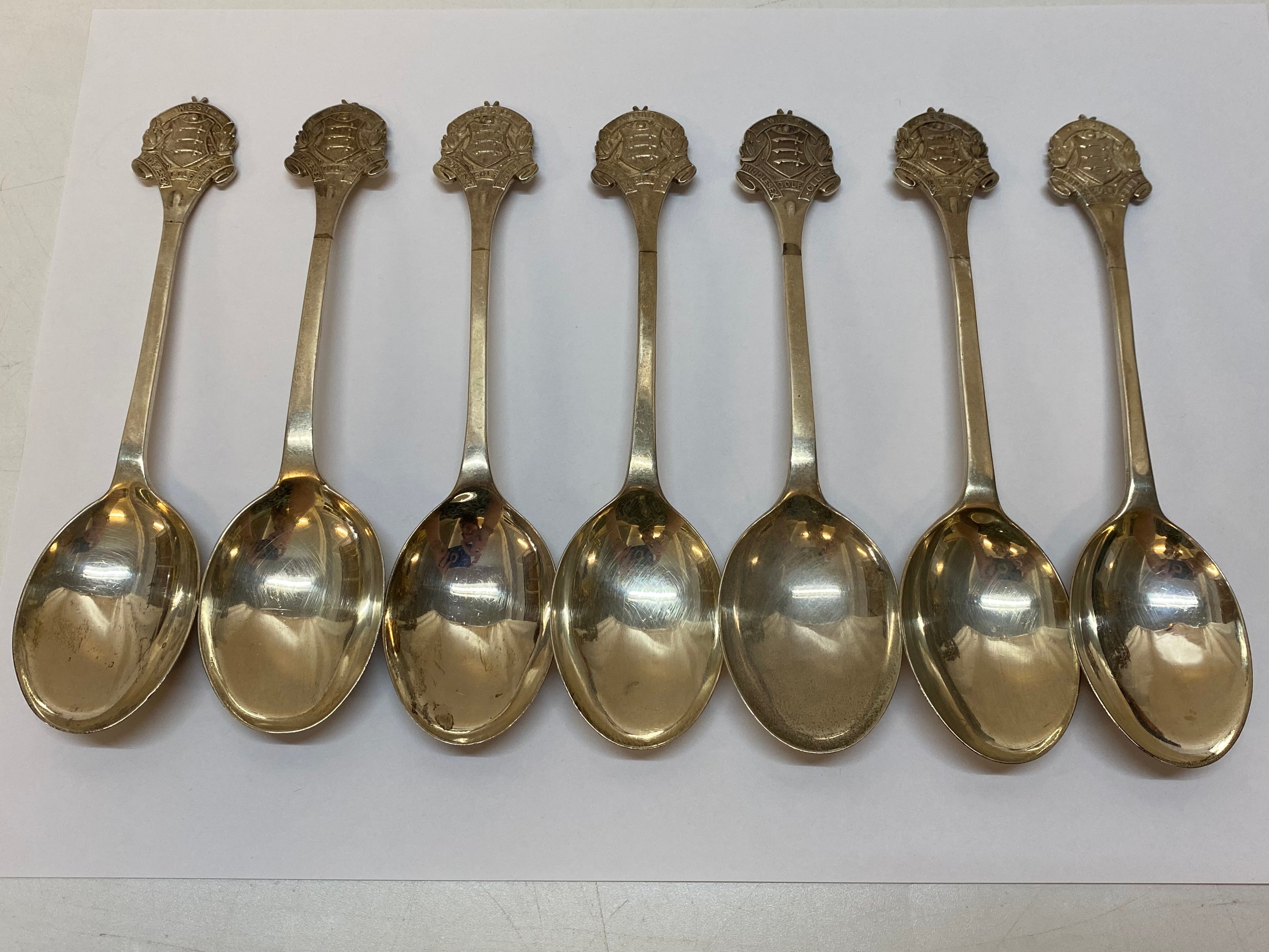 A set of seven silver spoons, the terminals for West Middlesex Golf Club - Birmingham 1931, makers marks for Liberty and Co. Ltd