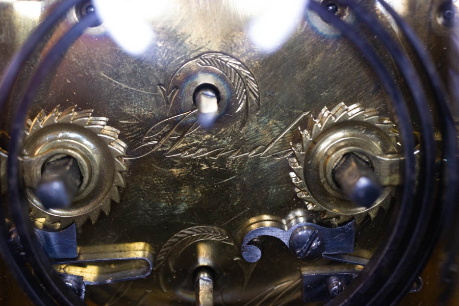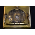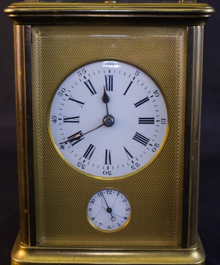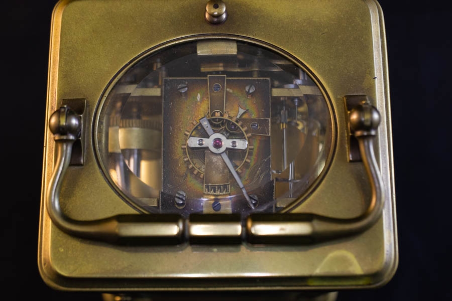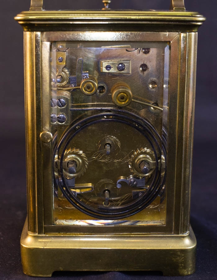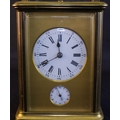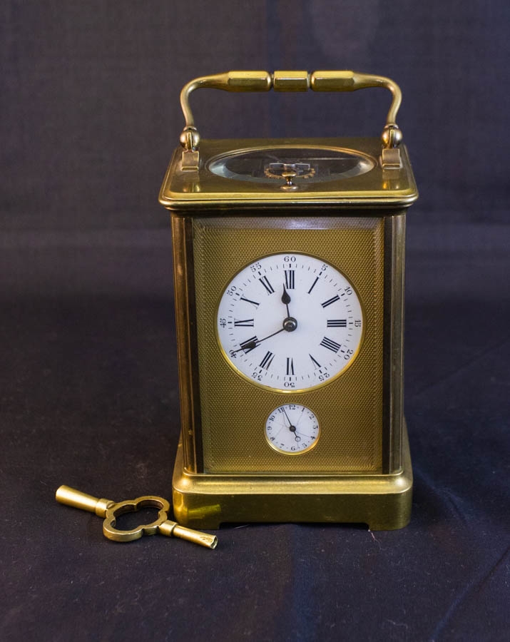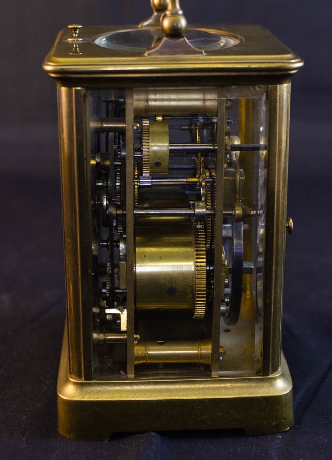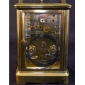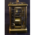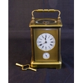 BRASS STRIKING CARRIAGE CLOCK + KEY. 9CM X 8CM X 17CM HIGH