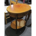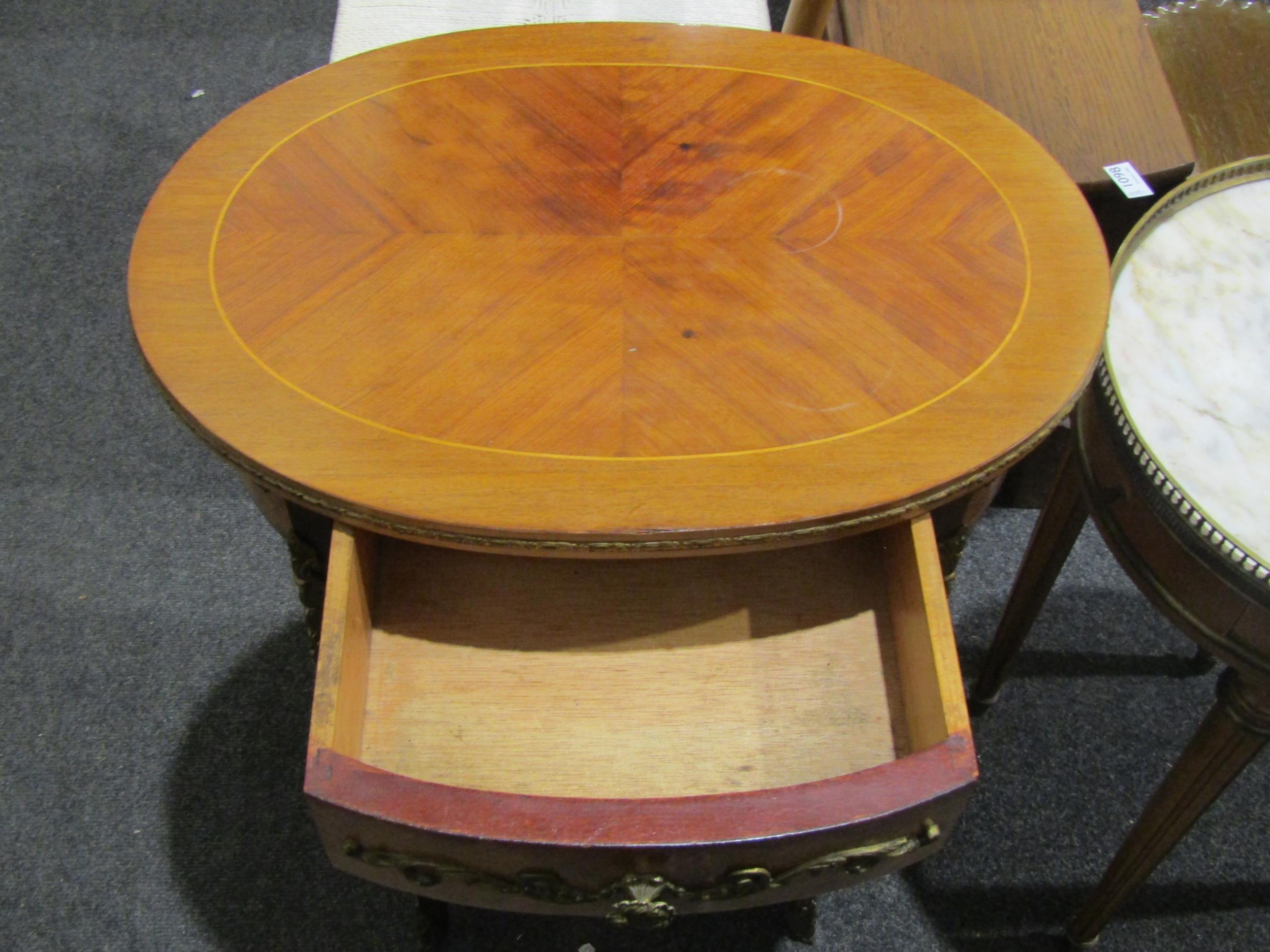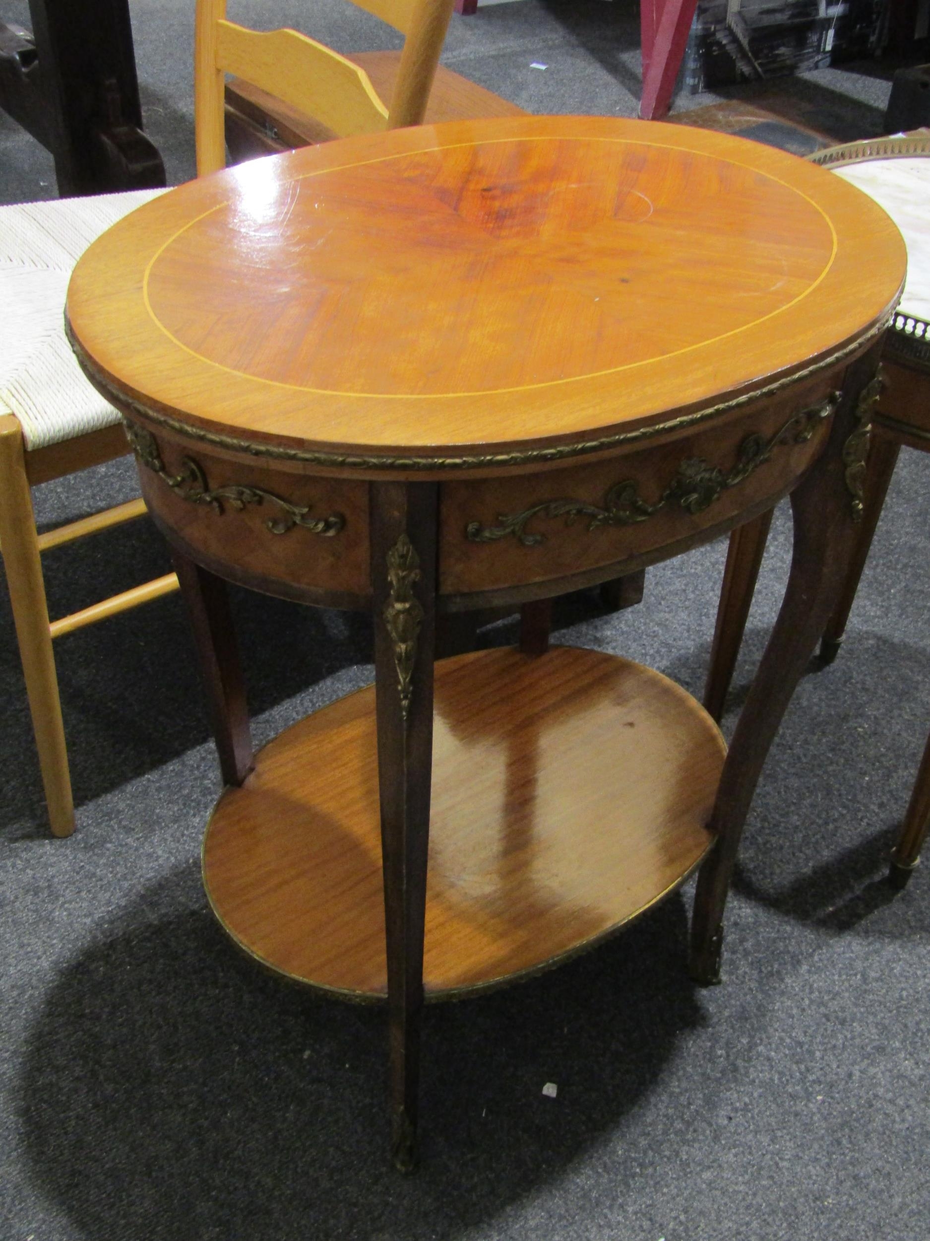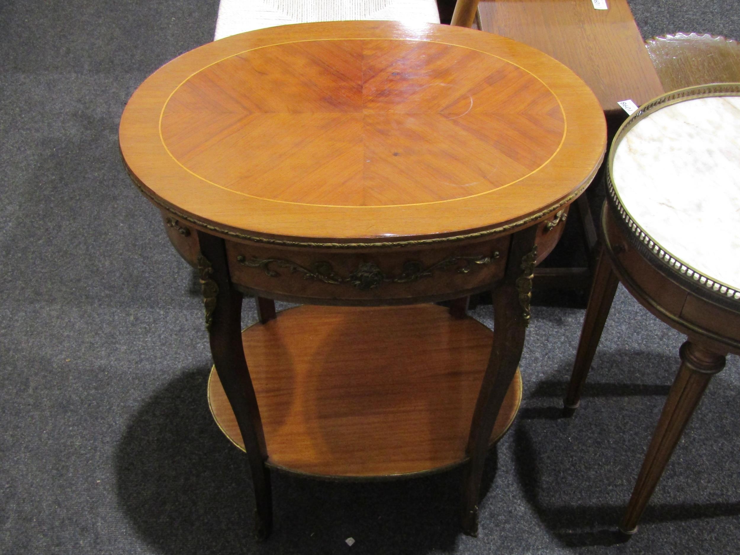 A French style walnut occasional table, oval top with single drawer, over an under-tier, 69cm tall x 54cm long x 40cm wide