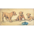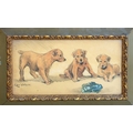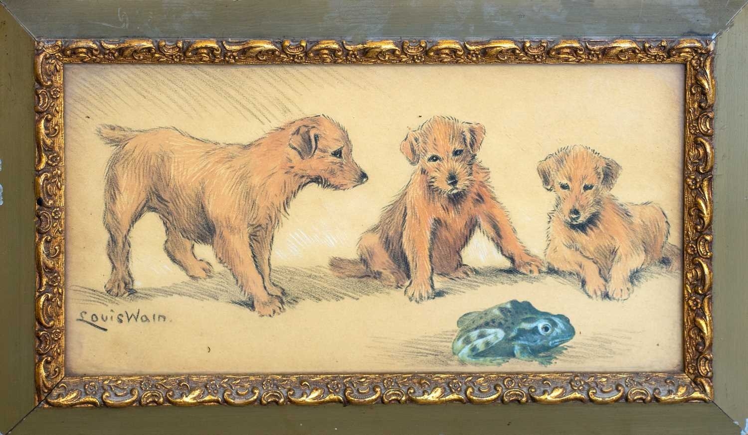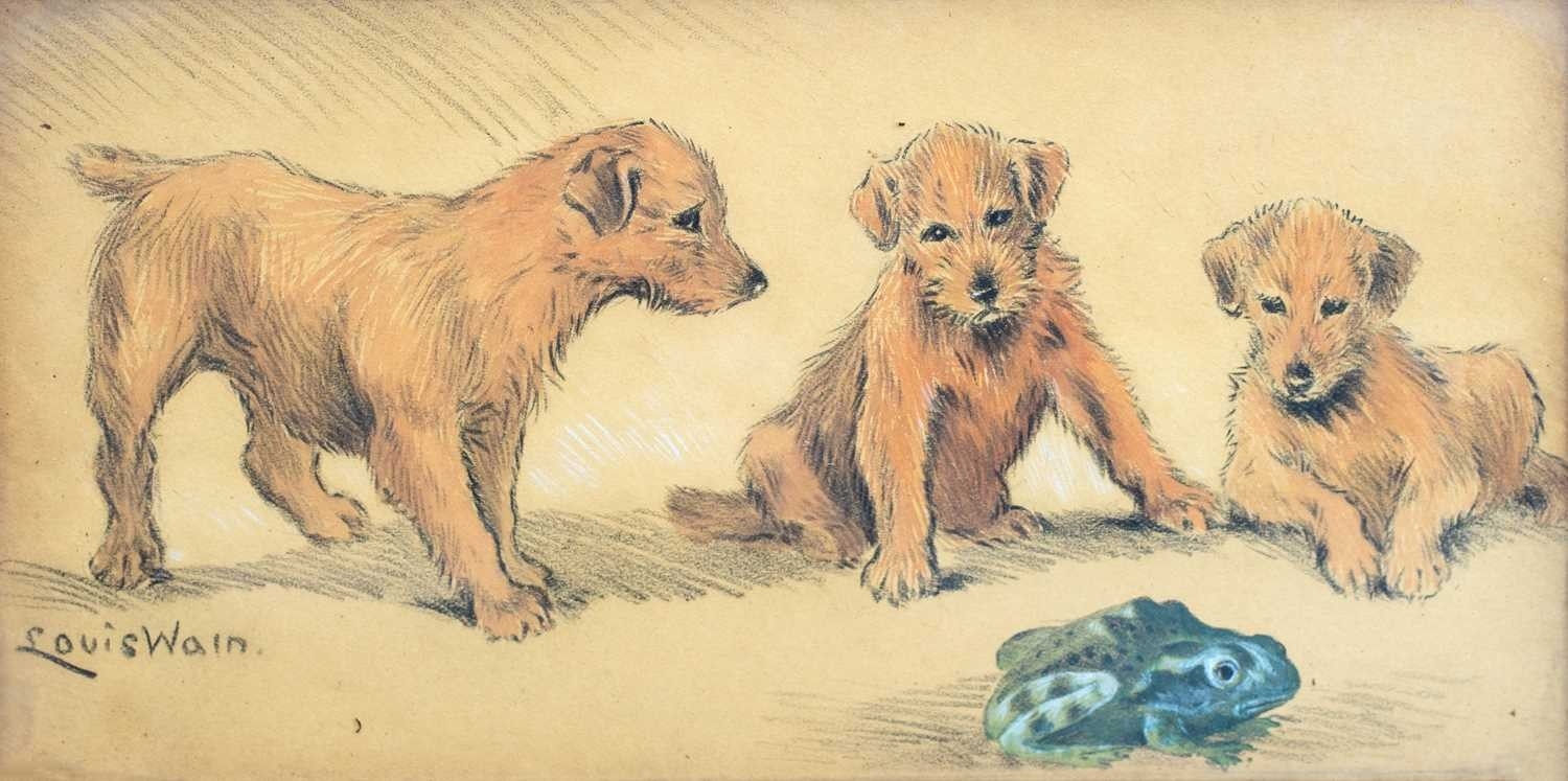 Louis WAIN (1860-1939) Three Puppies with Frog Mixed media on card, signed, 11.5 x 23cm, 17 x 28cm framed.