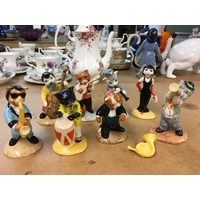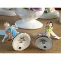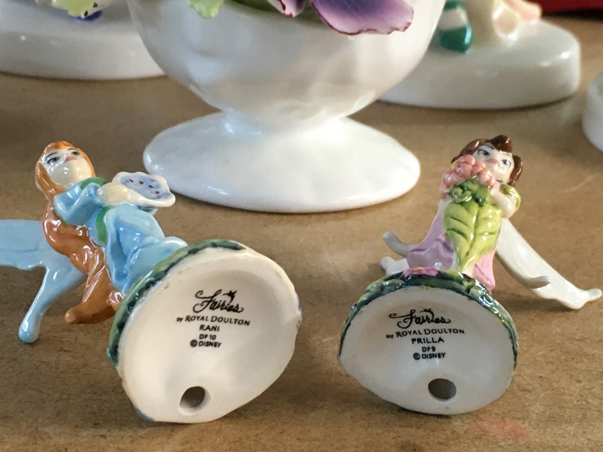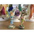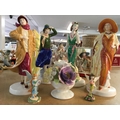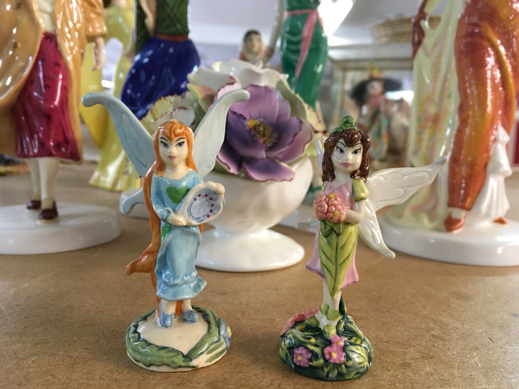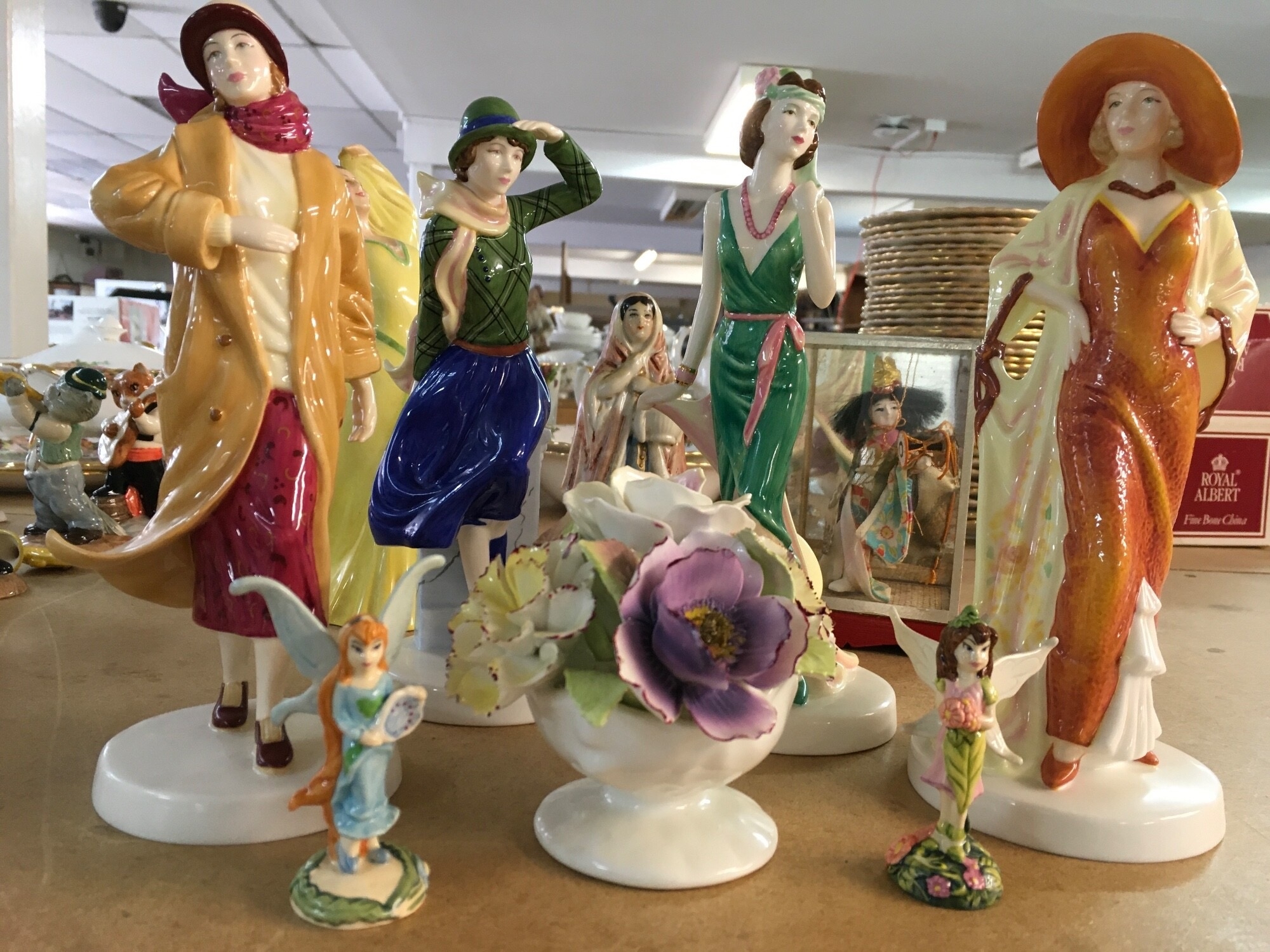 Four Royal Doulton lady figures in Art Deco style dress, together with other lady figures and two miniature Royal Doulton Fairies figures
